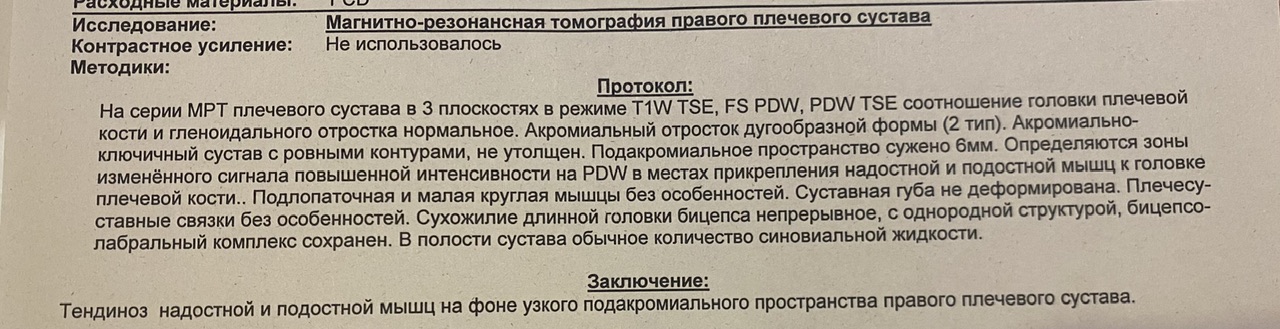 Мрт:Тендиноз радостной и полосной мышц на фоне узкого подакромиального пространства правого плечевого сустава.