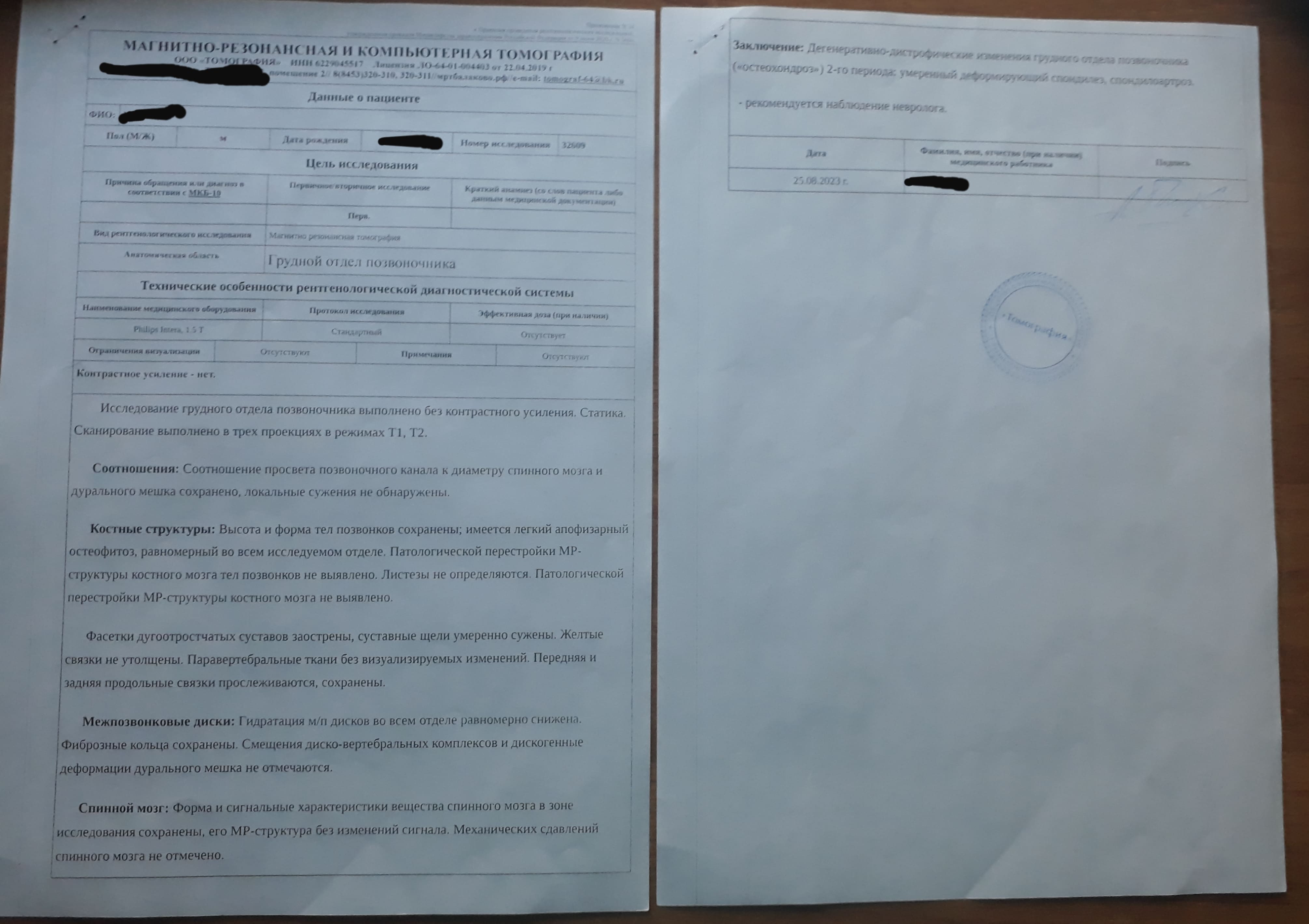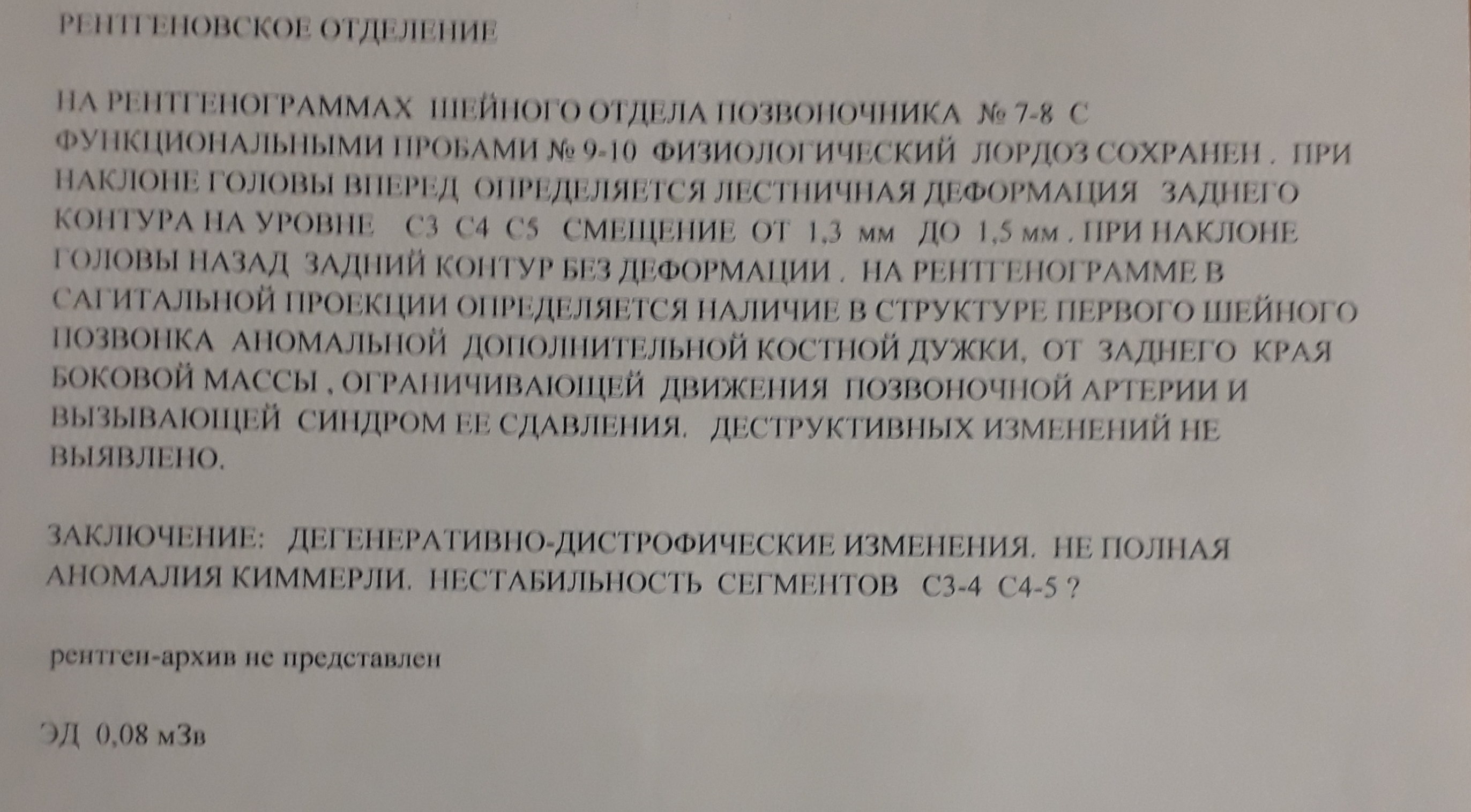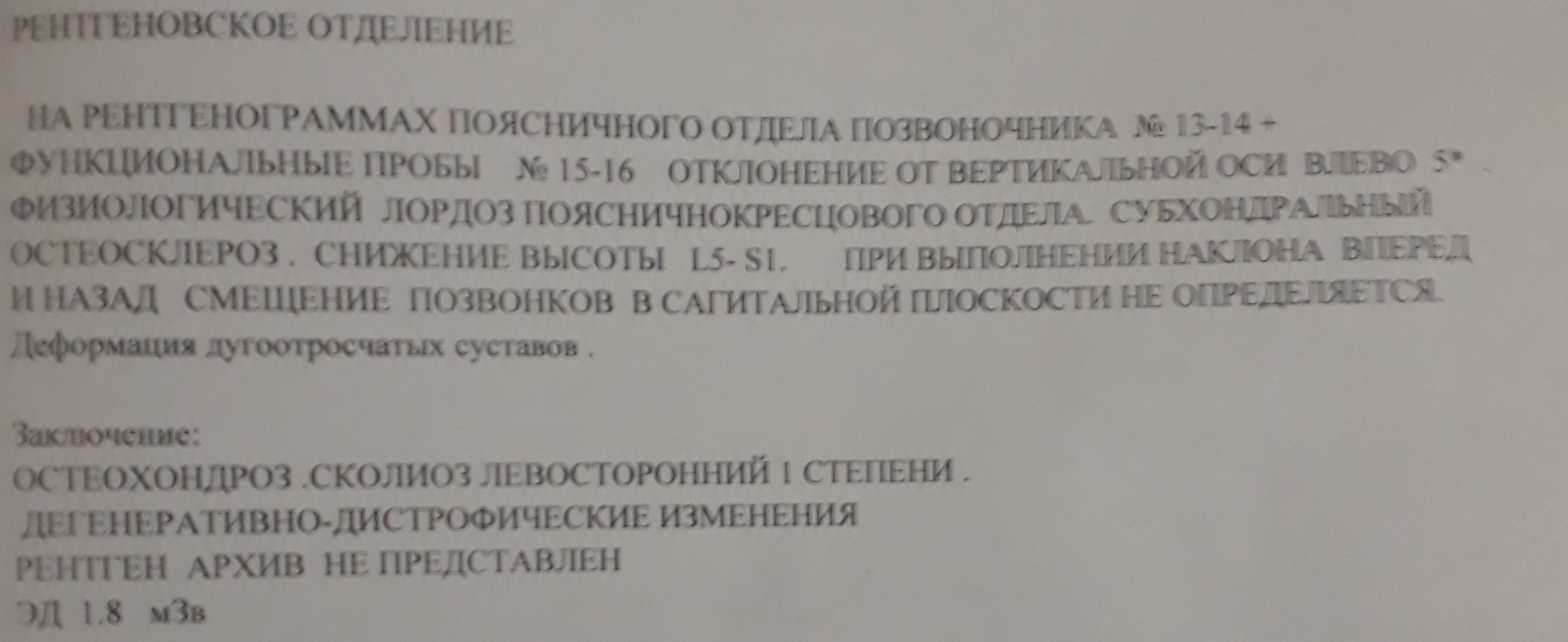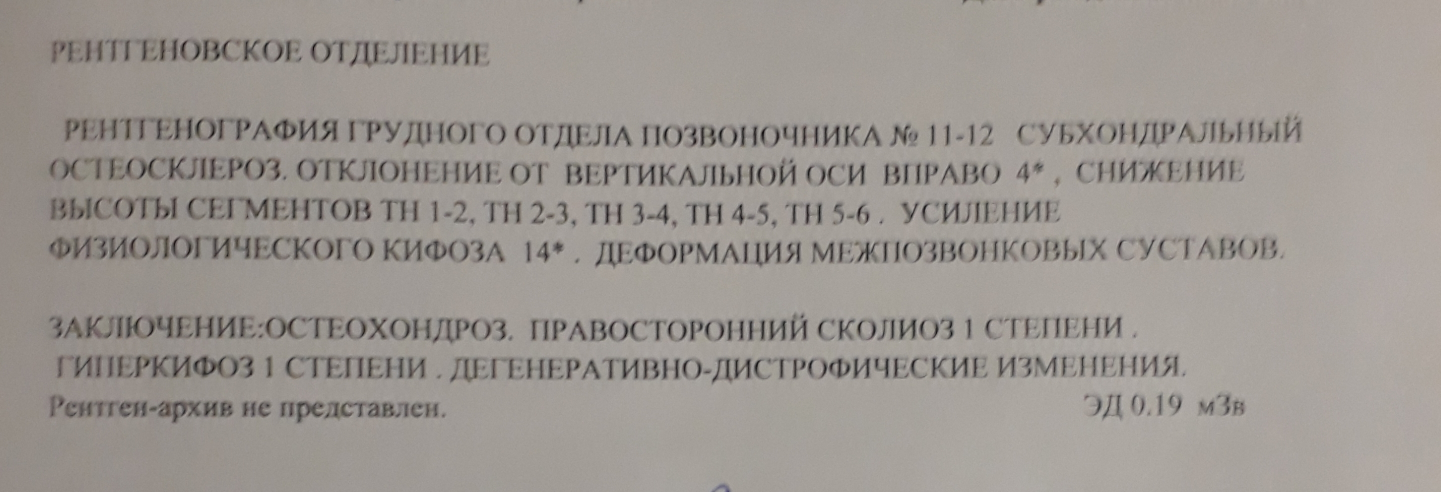 На данный момент не ясны заключения по рентгену, так как рентгенолог написал "без видимой патологии", что вызывает вопросы, также как и кифоз: в одном осмотре написан отрицательный, в другом не написано положительный или отрицательный, а также в поликлинике не хотят приобщить МРТ, так как проходился в частной клинике. С этими моментами в данный момент разбираюсь.