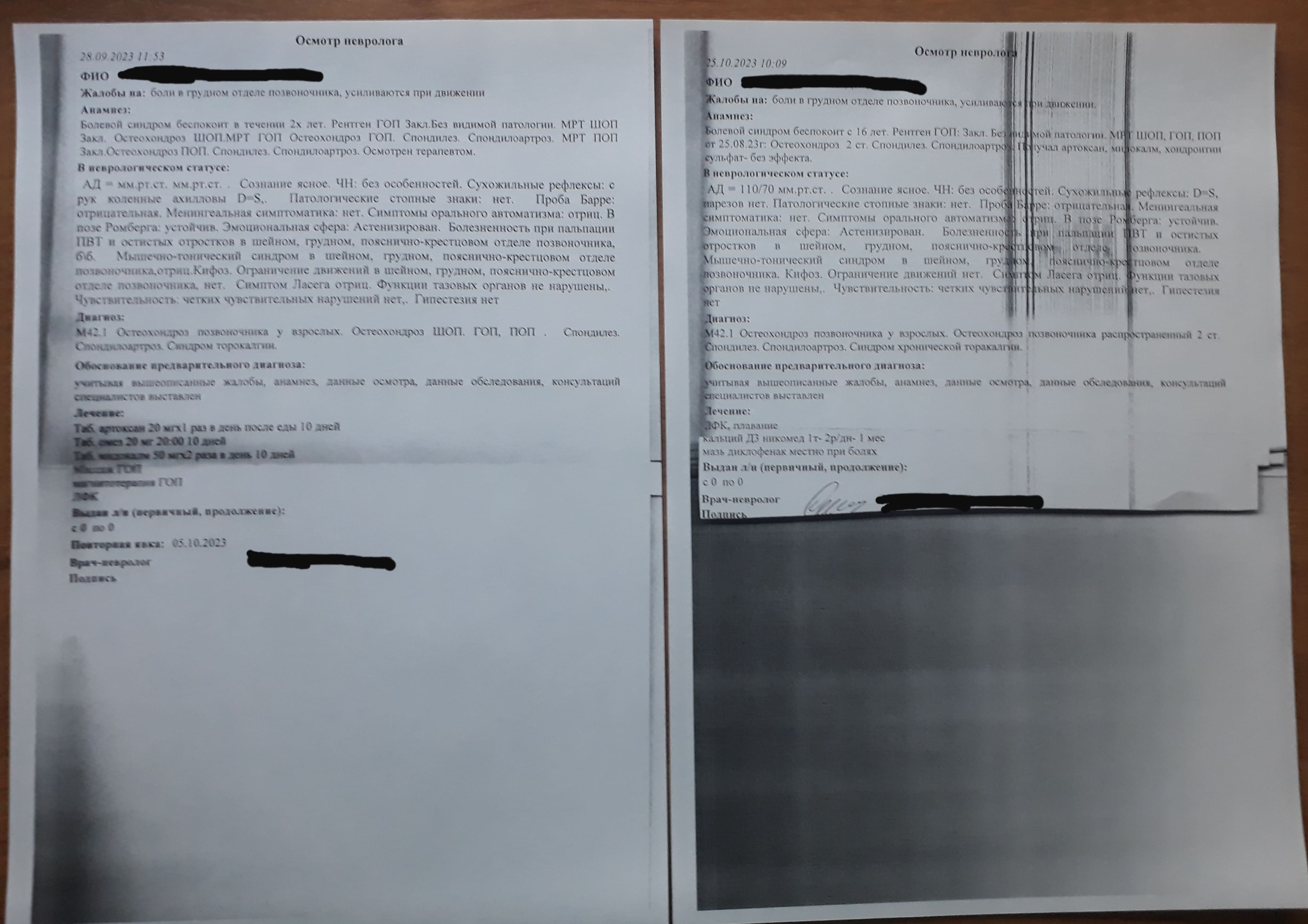 Обращался четыре раза по поводу болей в спине (через 15 минут ходьбы и даже стоя на месте начинаются боли в грудном отделе) в местную поликлинику: два раза к терапевту и два раза к неврологу, назначили лечение в виде массажа и таблеток, обратился снова и сообщил, что не помогло, дальше лечить отказываются, сказали, что ничего уже не сделать, только лечебная физкультура и лечащий врач-терапевт поставил диагноз основного заболевания: остеохондроз позвоночника распространенный 2 степени, спондилез, спондилоартроз, синдром хронической торакалгии.