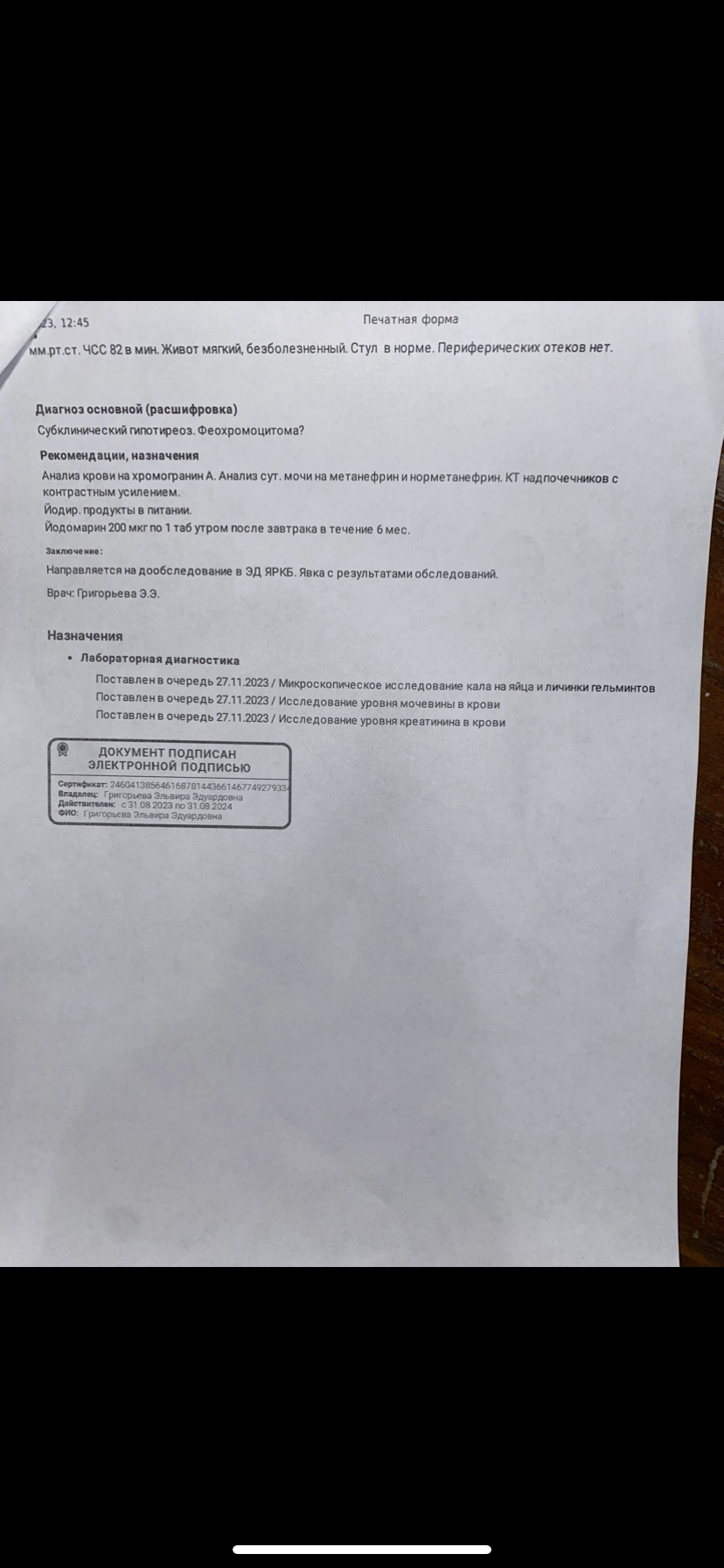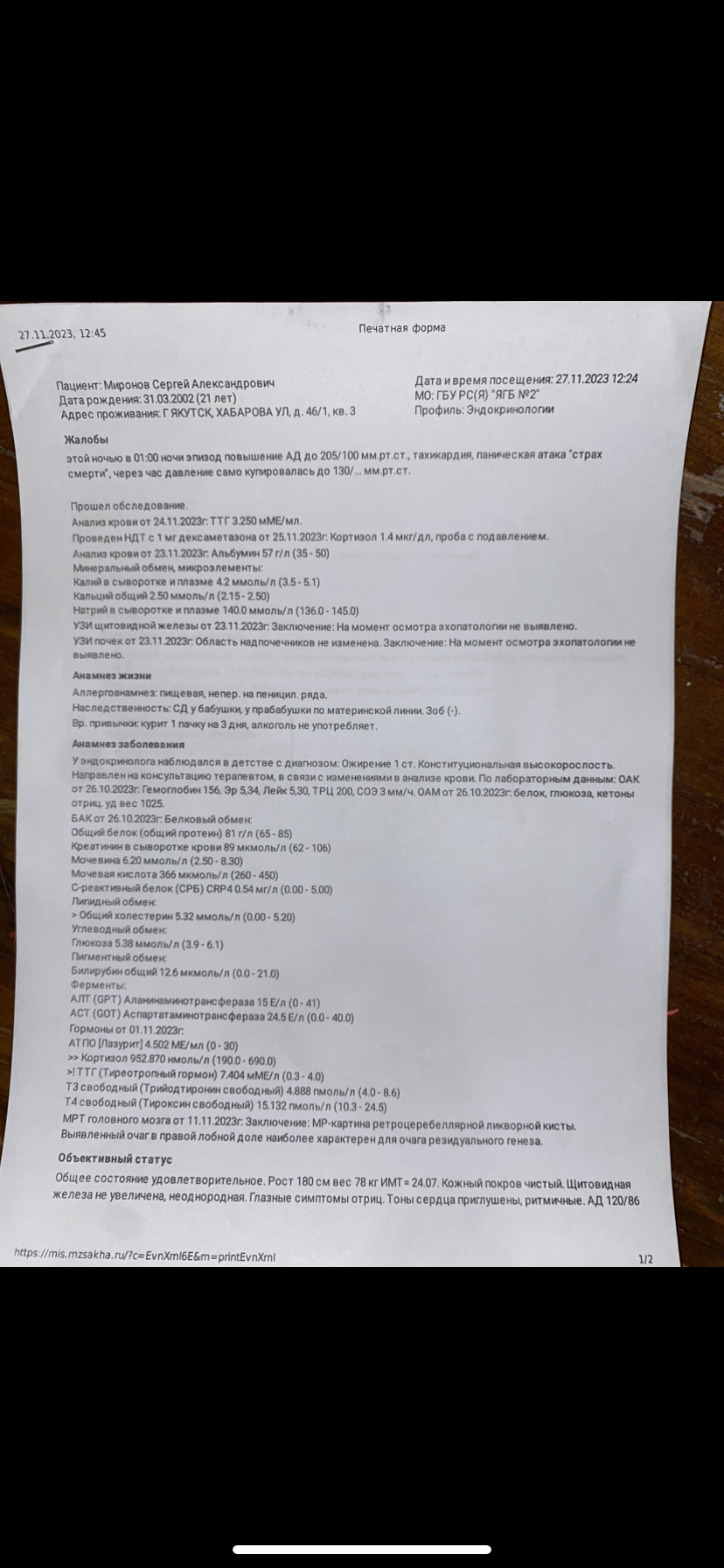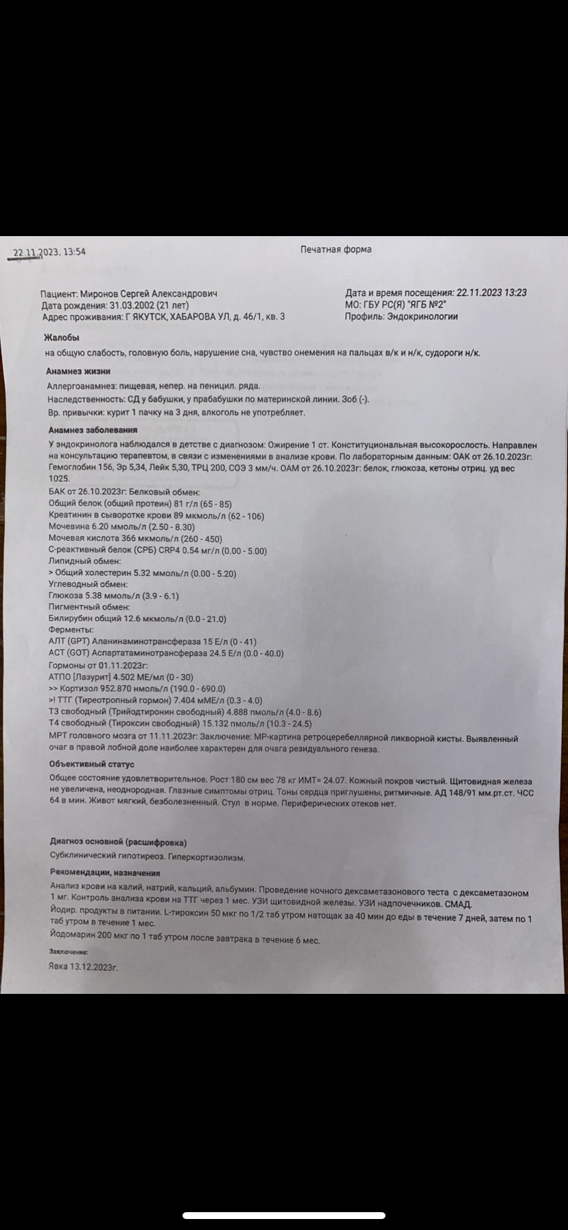 Сейчас прохожу эндокринолога, был поставлен диагноз «Субклинический гипотериоз. Гиперкордизолизм. Позже сдал анализы на ттг, кордизол, все в норме. После чего врач назначил на обследование в стационаре которое я буду проходить позже ибо надо сдать анализы.