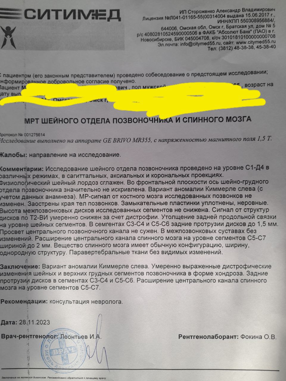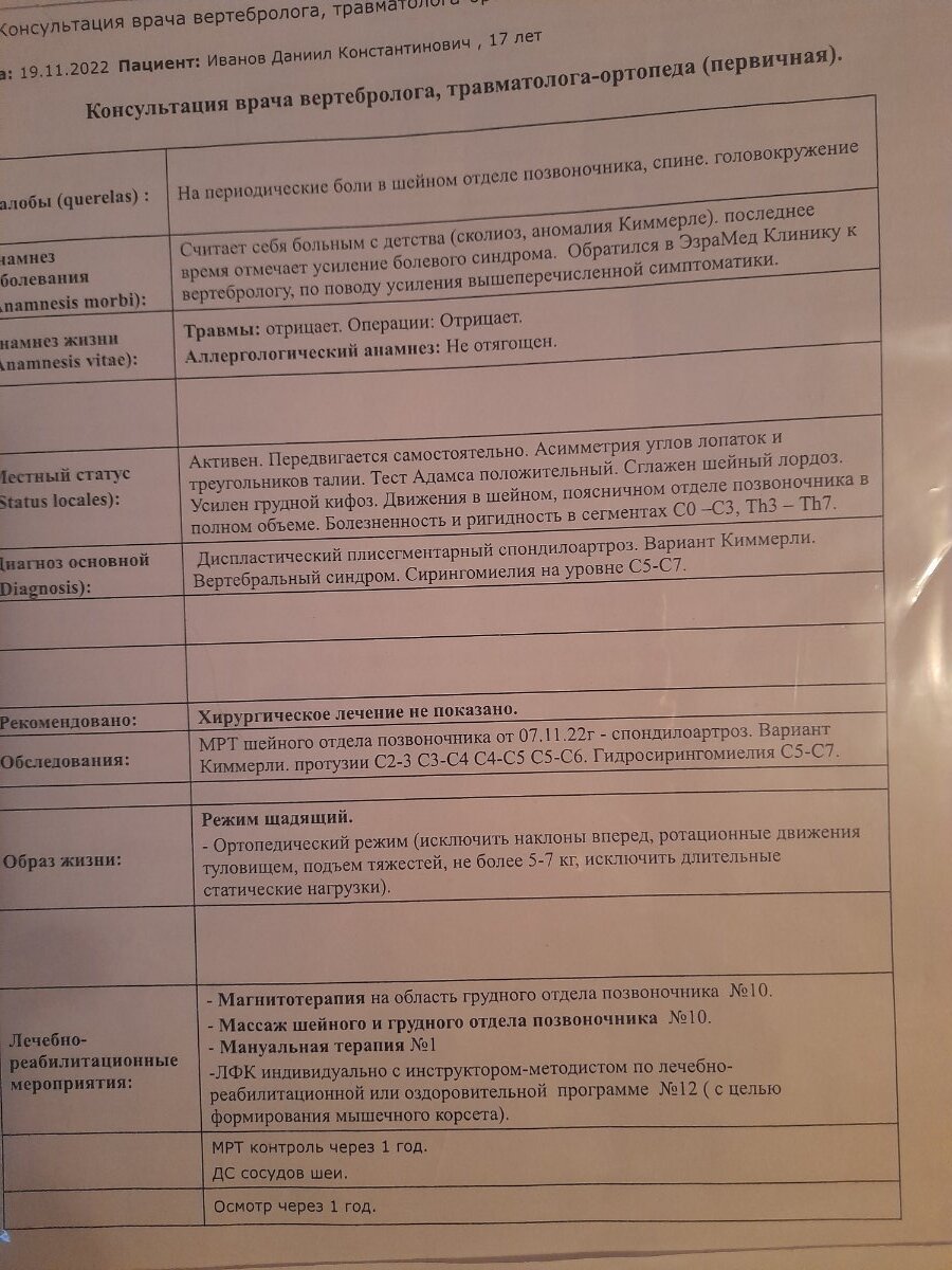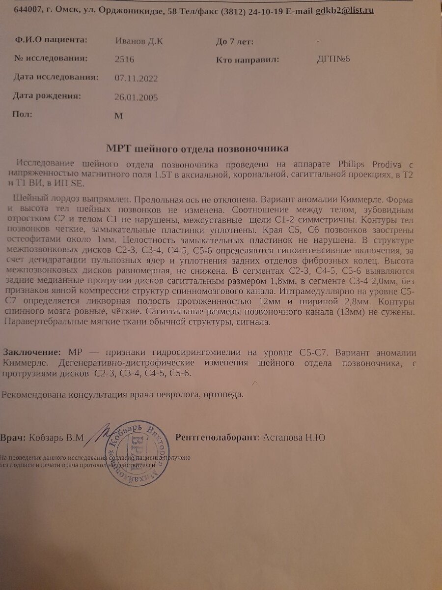Здравствуйте, в 2022 году вертебролог выписал заключение и поставил сирингомиелию по результатам МРТ(были жалобы на боли в шее), сказал через год наблюдаться. Прошел год, сходил к вертебрологу и он также поставил сирингомиелию, но только с рецедивирующим болевым синдромом(жалоб впринципе стало больше). Завтра иду на прием к неврологу.