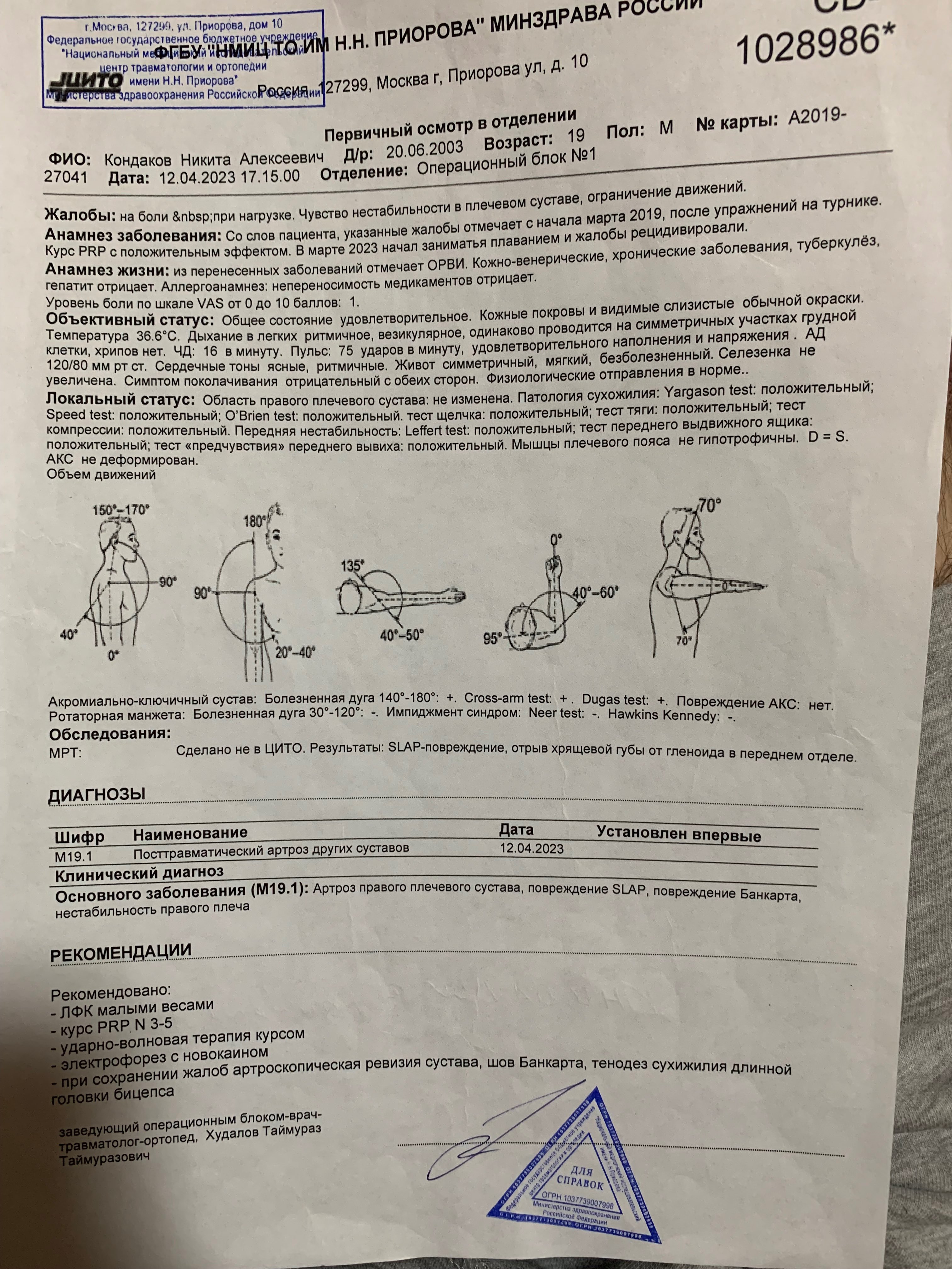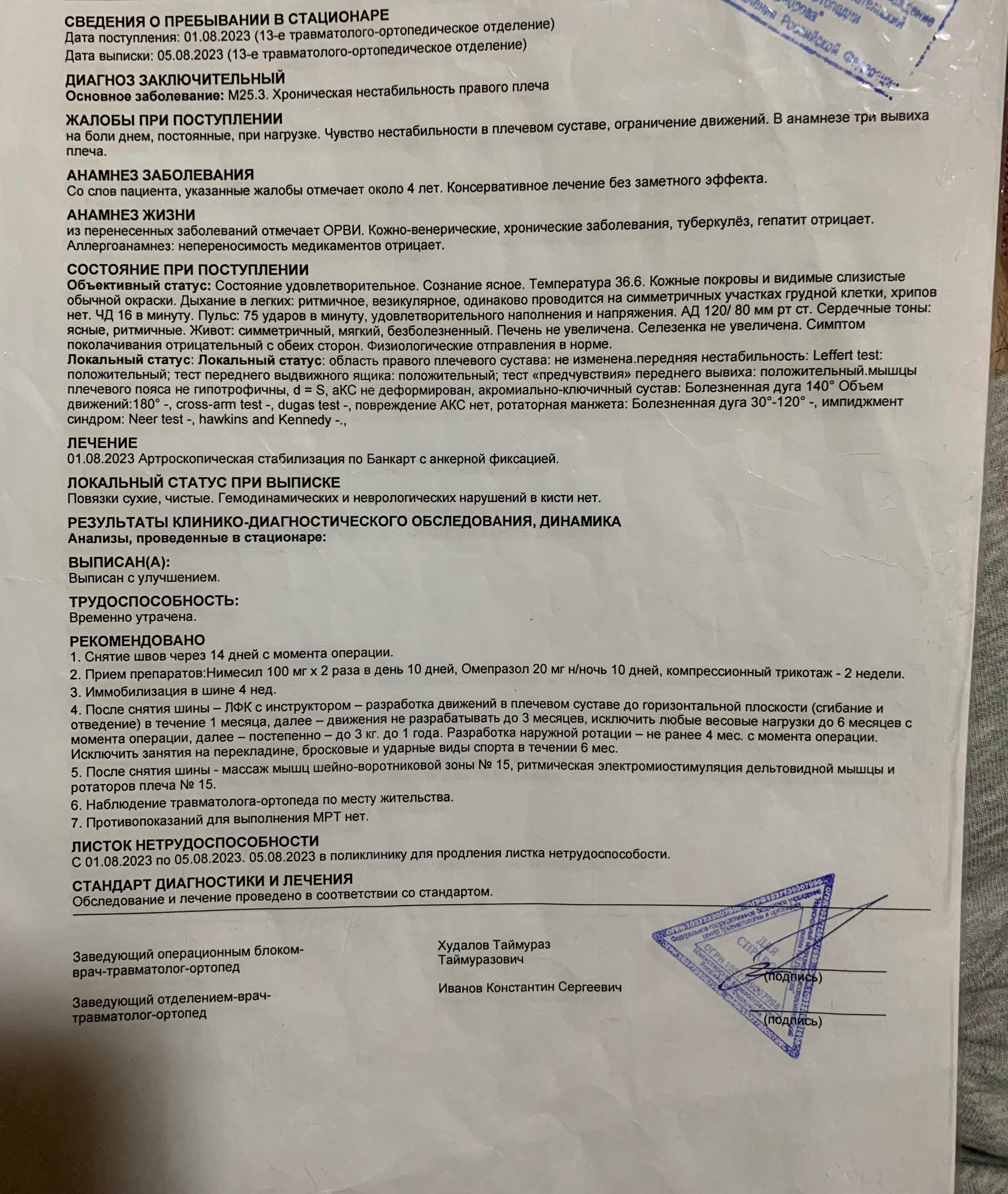 nikita0618 писал(а):Здравствуйте, была операция в ЦИТО по Банкарт с анкерной фиксацией, также до этого был диагностирован посттравматический артроз, повреждение Банкарта, повреждение SLAP, нестабильность правого плеча. Сейчас после выписки из ЦИТО указан диагноз Хроническая нестабильность правого плеча. На какую категорию могу расчитывать?