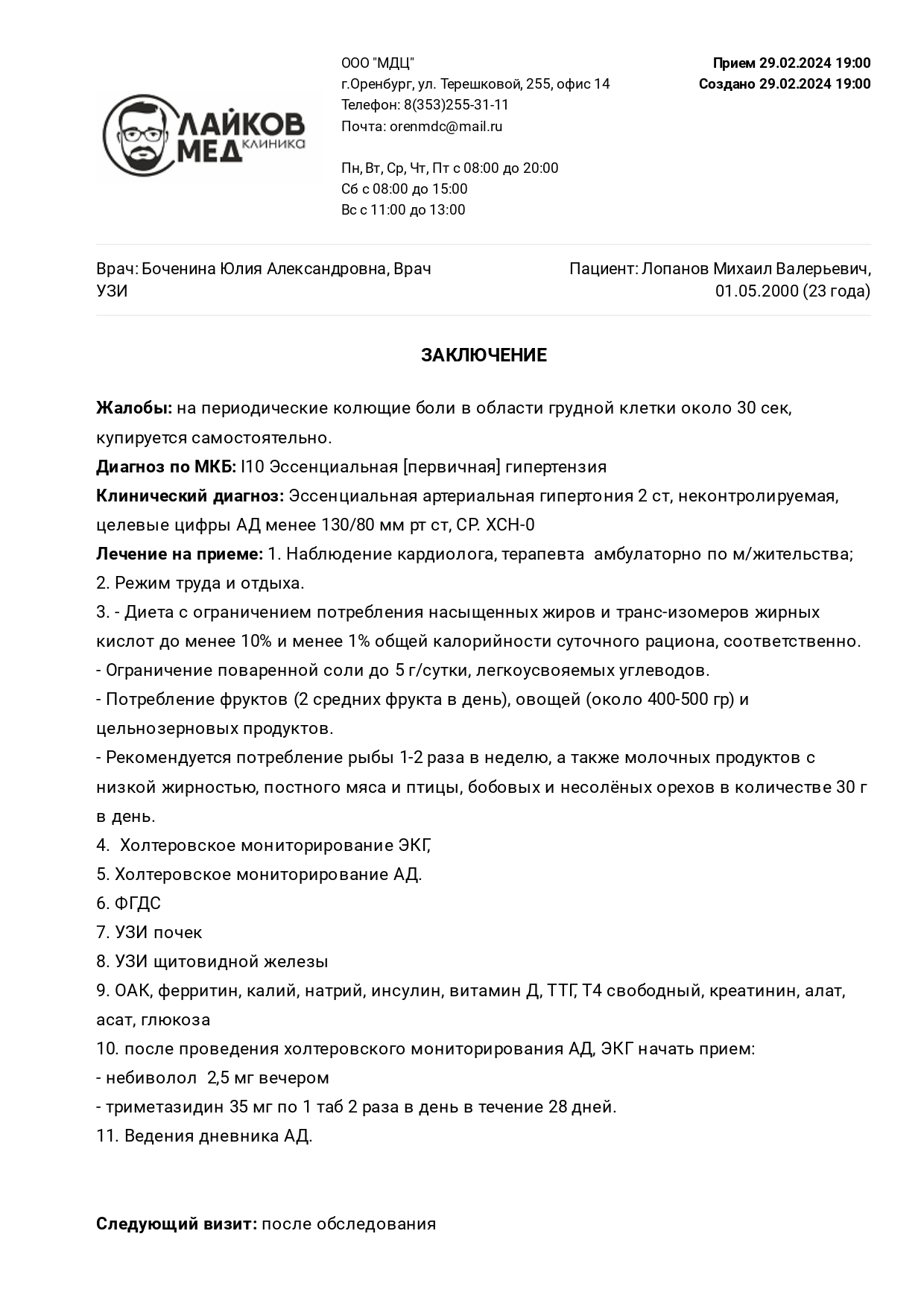 2. Буквально за день до этого был у кардиолога с жалобами на сердце в частной клинике. Он без каких либо дополнительных обследований на первое время поставил клинический диагноз "Эссенциальная артериальная гипертония 2 ст, неконтролируемая, диагноз по мкб |10 Эссенциальная первичная гипертензия" о чём есть соответствующее заключение, так как на осмотре неоднократно показал крайне высокое давление и высокий пульс (в диапазоне от 150/105 до 170/120) Кроме этого заключения и результатов УЗИ нет, остальные анализы сделать банально не успел ещё, хотя они все оплачены и запланированы, но уже после ввк.