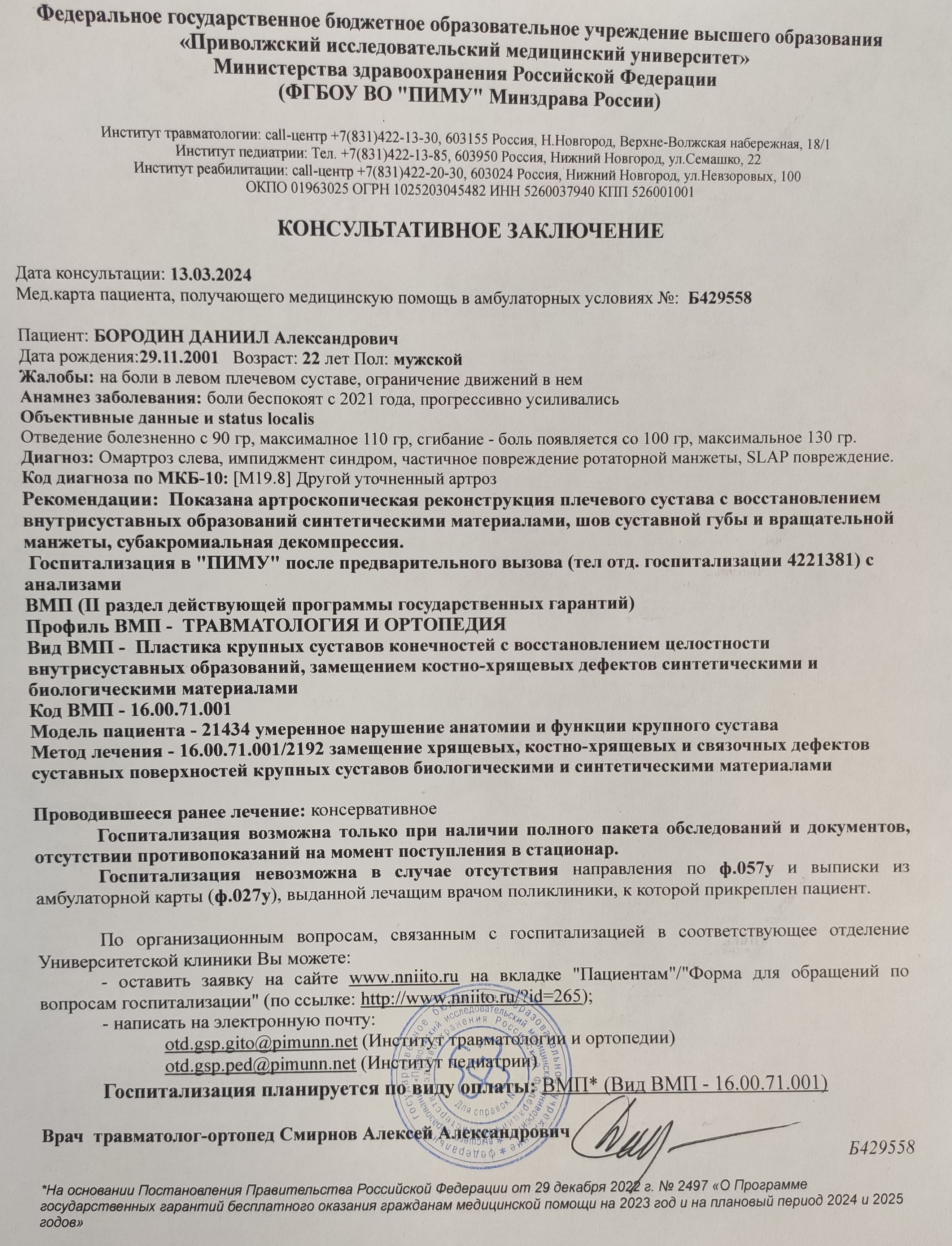 Для определения категории годности к военной службе, получите на руки и опубликуйте в полном виде фотографию самого свежего медицинского заключения врача-травматолога-ортопеда, и чтобы в нём обязательна была указана оценка амплитуды движений плечевого сустава в угловых градусах.