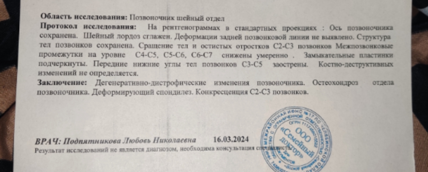 Насчет самого обследования, сходил в частную клинику на рентген шейного отдела позвоночника и сейчас получил данное заключение. Подскажите пожалуйста, стоит ли по такому заключению идти к терапевту и жаловаться на боли (боли в шее почти каждый день, иногда очень сильные, после долгой ходьбы) или, судя по этим записям, уже не получится освободиться по шейным заболеваниям?