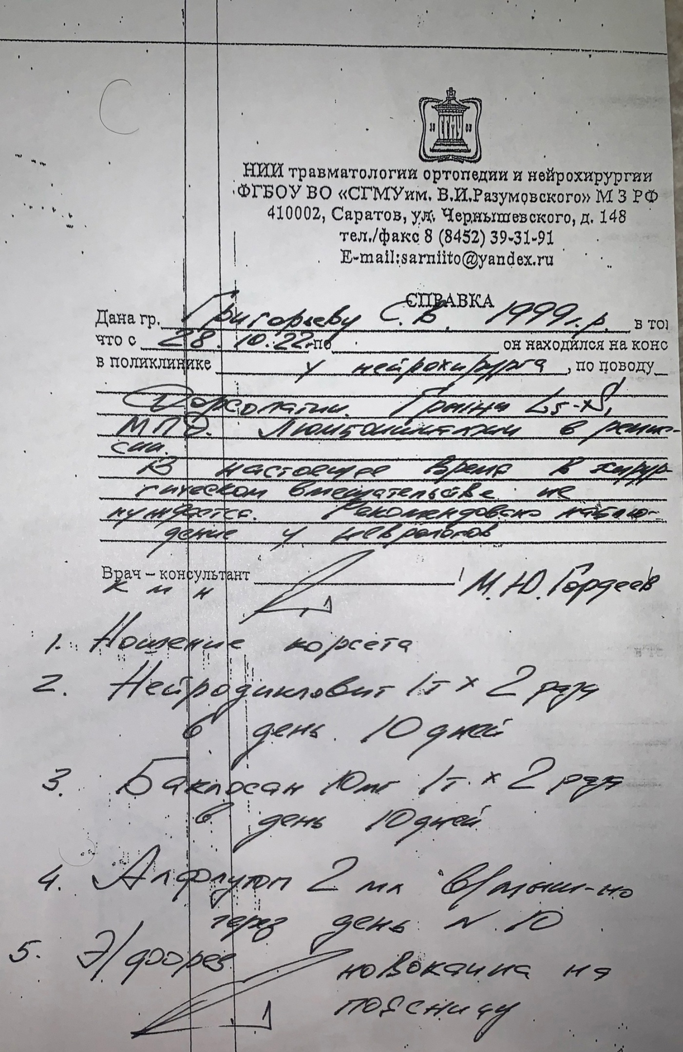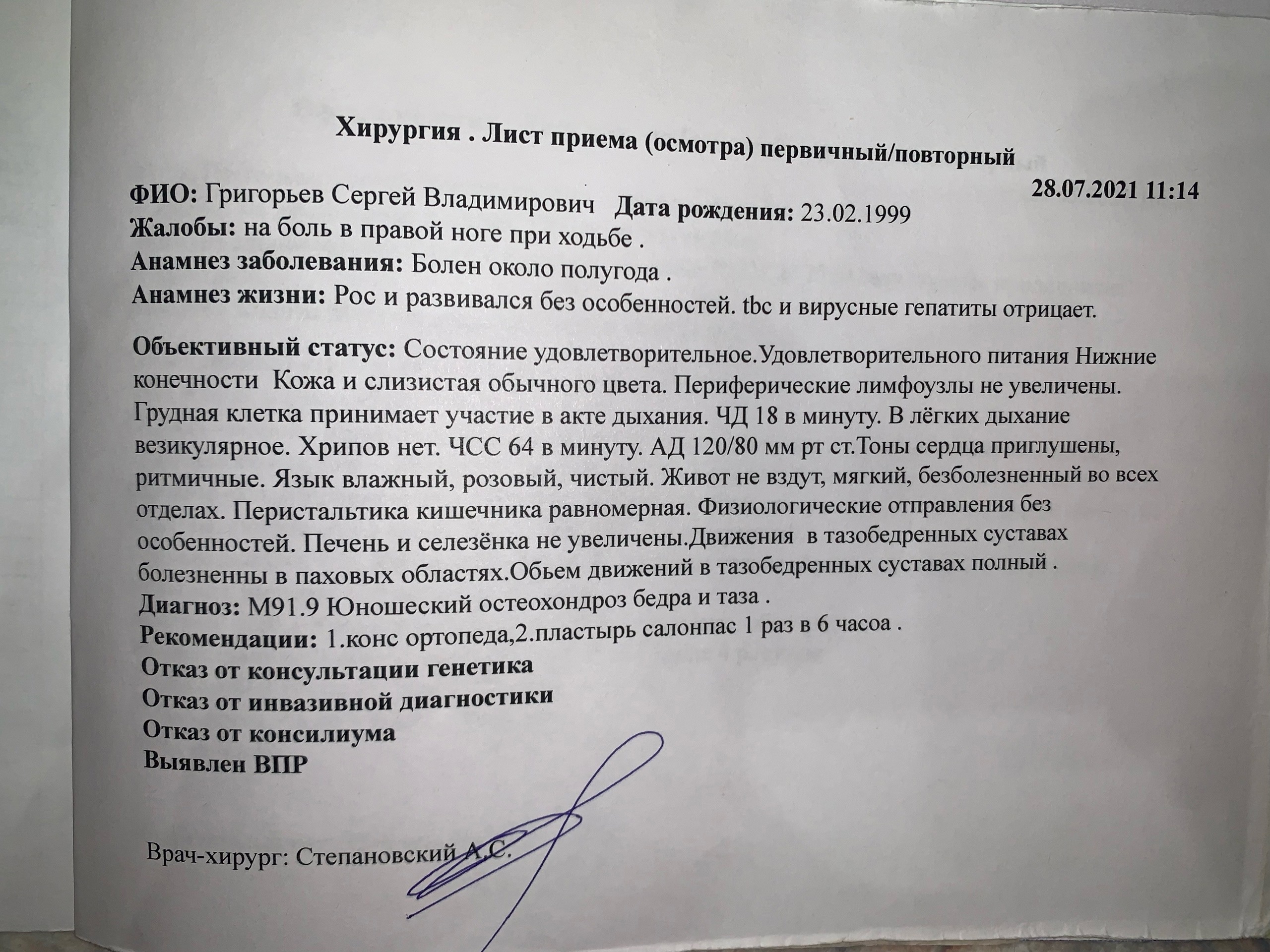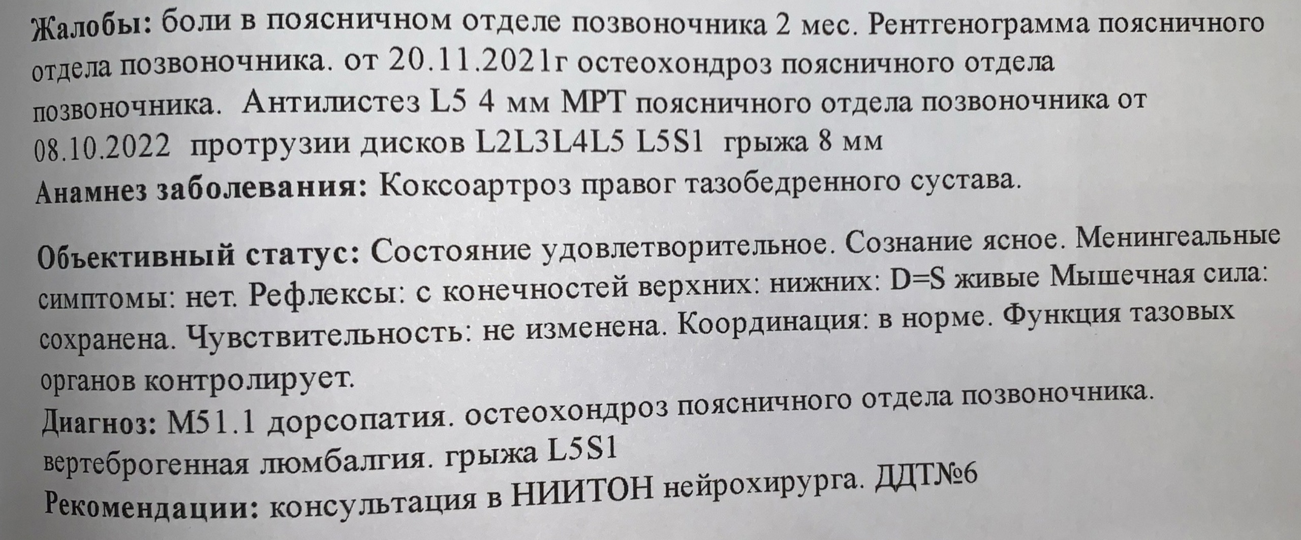 Как итог хирург отказался читать данные результаты и заключения врача под предлогом, что они сделаны в частных клиниках, а так же отказался изучать выписки от государственного невролога по поводу грыжи под предлогом «отсутствуют печати и мне не нужна копия карты, мне нужны выписки с печатями», но выписал акт на предоставление выписки по поводу «хронический обструктивный пиелонифрит» который был поставлен в 2014 году