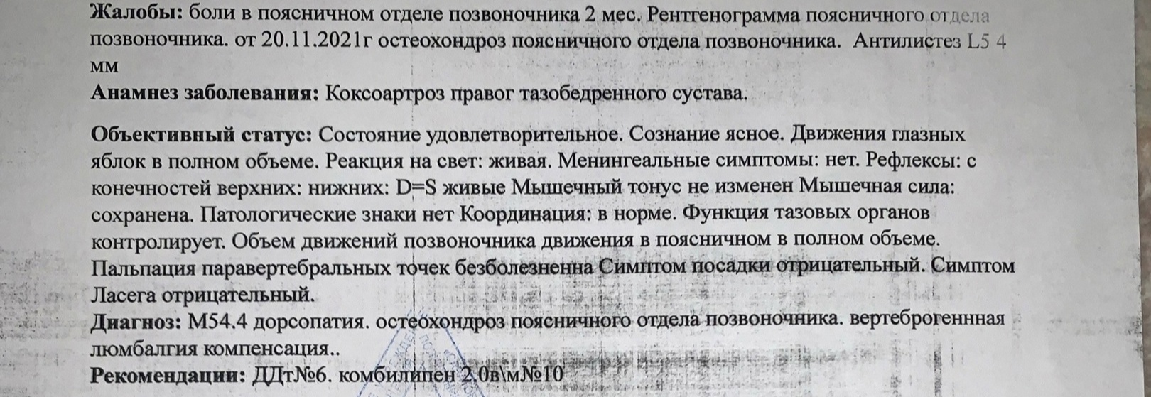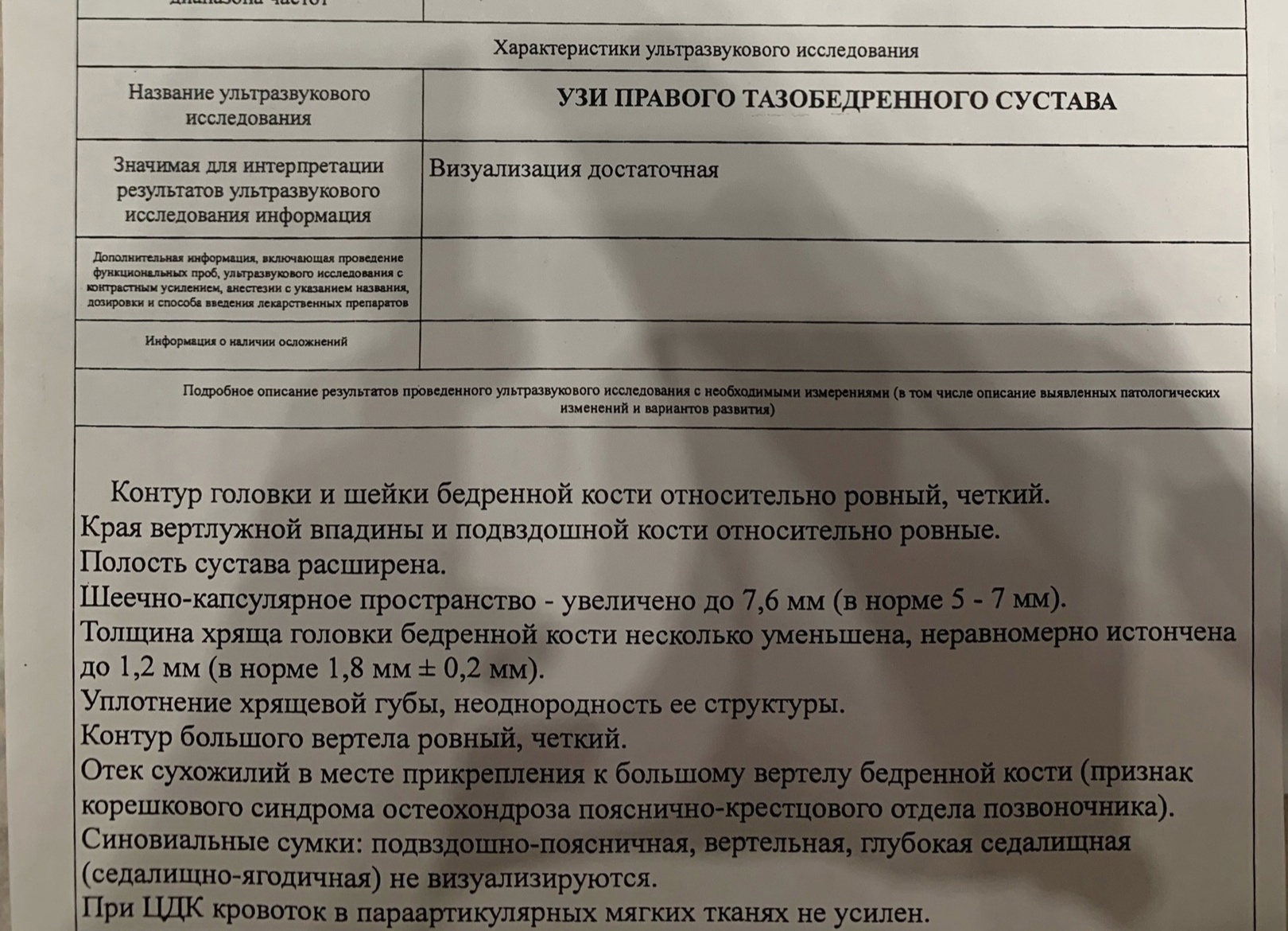 Постоянные неприятные боли в спине и в правом суставе распространяющиеся на всю ногу. Снижена чувствительность в пальцах ног(Большие пальцы почти ничего не чувствуют на двух ногах) , а так же с периодичностью в 2-3 месяца случаются сильные приступы боли (которые длятся в среднем 1-2 дня) в тазобедренном суставе и по всей ноге при малейшей попытке движением туловища или ноги.