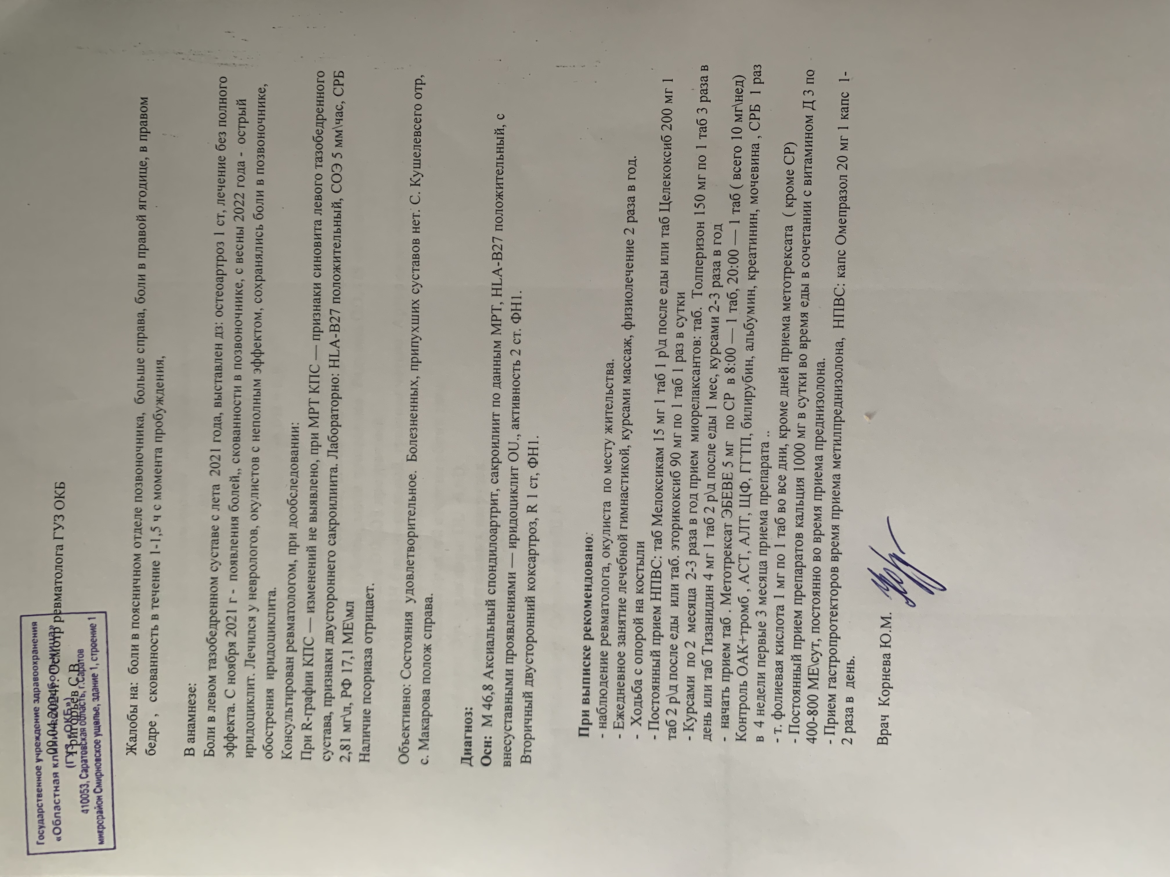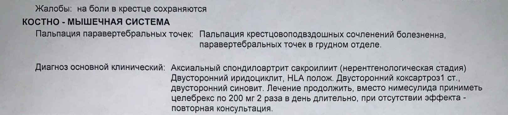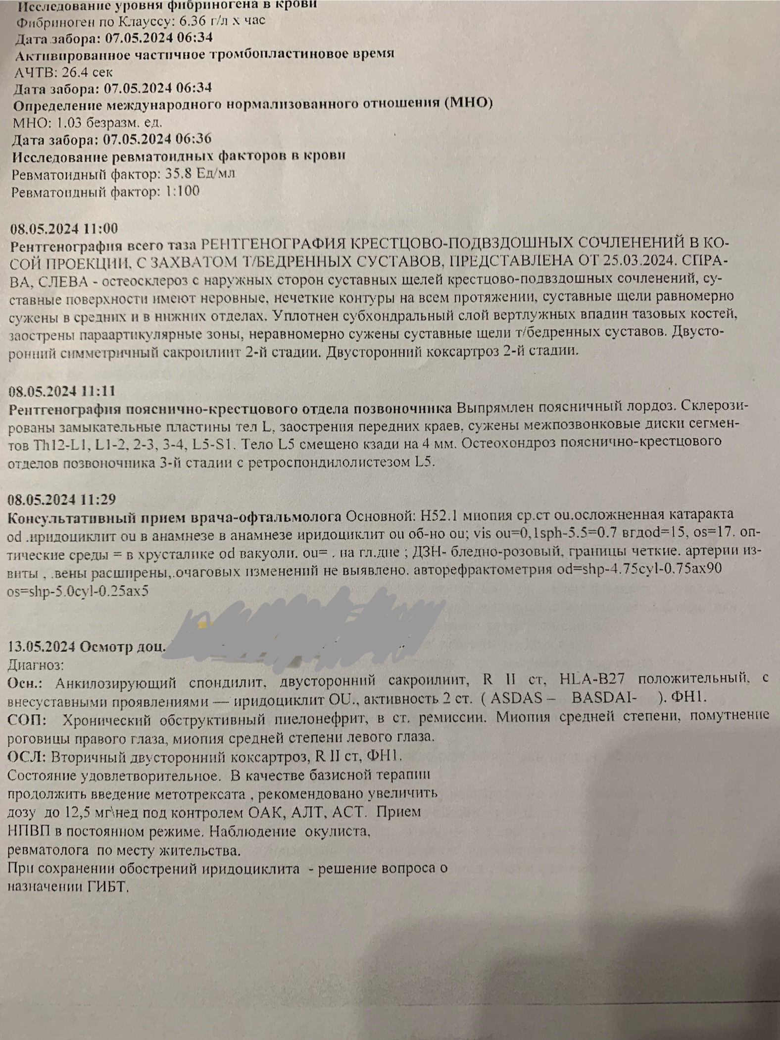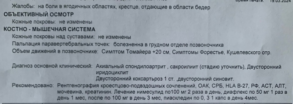 Сдал анализ крови на HLA B27, сделал рентген крестцово подвздошных сочленений и был повторно у ревматолога