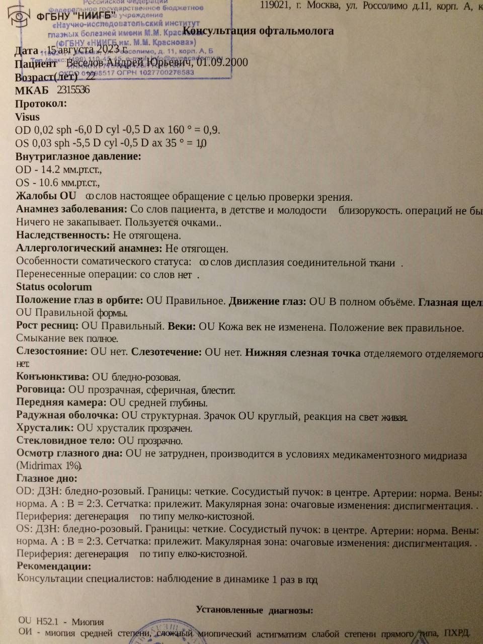 Krokodil13 писал(а):Алексей, спасибо вам большое за настолько быстрые ответы! Правильно ли я понимаю, что если после проведении лазерной коагуляции и отсрочки мое зрение будет так же больше 6.25, то освидетельствование пройдет 34 статье Расписания болезней и можно будет так же рассчитывать на категорию годности В по миопии высокой степени?