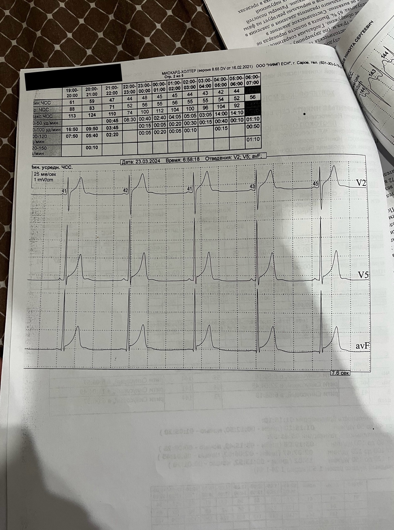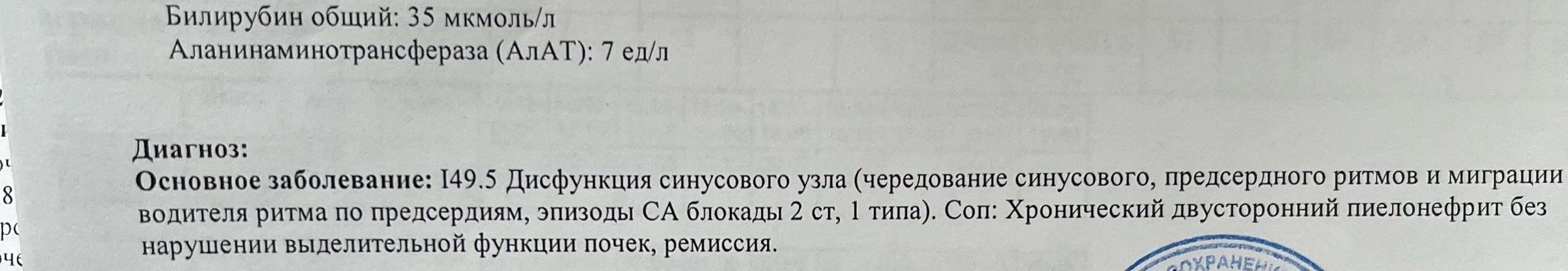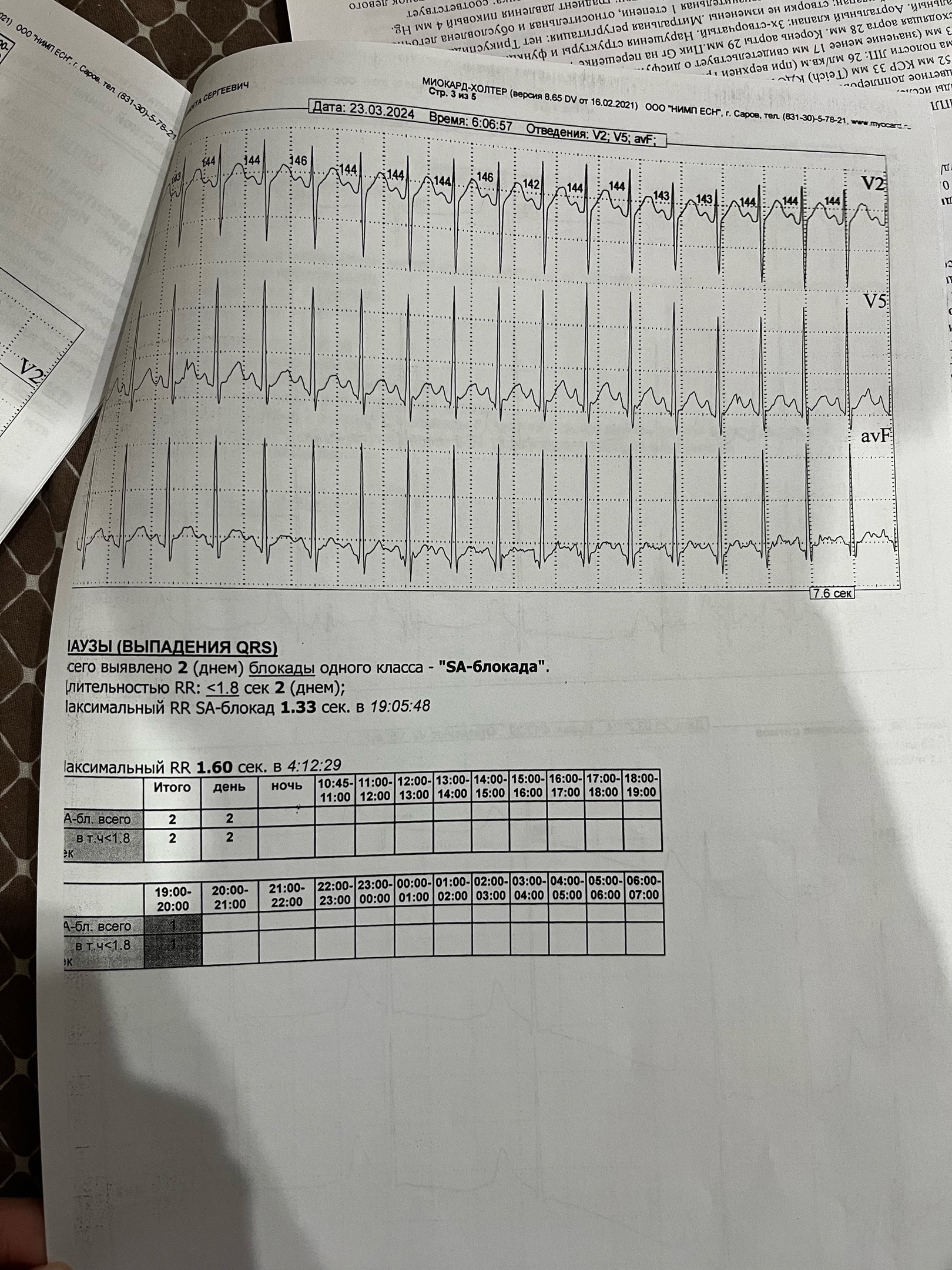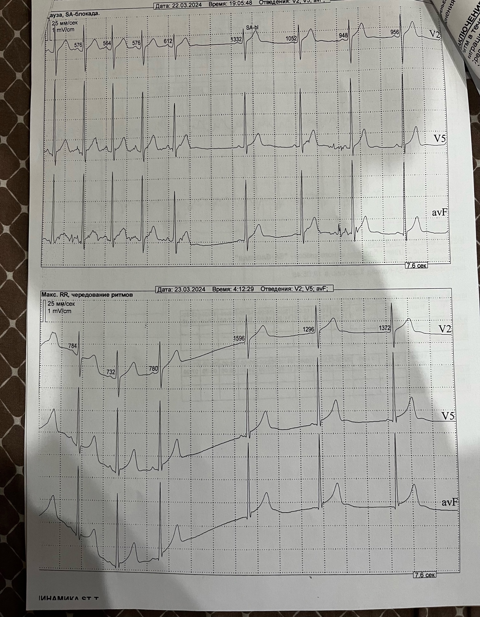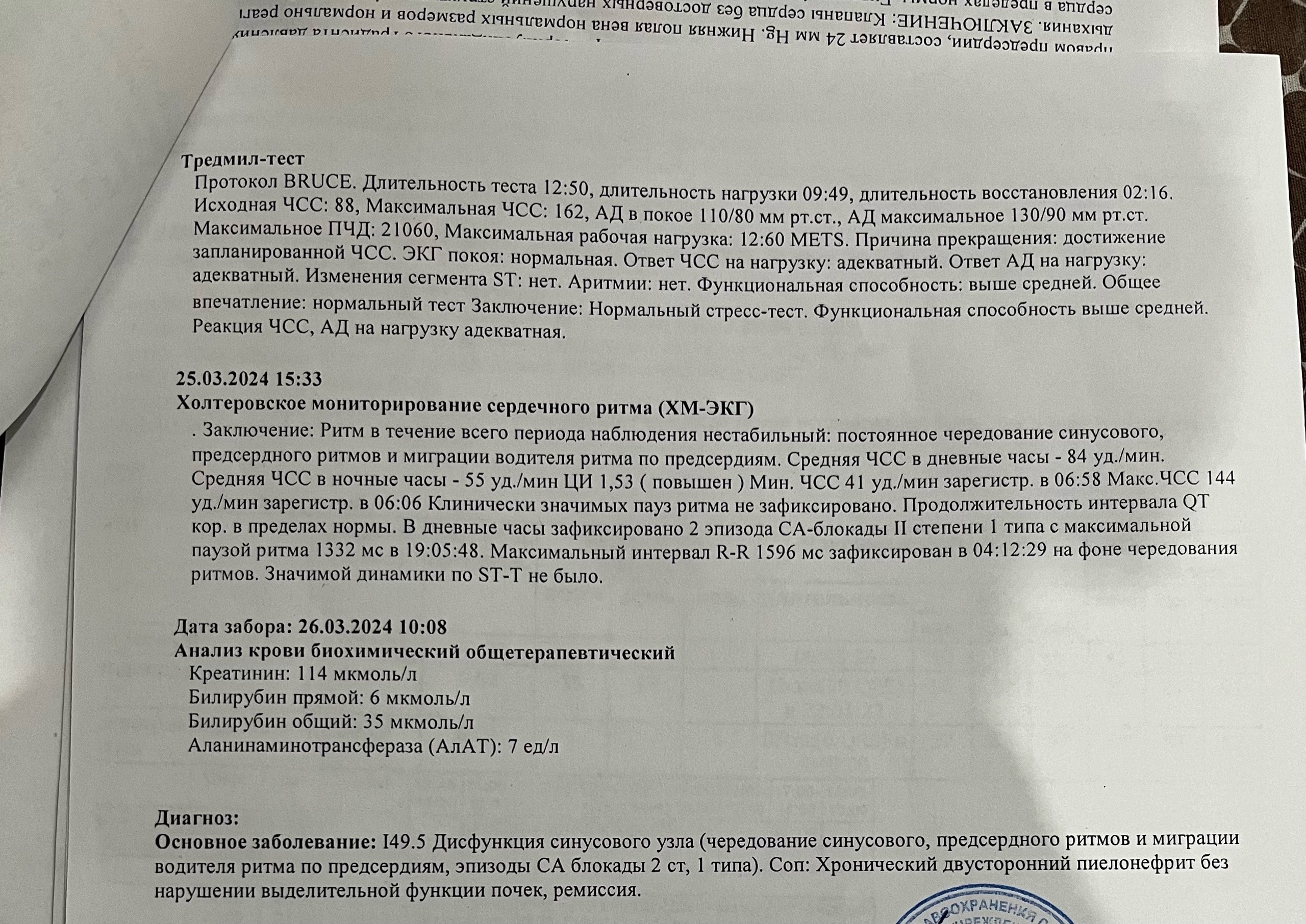 I49.5 Дисфункция синусового узла (чередование синусовго, предсердного ритмов и миграции водителя ритма по предсердиям), эпизоды СА блокады 2 ст 1 типа.
