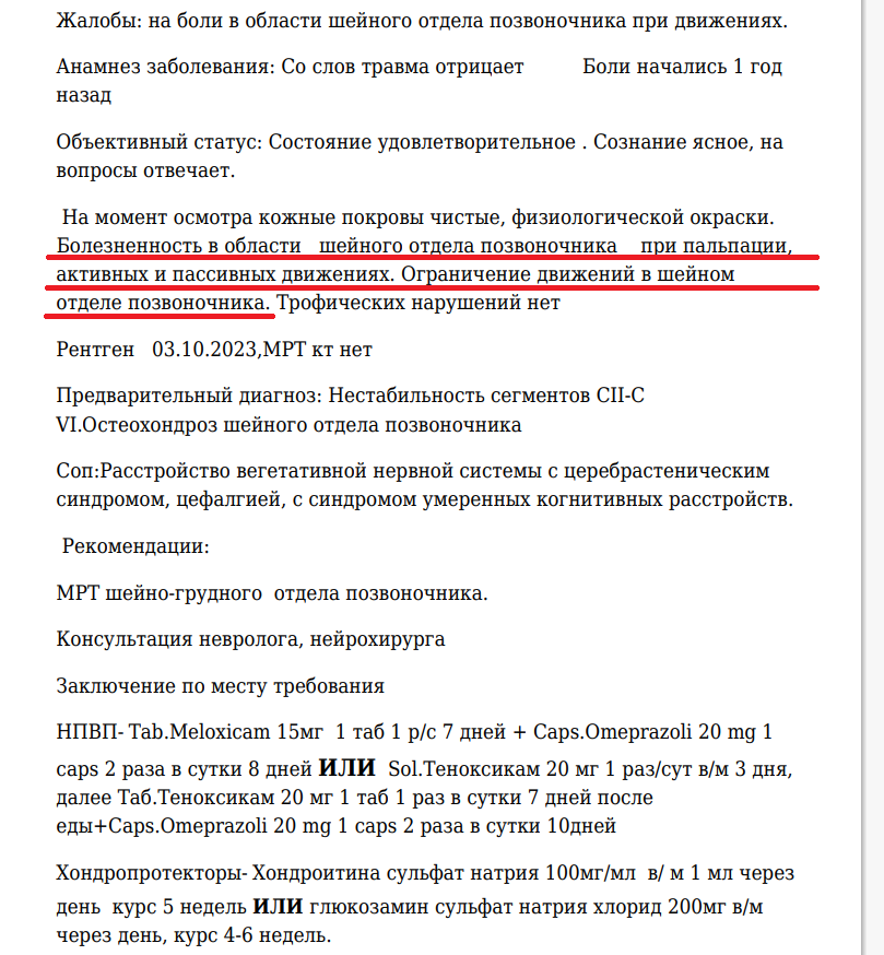 В сумме достаточно ли этого всего? наличие нарушения динамики позвоночника и статики, и наличие болевого синдрома (тоже из осмотра врача: ортопеда и невролога). Остеохондроза шейного отдела позвоночника и нестабильности сегментов с2-с6 (спондилолистез I степени, (у меня нестабильность). Заключения все высвечены в компьютере. И учитывая все выше перечисленные бумаги: Невролог (у которого наблюдаюсь в течение минимум 3 лет, 24 посещения к неврологу по головокружению, тошноты, потери сознания при нагрузке, Боли в шее, все отображено в компьютере), Ортопед, направление от Физиотерапевта на лфк и карты больного, лечащегося в физиотерапевтическом отделении и заключение двух Рентгенологов (2 раза делался рентген).