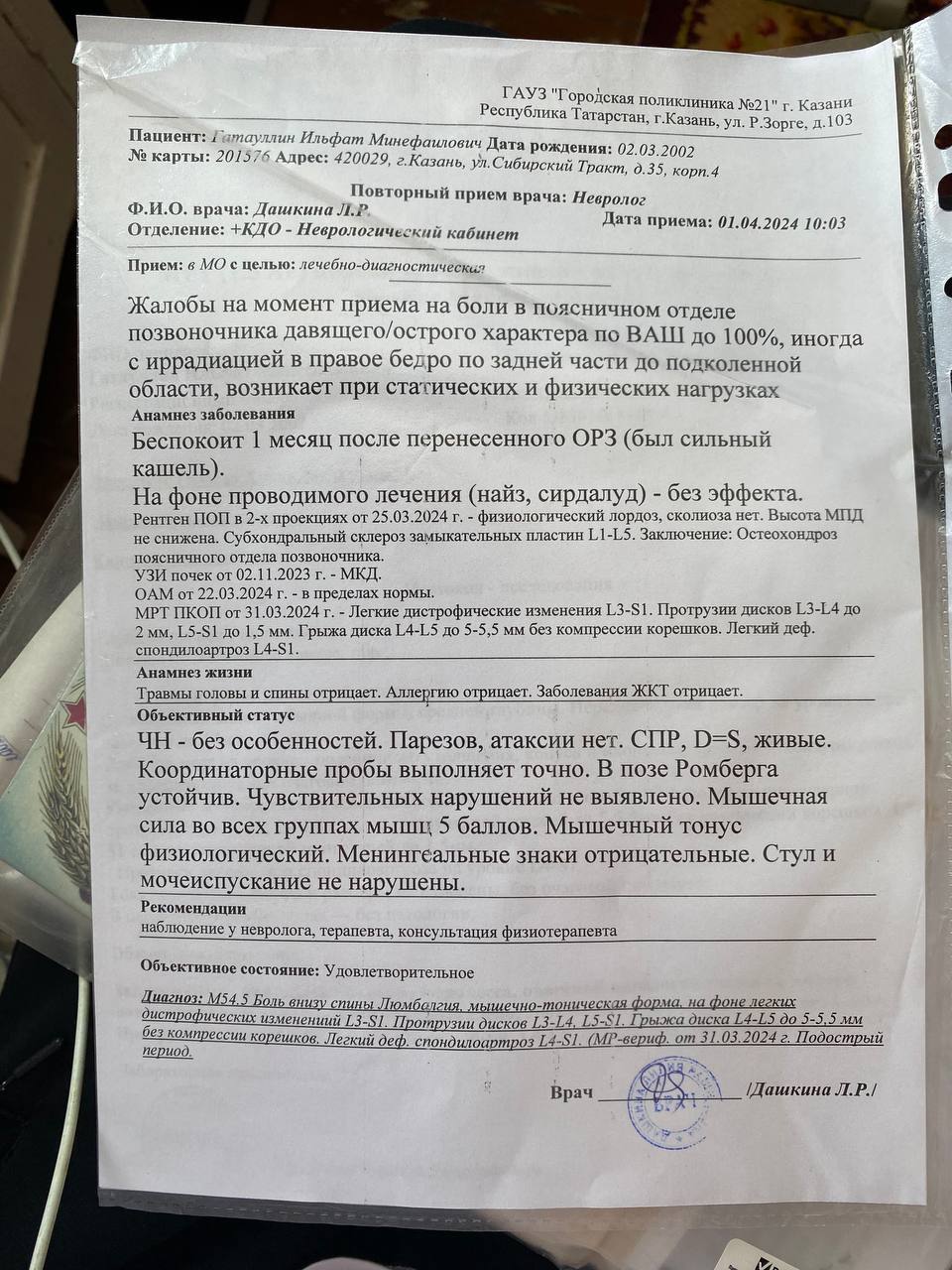 NolJk писал(а):Более 2 месяцев мучают боли в пояснице, вплоть до того, что бывают дни, когда не могу встать с кровати, ограниченность в движении правой ноги(не могу поднимать более, чем на четверть амплитуды) и так же не могу нагибаться, практически совсем . Сделал обращения в больницу (болевой синдром подтверждают 4 документа) и обследования (МРТ и рентген). Все документы прикреплю.
