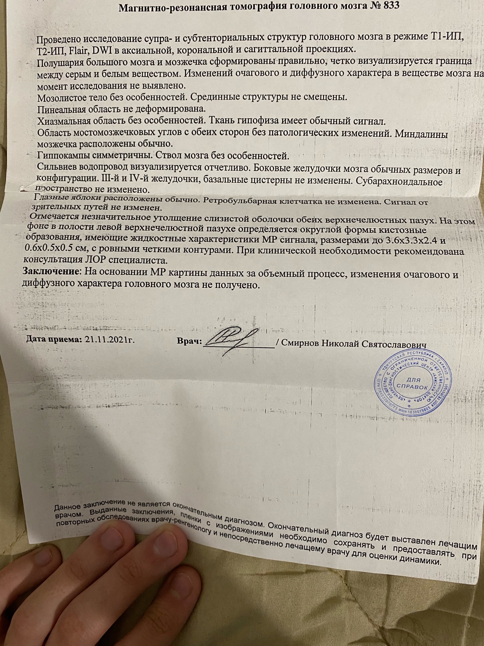 Киста доказана, есть бумаги прохождение МРТ. Тремор рук не подтвержден, искал причину два года назад, так и не нашел (за два года он так и не прошел, не могу заниматься чем-то мелким, например, закрутить тот же самый болтик, руки трясутся. Он у меня с детства, но начал проявляться сильно после экзаменов с 9 класса). ВСД и ВЧД подтвержден с детства. Стафиллокок и эозинофилия подтверждены (но причину эозинофилии так и не нашли, нашли только простейших в организме). Плоскостопие ставил хирург, но потерял документ. Беспокоят следующие симптомы: закладывает нос по несколько раз в день на протяжении года, сложно дышать, сложно заниматься физ.нагрузками; часто болею (третий раз за два месяца, очень слабый иммунитет). У меня есть хронические заболевания - гайморит и фарингит. Недавно ЛОР еще нашла хронический тонзиллит. Прикрепляю ниже документы, которые в данные момент есть. Сейчас прохожу диспансеризацию, назначили КТ пазух носа и развернутый анализ крови носа. Нужно ли подтверждать тремор рук и переподтверждать ВСД и ВЧД?