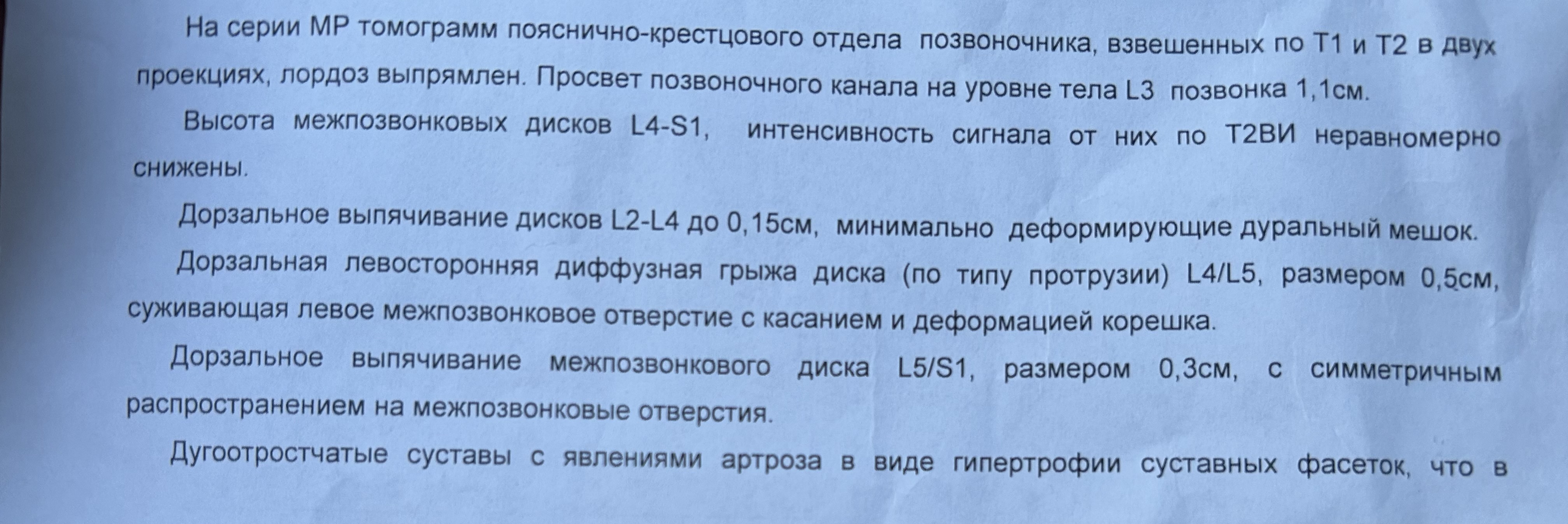 Сейчас случилось очередное обострение и на мрт отрицательная динамика. Протрузий стало больше, одна стала грыжей, и 6 позвонков в артрозе.