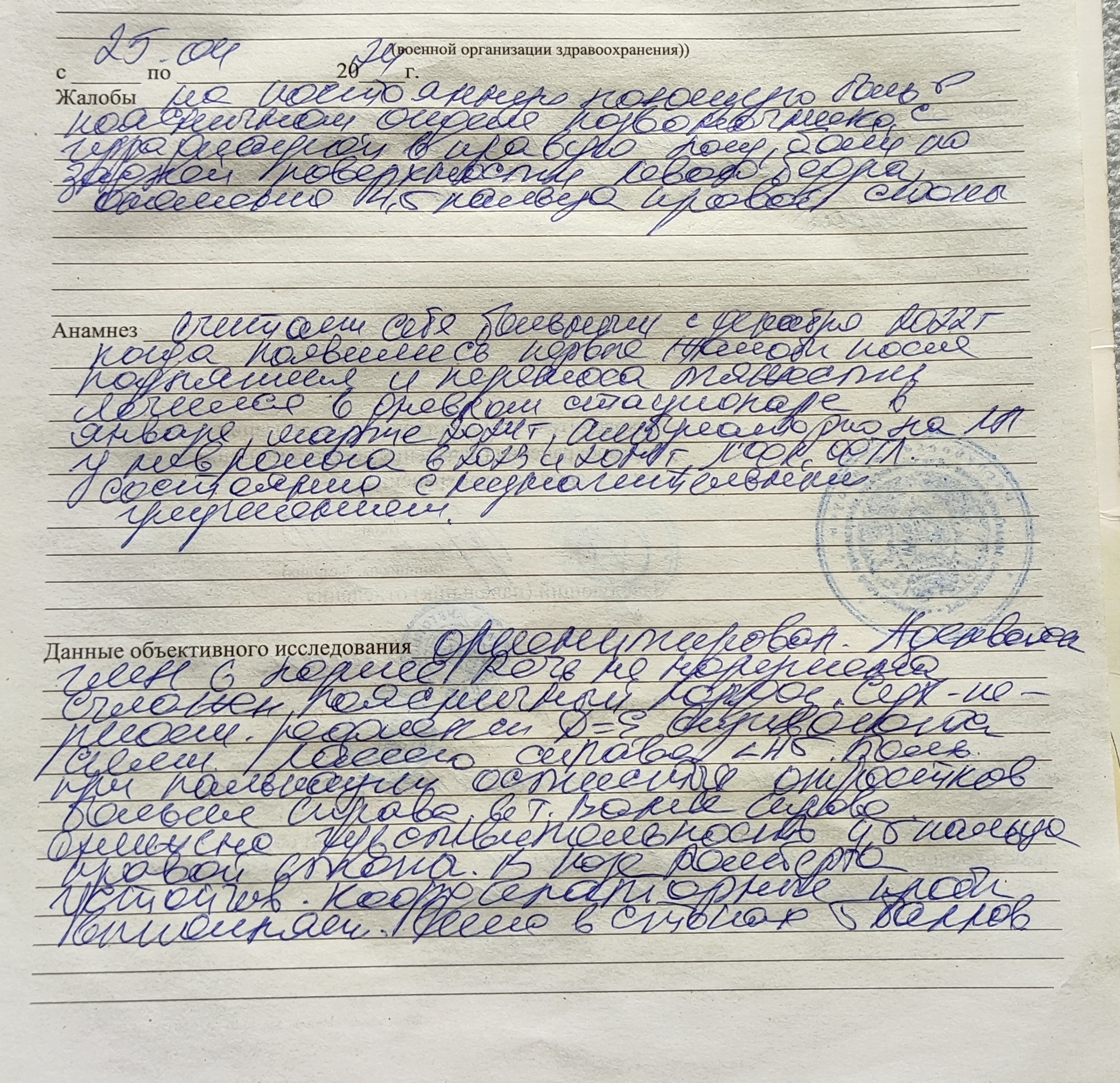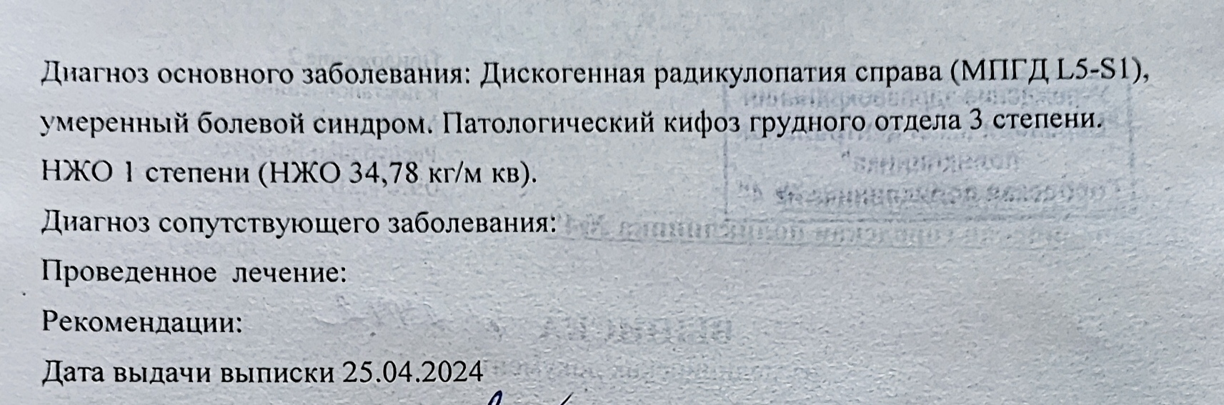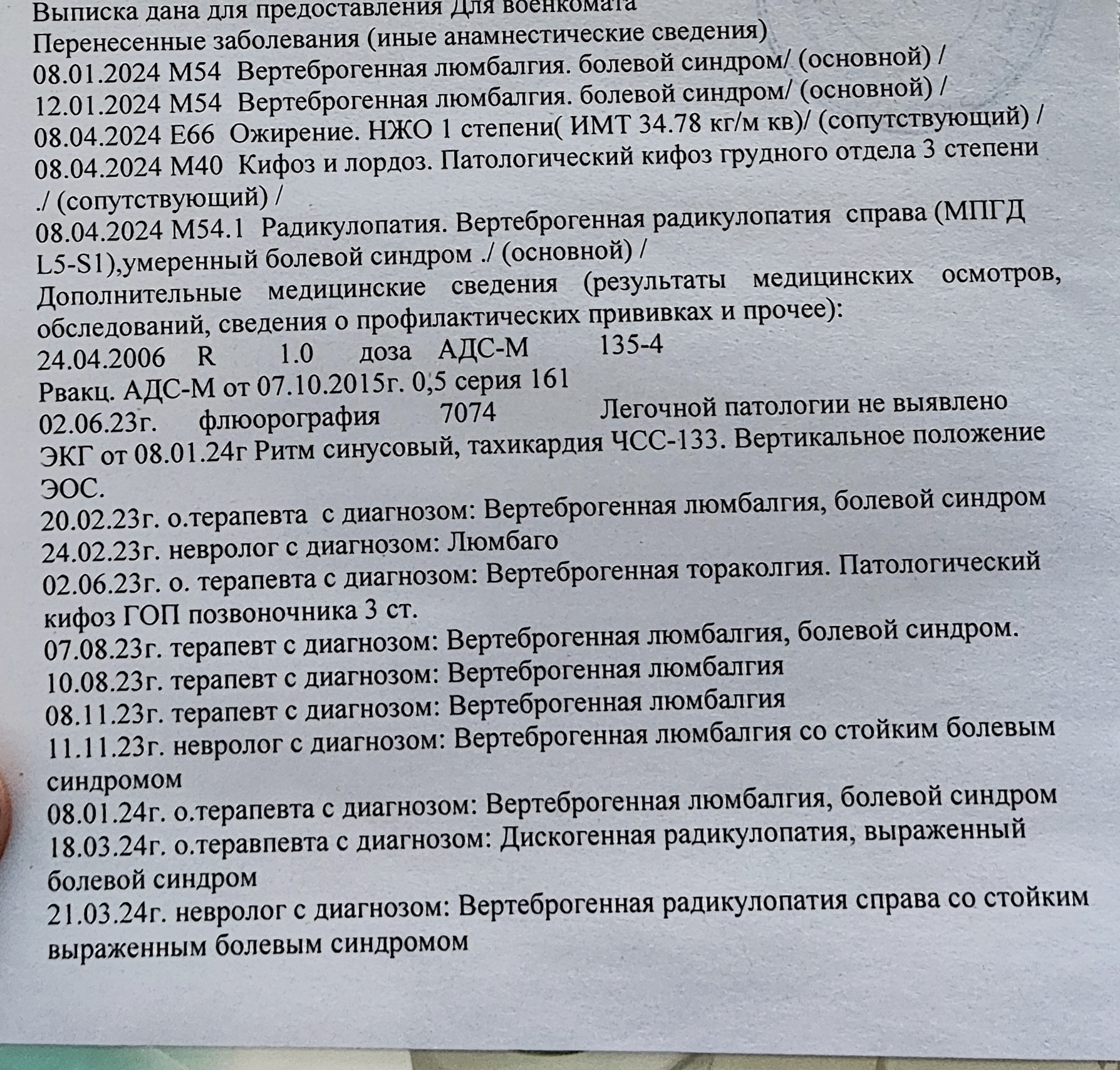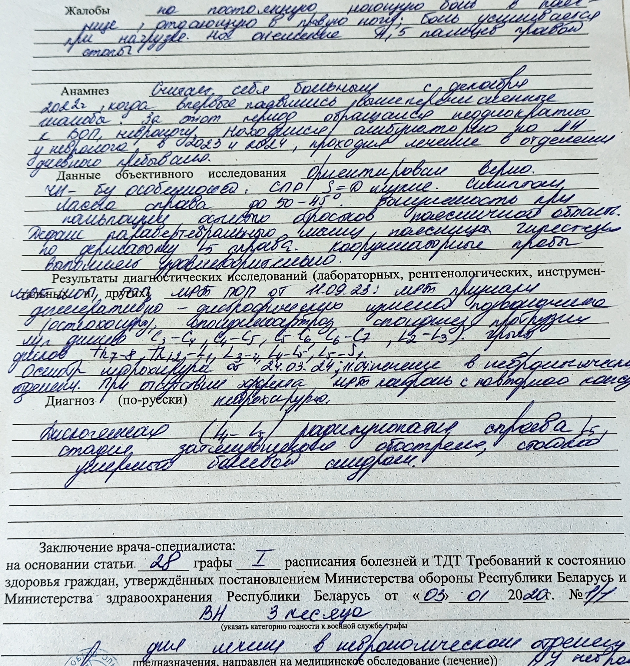 SHImpa писал(а):Здравствуйте, как то раньше задавал вопрос по годности по 26в статье. Сегодня сходил заполнил акт по направлению от военкомата в заключительном диагнозе стоит M51.1 Дискогенная радикулопатия справа, затянувшийся болевой синдром. Хроническая форма. Так же ездил в РНПЦ там так же подтвердил данный диагноз(для себя, на всякий случай заключение имею на руках). Можно ли с эти разматывать что невролог признает НГМ по 26в?? Выписку так же взял и попросил отметить все обращения по спине. Их всех за 2023-2024 год 7 штук. 3 раза лежал в дневном стационаре.