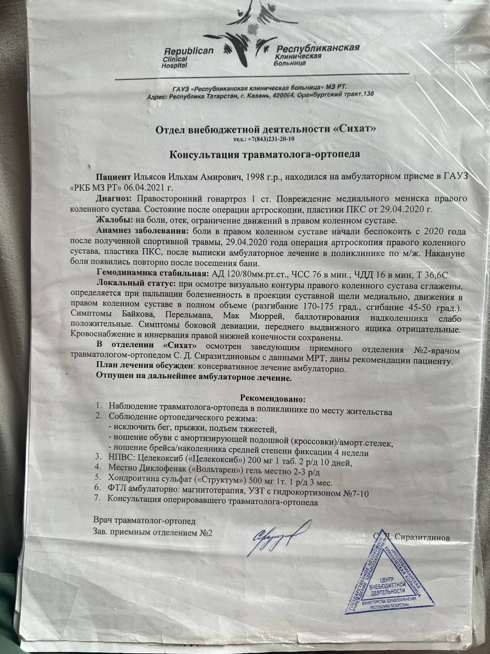 Опубликуйте в полном виде фотографию медицинского заключения врача-травматолога-ортопеда за апрель или май 2024 года.