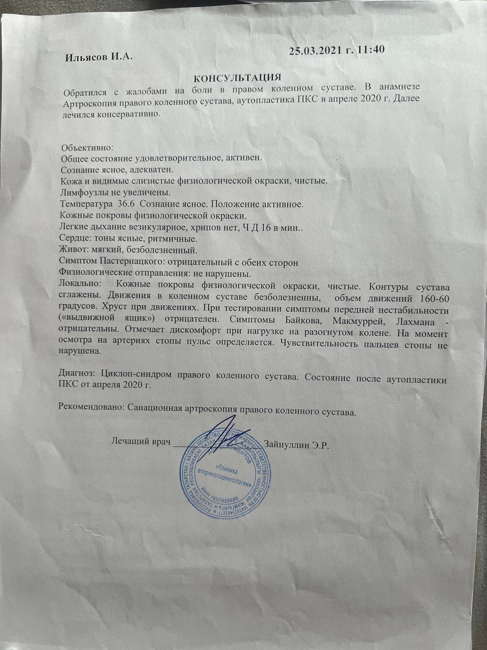 Ильхам писал(а):Был разрыв связки переднего коленного сустава, сделал операцию, через время поставили диагноз синдром циклопа, сейчас колено при сгибании и разгибании отдает сильным хрустом, во время нагрузок тяжело и нога быстро устает, отсюда вопрос: