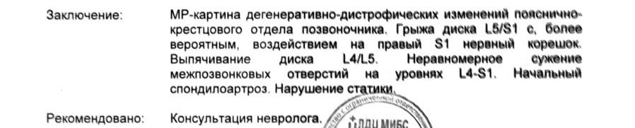 М51.8 Другое уточненное поражение межпозвоночного диска. Вертеброгенная люмбалгия без корешковой неврологической симптоматики; неполная ремиссия. Фон: дегенеративно-дистрофические изменения поясничного отдела позвоночника 2-3 период. Диффузная грыжа L5-S1 6 мм. Протрузия L4-L5 3 мм. Спондилоартроз. Также проходил ЭНМГ нижних конечностей, так как немеют пальцы ног. Поставили диагноз G57.8 Нейропатия малоберцового нерва слева по данным ЭНМГ без клинических проявлений. Лежал в дневном стационаре со спиной, капали пентоксифиллин.