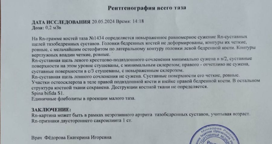 Недавно сделал рентген таза: нашли двусторонний сакроилеит 1 степени и неэрозивный артрит тазобедренного сустава. Также имею сколиоз 2 степени.