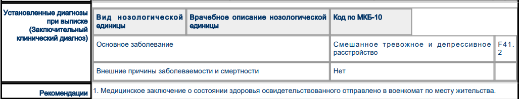Здравствуйте, был от военкомата в Ркпб (республиканской клинической психиатрической больнице) в июле (находился и после конца призыва). Поставили диагноз смешанное тревожное-депрессивное расстройство, можете пожалуйста подсказать, что это значит в военкомате. И мне наверное должны позвонить из военкомата на осеннем призыве или как что, я просто был от весеннего призыва, но пока находился там на обследовании от военкомата, закончился призыв. Часть документа из госуслуг приложил