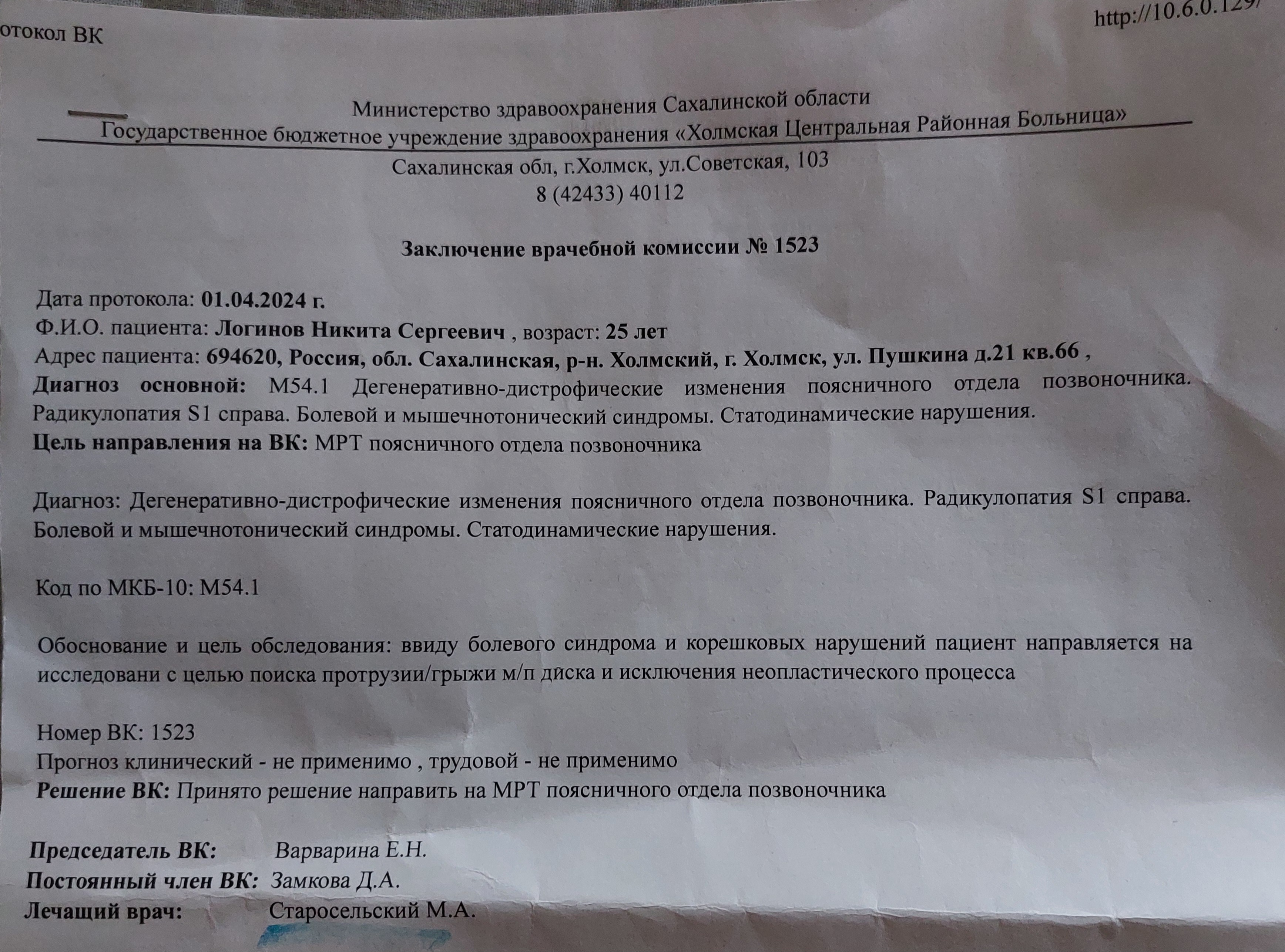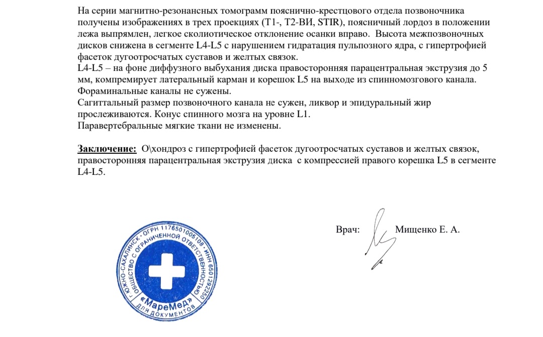 Почти ровно год назад, в июле 23 года, рано утром после пробуждения, ужасно стала болеть поясница. Не мог ни сгибать спину, ни нормально двигаться. При долгом стоянии или хождении, начинает болеть поясница справа и правая нога, присутствует онемение и мышцы сводит, от ягодицы до стопы. Безусловно, обратился сначала к терапевту, потом к неврологу. Сначала назначили таблетки, отправили на ренген, это не помогло, обратился второй раз. Назначали дневной стационар с физиотерапией, ЛФК и капельницами, а также лечение уже другими таблетками(это также не помогло), после отправили на МРТ.