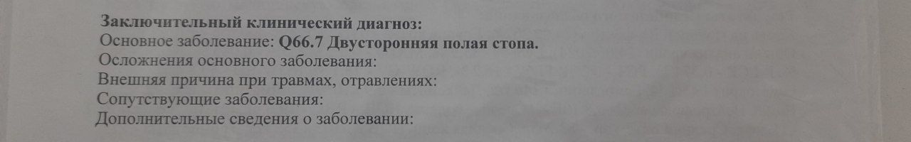 Заключительный диагноз: Q66.7 Двусторонняя полая стопа.