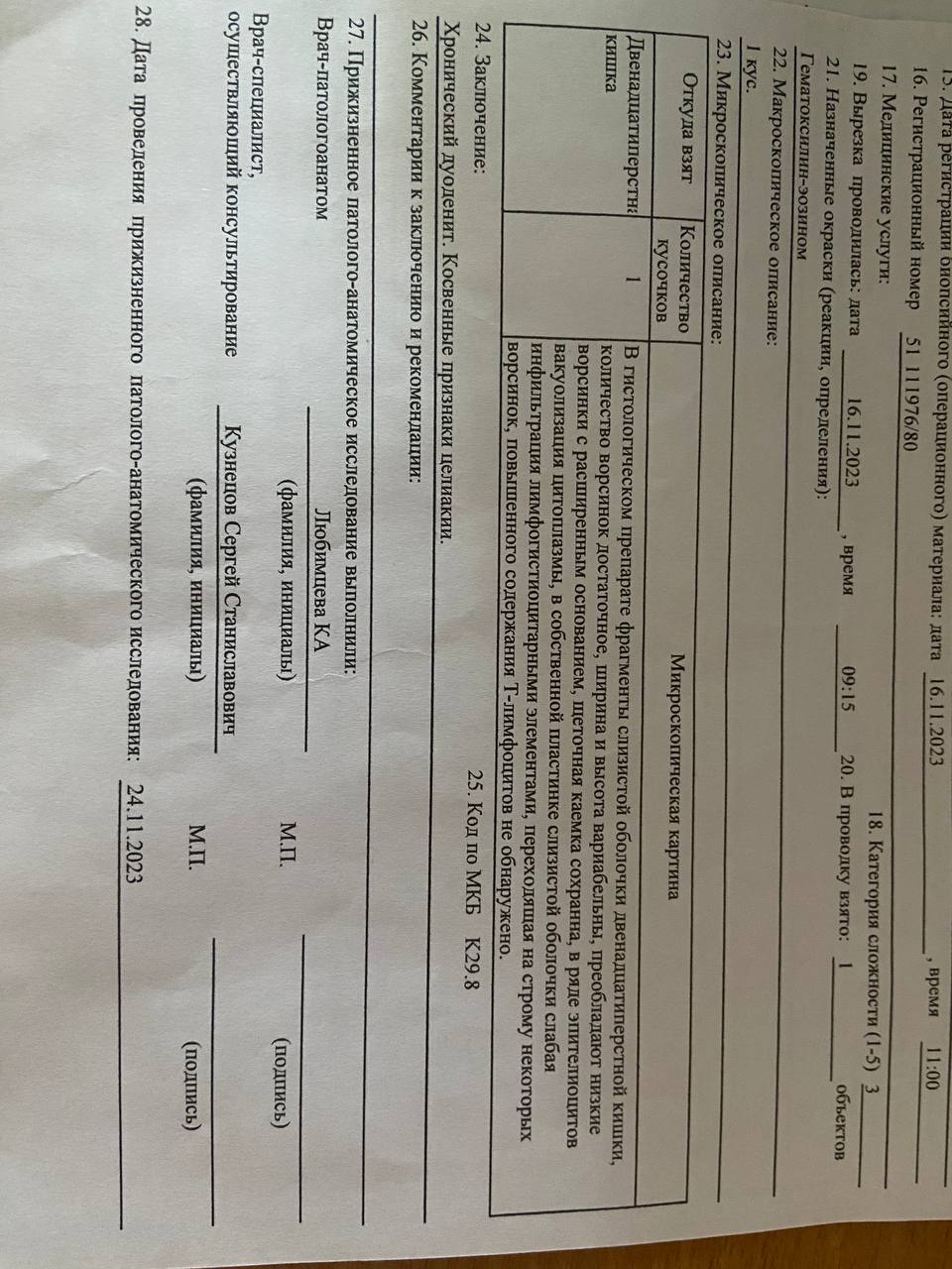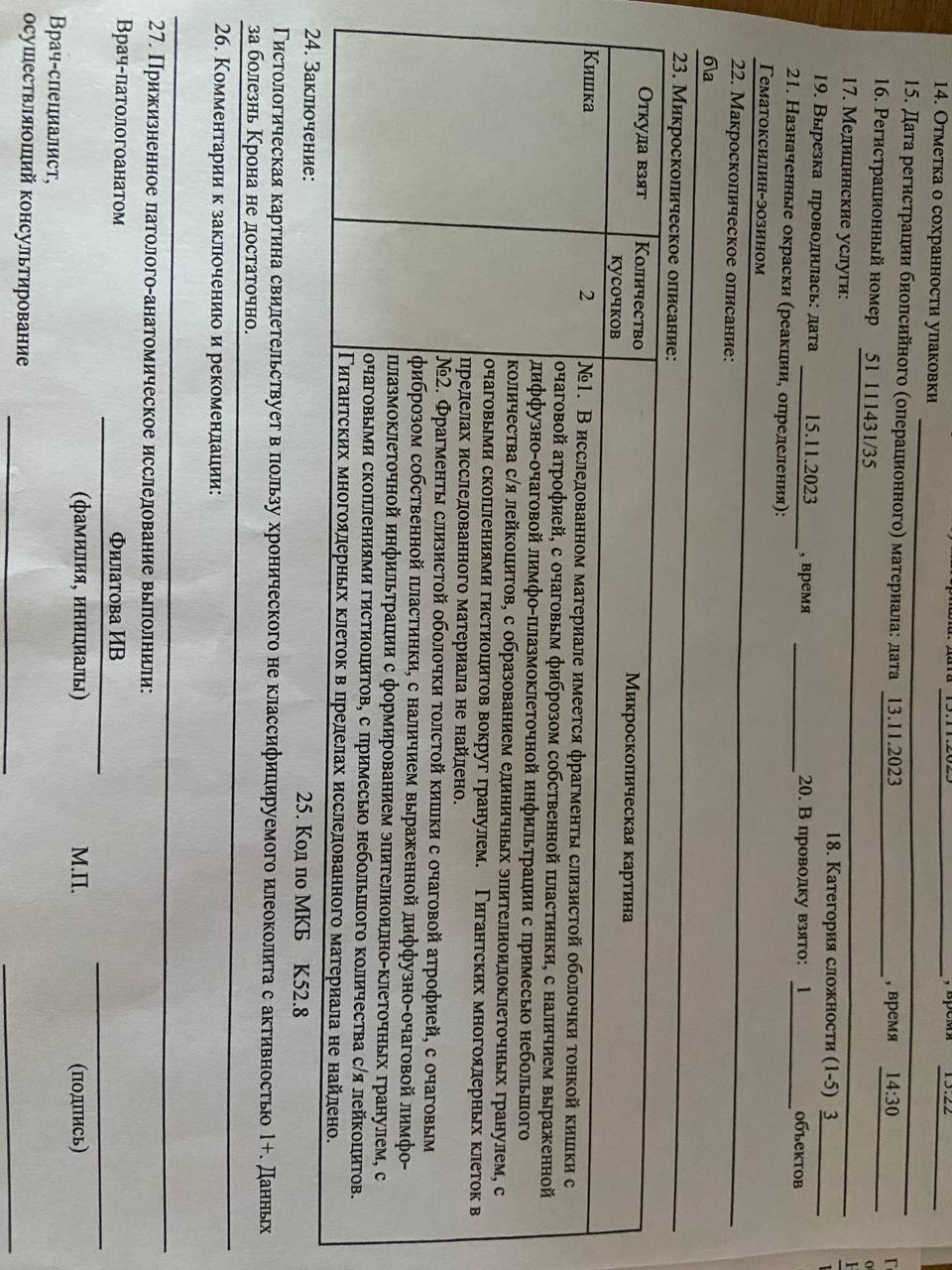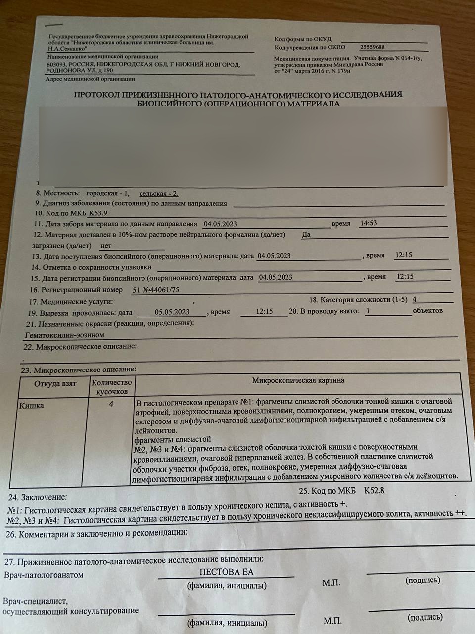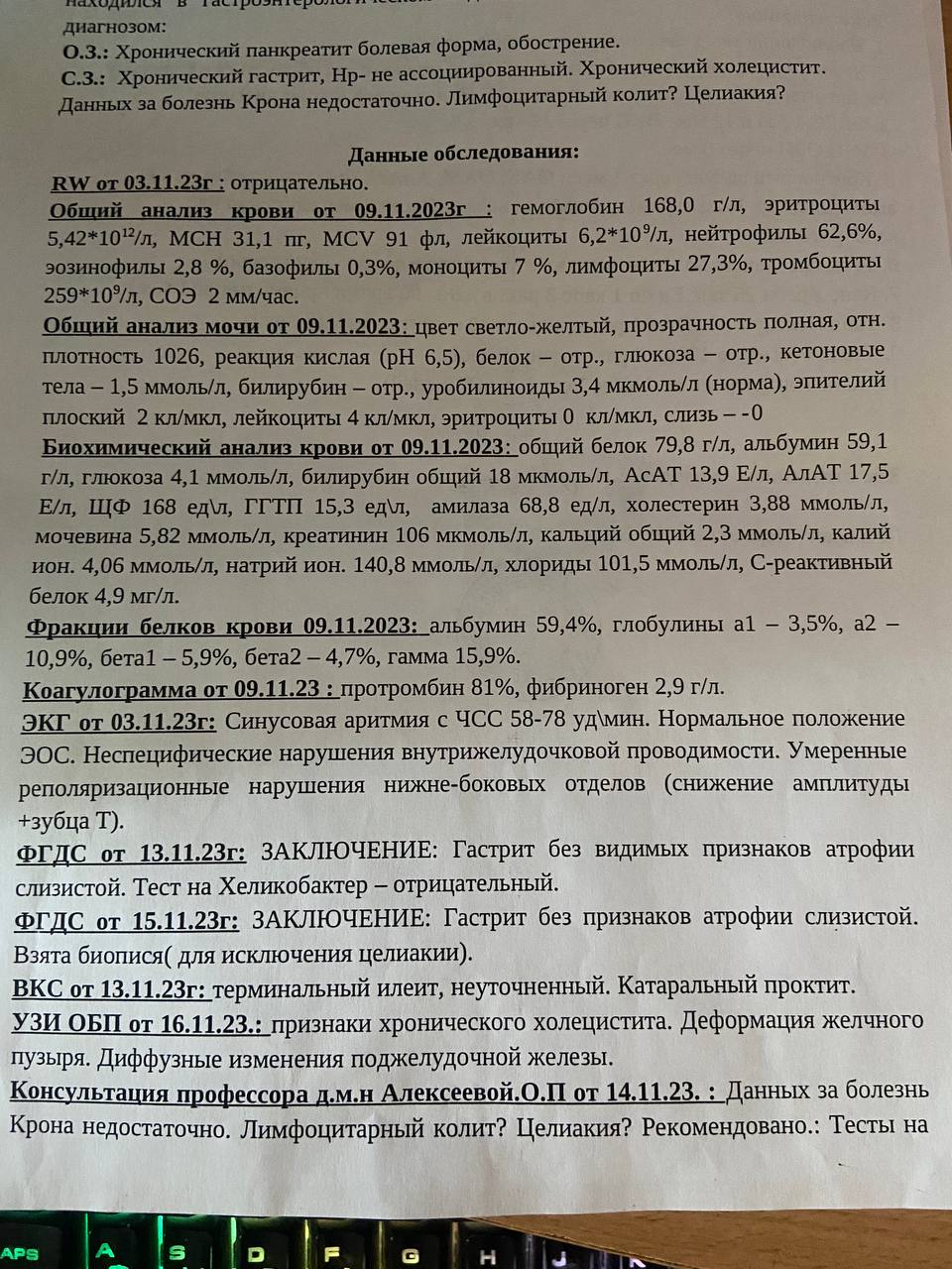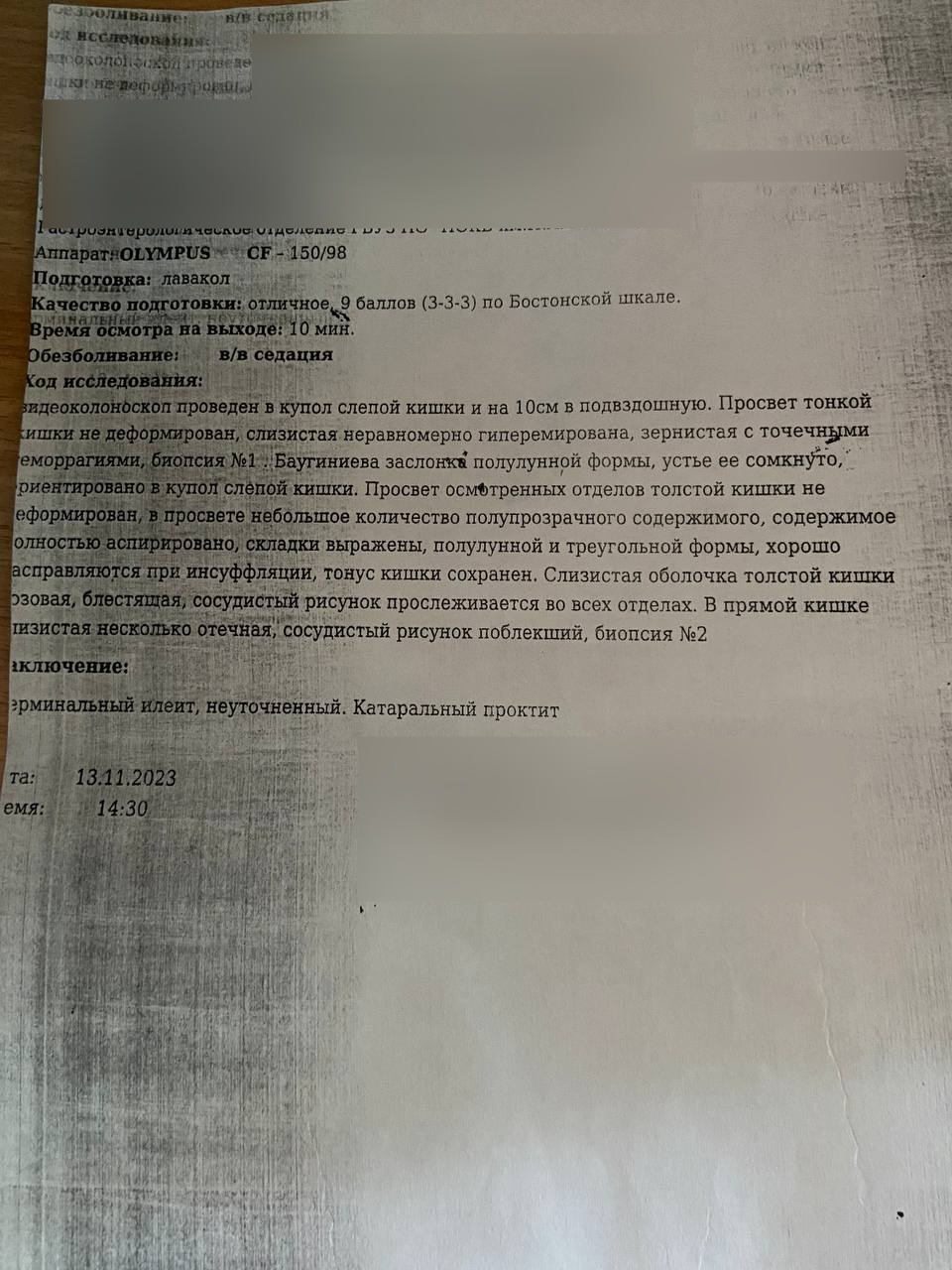 Также обследовался в ноябре 2023: по диагнозам: хр панкреатит, гастрит, холецистит, была колоно поставили терминальный илеит неуточненный, взяли биопсию на целиакию, по итогам биопсии данных за БК недостаточно - диагноз илеоколит, по биопсии на целииакию - косвенные признаки целиакии.