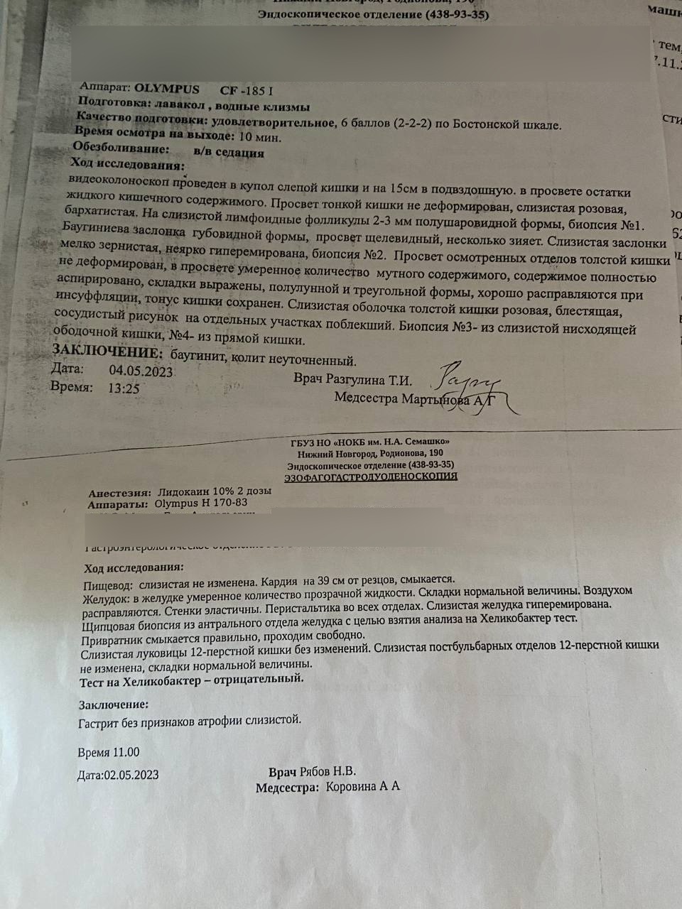 Колит протекает на протяжении трех лет, в 2020 брали биопсию и точный диагноз звучал как: тотальный поверхностный колит с лимфофолликуляной гиперплазией, причем раньше был просто колит, а вот за три года на фоне его развился: СРК, Баугинит, СИБР, реактивный панкреатит и холецистит, недостаточность баугиниевой заслонки. раньше таких болячек у меня не наблюдалось.нарушении функции кишечника есть: запоры больше чем 4 дня, диареи до 20 раз в день, примеси крови, слизи в кале, боли по всему ЖКТ - это всё обследования за май 2023.