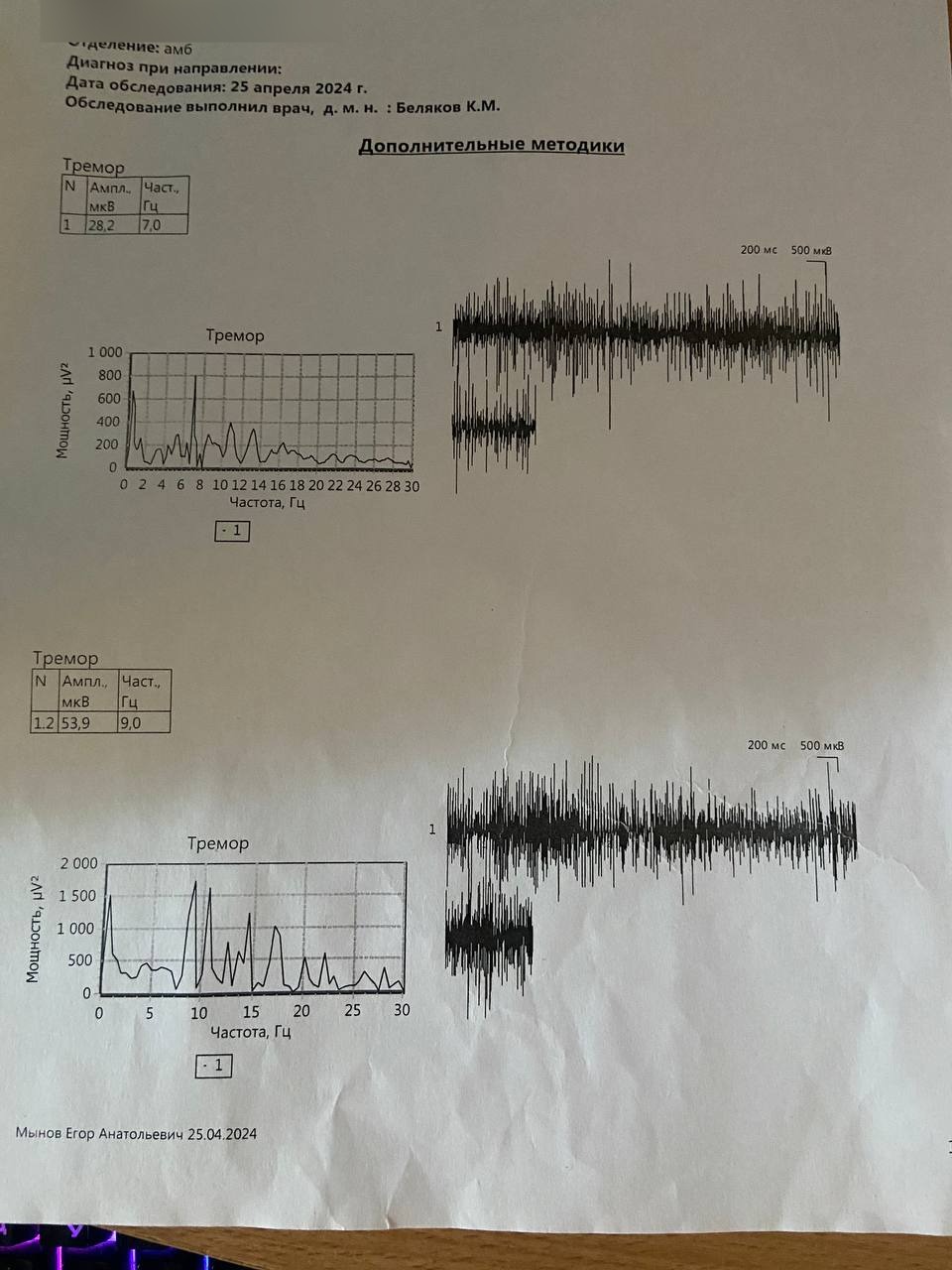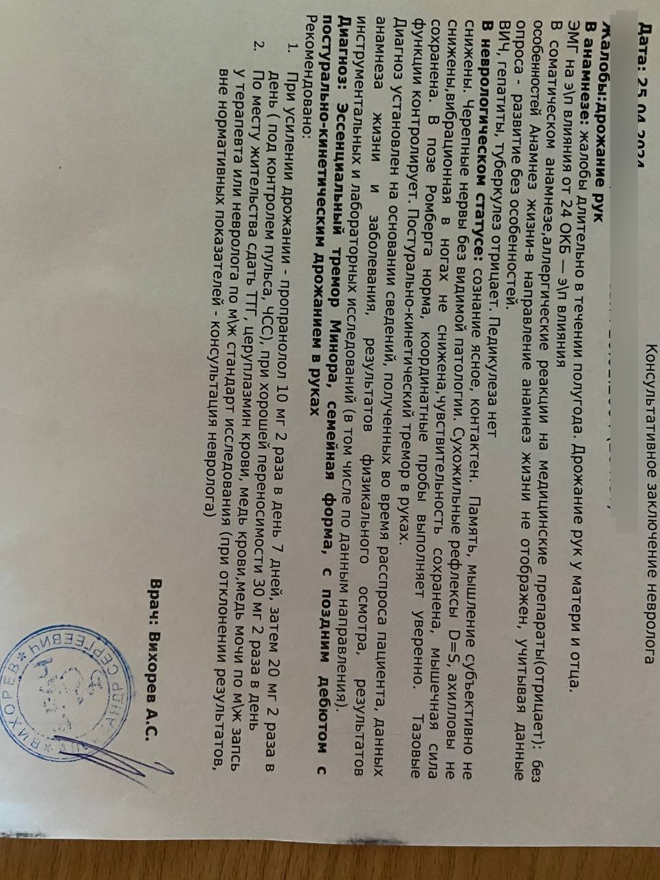 Также теперь появился тремор, обследовался у невролога - поставил эссенциальный тремор минора семейной формы, с поздним дебютом и постурально-кинетическим дрожанием в руках