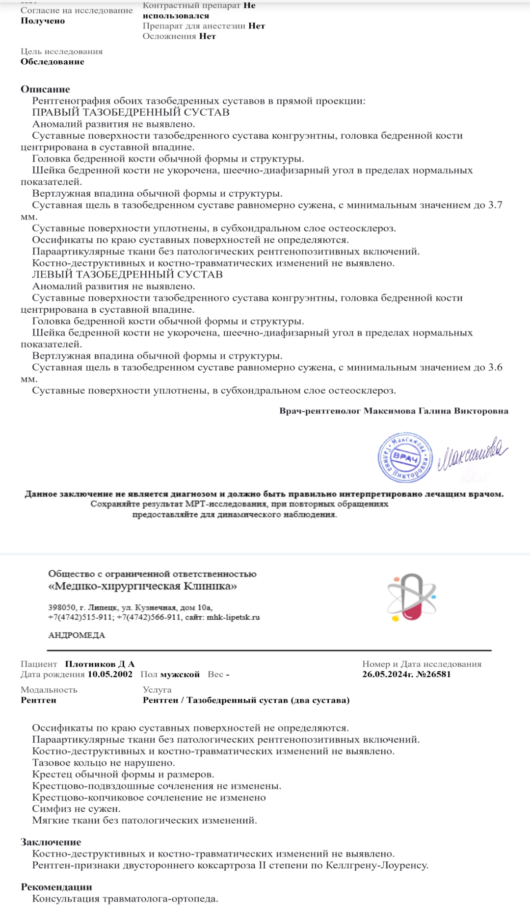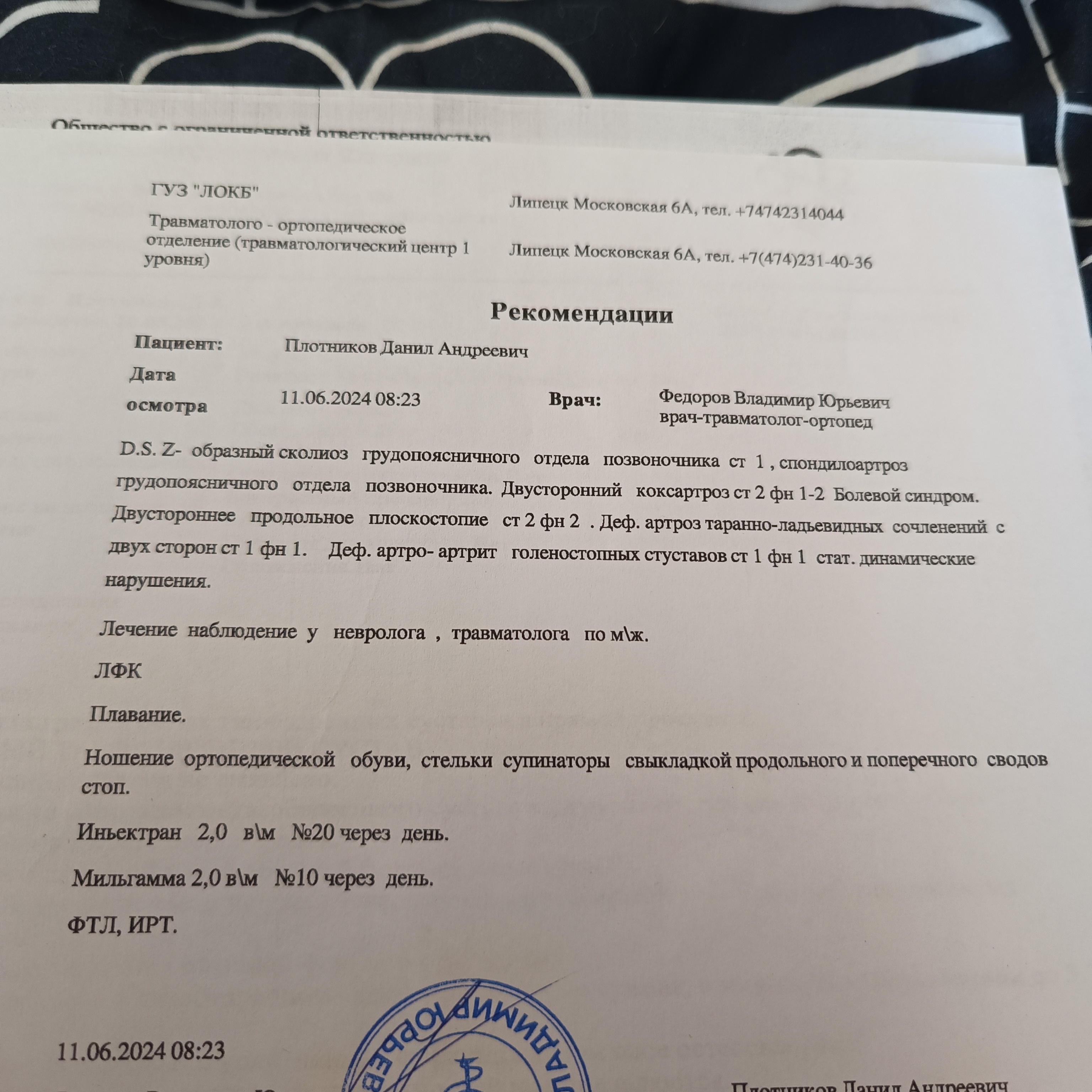 До весны 24 года наблюдал и лечил только поясницу, но начали беспокоить боли в суставах и грудном отделе позвоночника(т/б, колени, голеностоп), сделал рентген, в описании коксартроз 2 степени с двух сторон, Z-образный сколиоз 1 степени, деф.артроз голеностоп с двух сторон, 2 степень плоскостопия поперечного с мелкими остеофитами и пяточной шпорой. Ортопед подтвердил, написал диагноз, болевой синдром, функциональные и с/д нарушения(документы прилагаю).