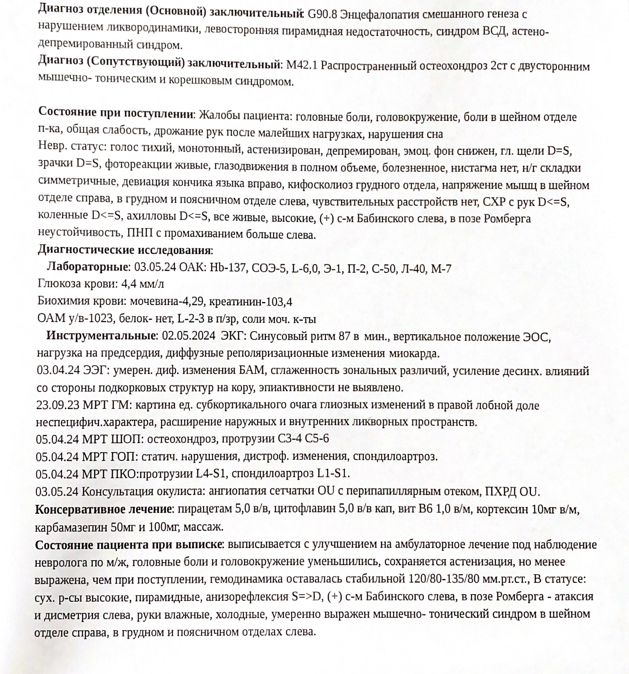 Основной: G90.8 Энцефалопатия смешанного генеза с нарушением ликвородинамики, левосторонняя пирамидная недостаточность, синдром ВСД, астено-депремированный синдром.