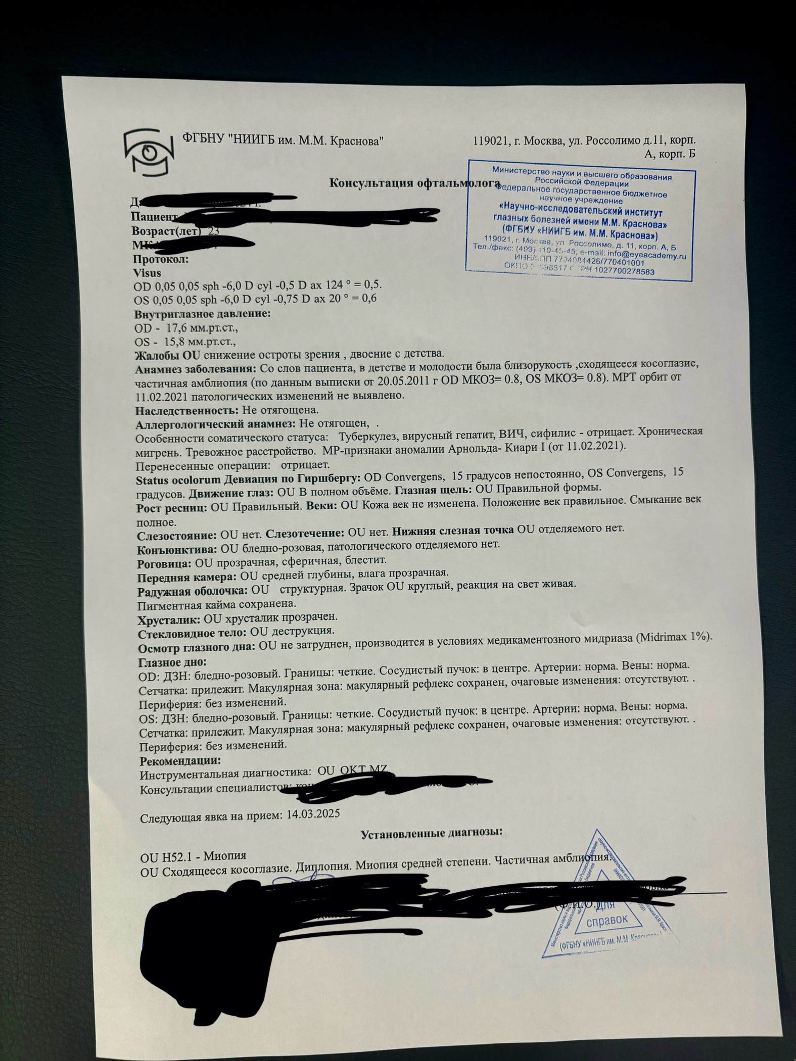 Правильно понимаю, что предварительно по результатам (без проверки с расширенным зрачком) нет перспектив по ст. 34? Поэтому лучше ссылаться по косоглазию с диплопией?