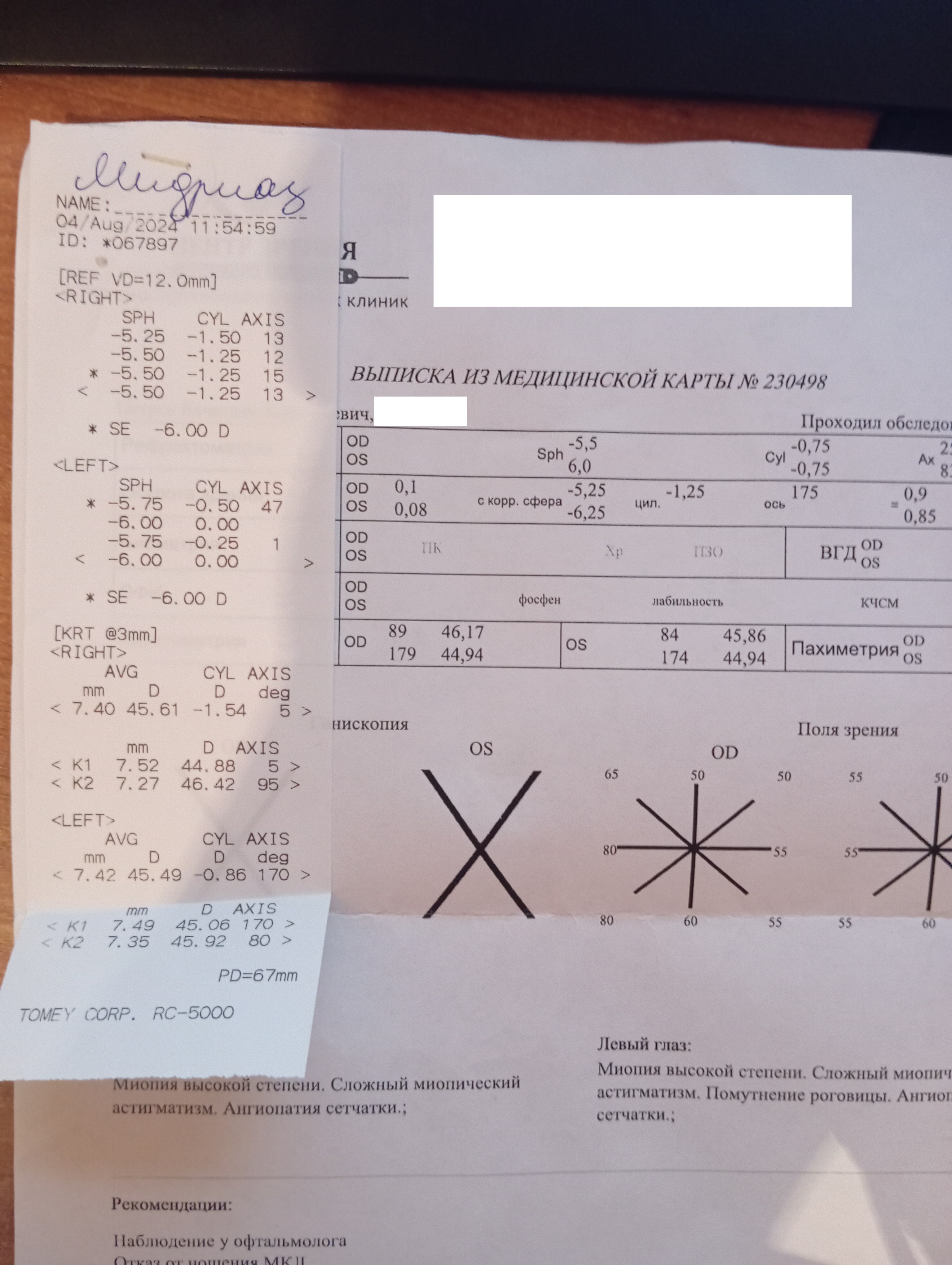 mexanik_123 писал(а):Хотел еще уточнить насчет параметра SE он у меня на оба глаза -6, но на правом глазу sph -5,5 cyl -1,25 то есть если сложить получится -6,75, вот вопрос врач будет акцентировать на параметр SE или все таки -6,75. Еще к дополнению, присутствует заболевания аномалия Арнольда Киари, на это будут обращать внимание или нет?