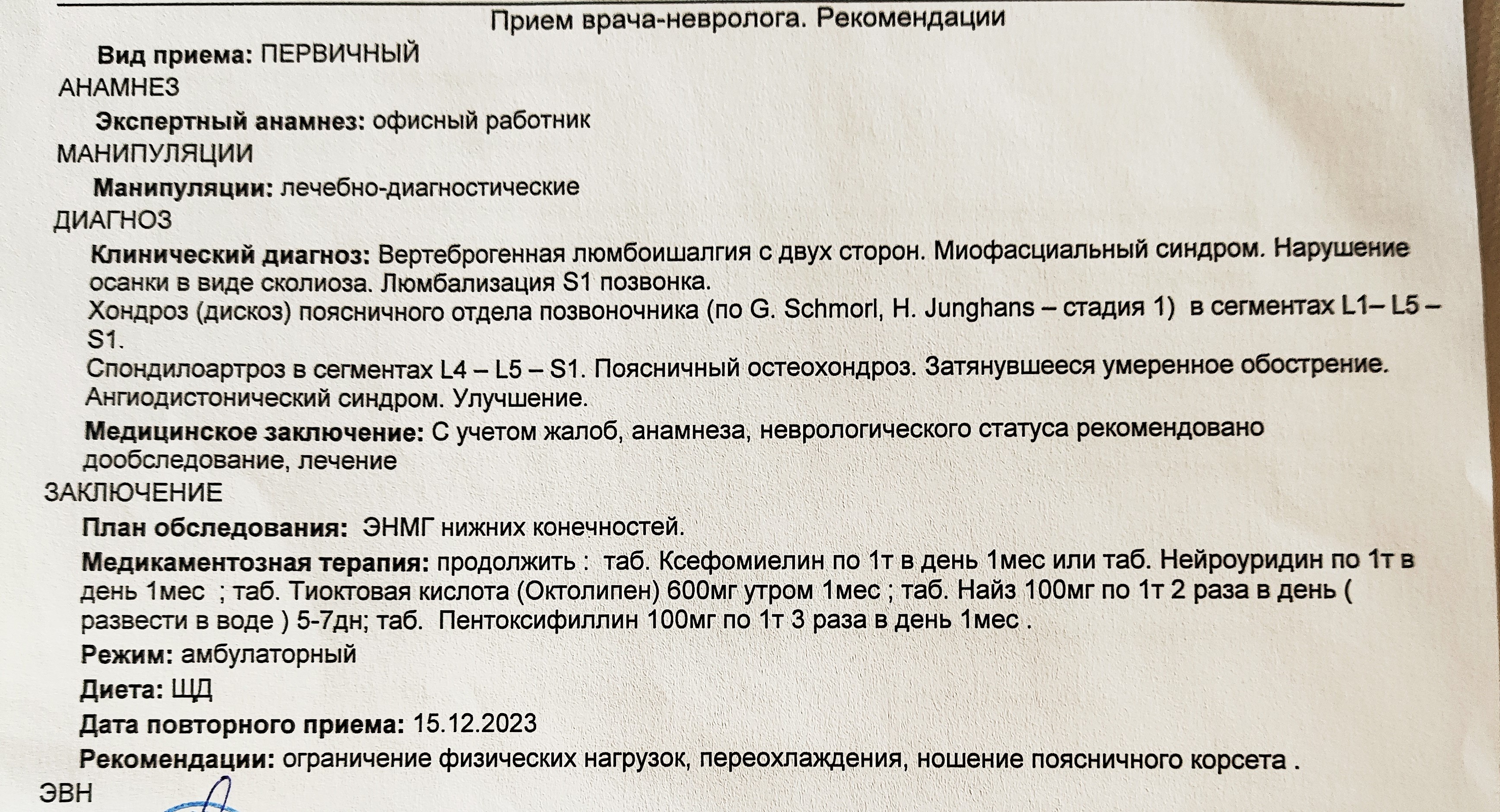 По спине снова пойду к врачу, ибо спустя год боли не прошли, только с онемением все лучше - его нет. Прикладываю документы: