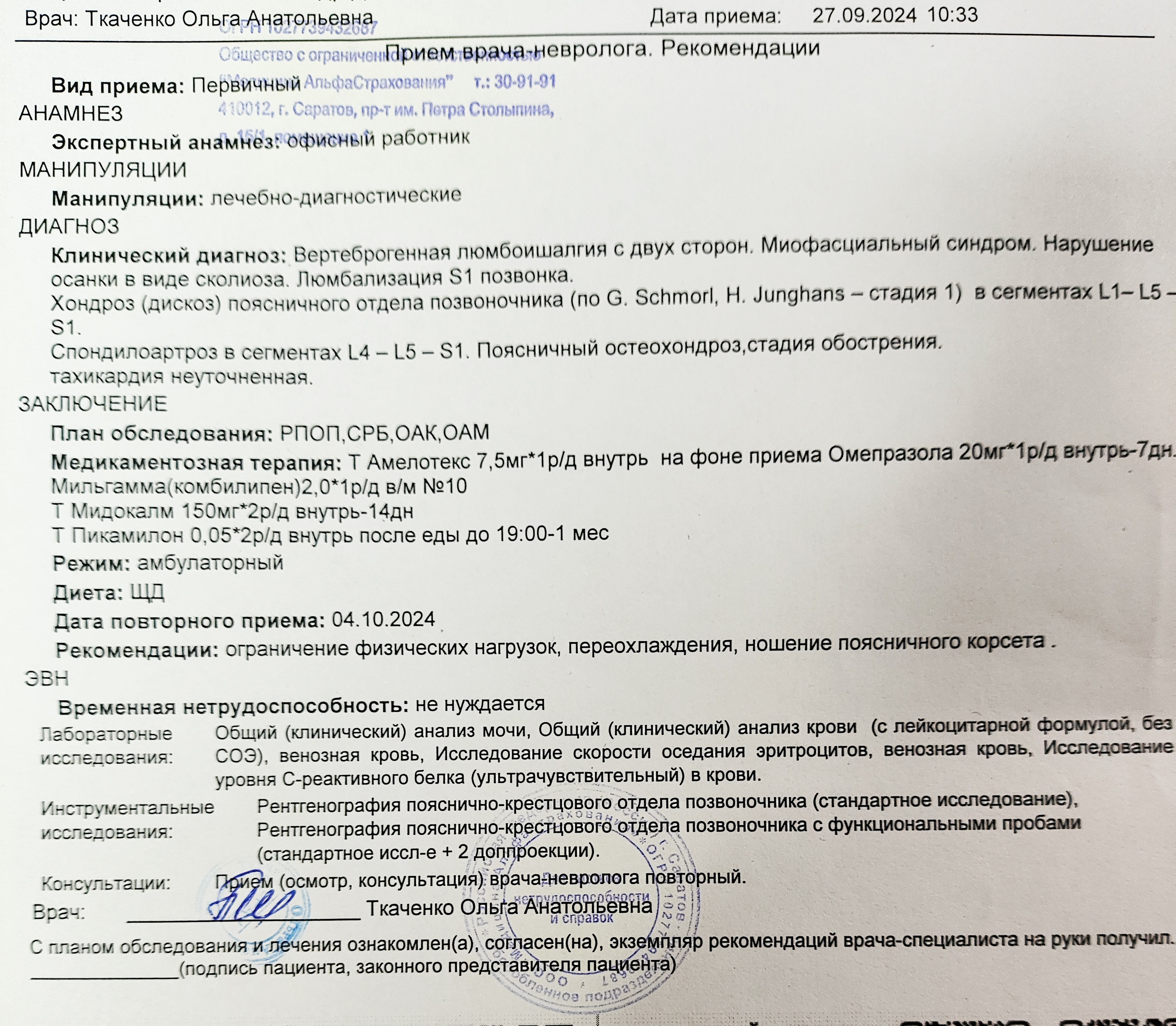 Прикладываю новое обследование от невролога плюс новый рентген, был сделан после направления от невролога: