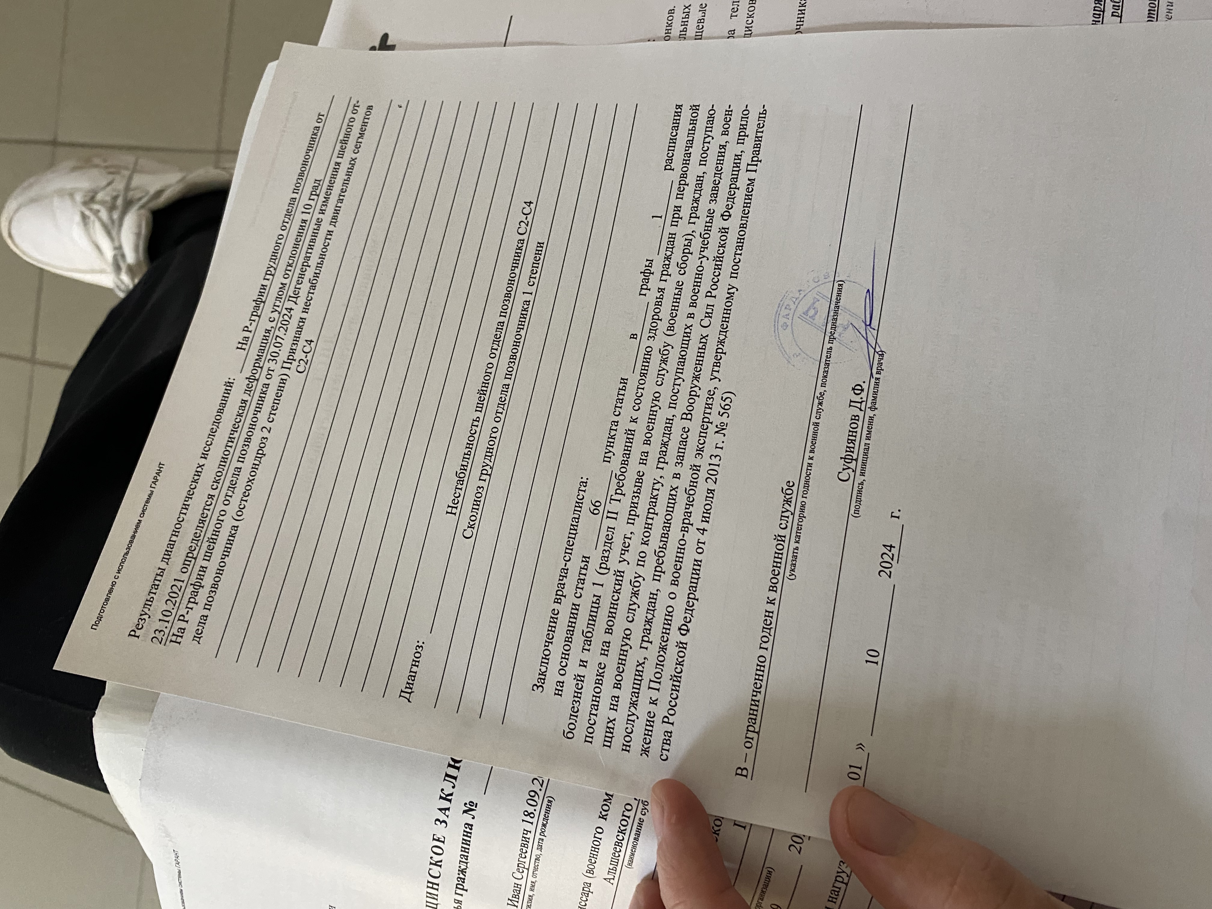 Ivan000 писал(а):Пришел в военкомат с нестабильностью шейных позвонков 3мм сначала думал нужно сходить к неврологу с этим , но невролог отправил к хирургу , сидел у хирурга минут 40 он написал мне категорию В и сказал на призывной комиссии посмотрим