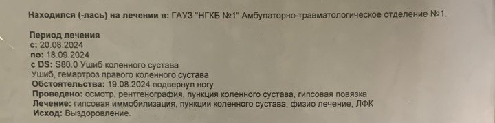 Лечение: гипсовая иммобилизация, пункции коленного сустава, физио лечение, ЛФК. Исход: Выздоровление.