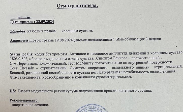Посмотрели на описание МРТ ,сказали фигня и выписали. Записались на прием к ортопеду в поликлинику - через месяц. Решили еще сходить в частную клинику. Осмотр ортопеда прилагаю.