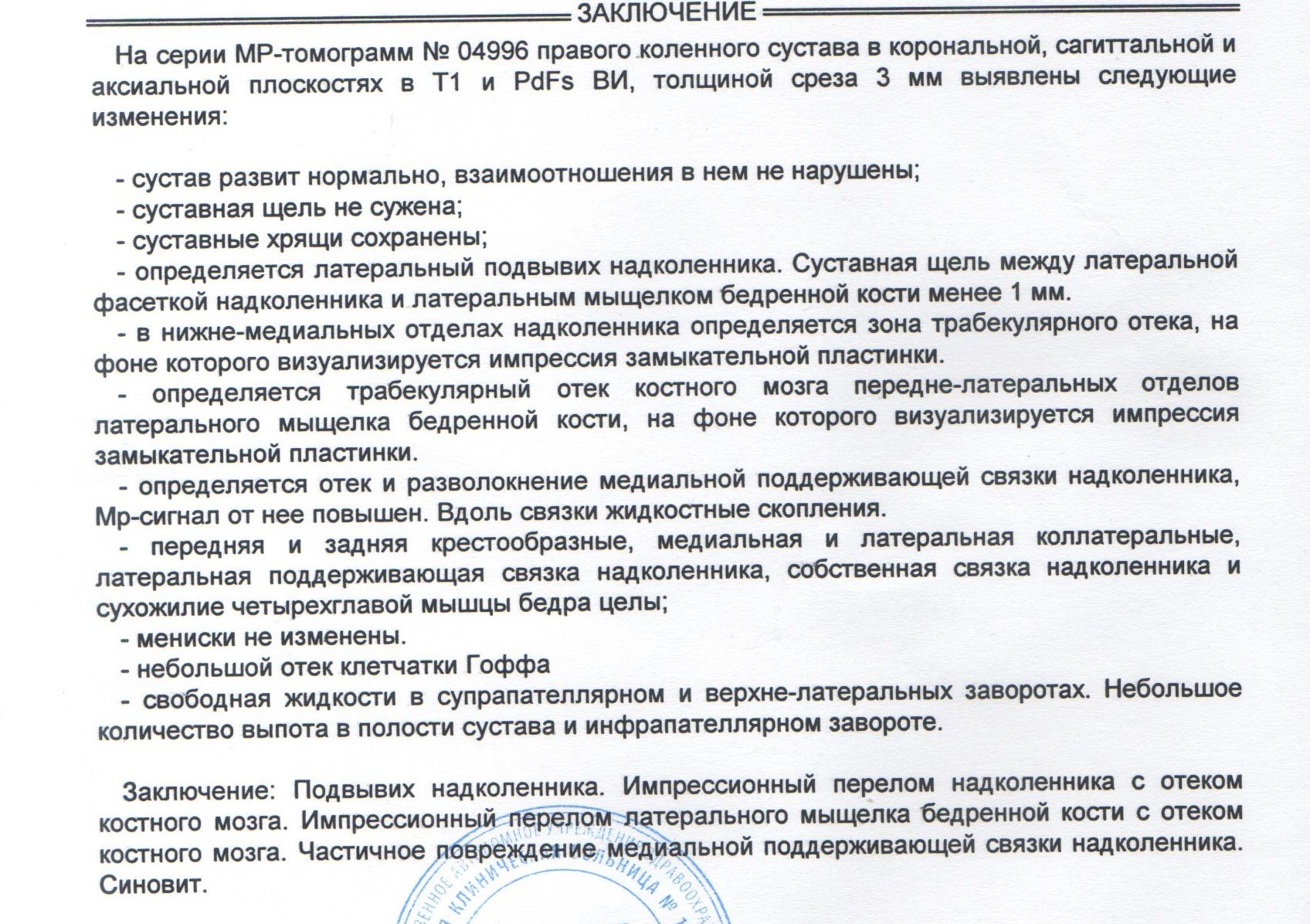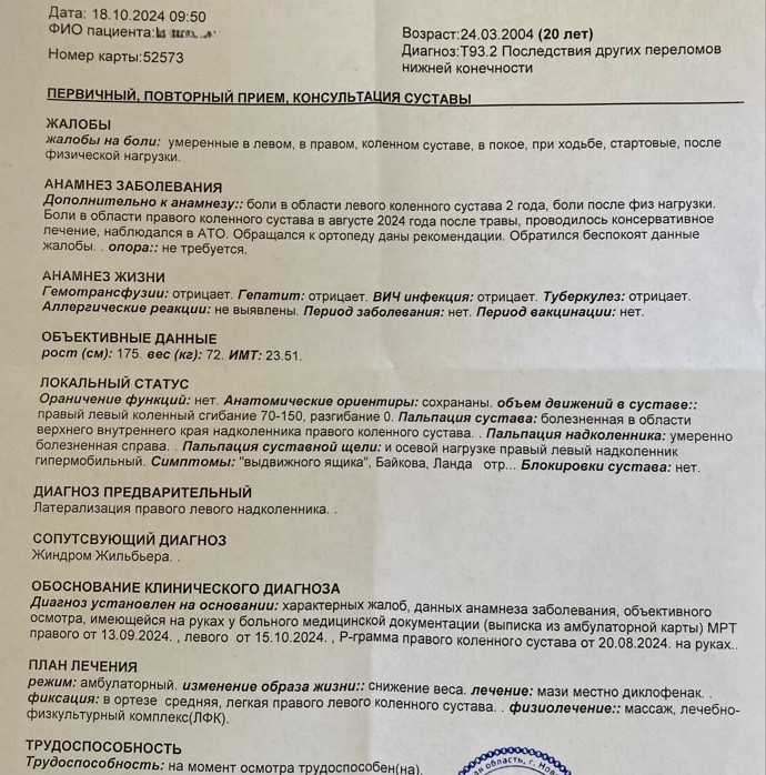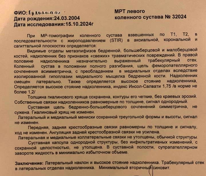 Сегодня посетил поликлинику, где врач его полностью игнорировал, сказал, что мрт - фигня, что он здоров. Правую ногу вообще не смотрел. Сын пожаловался на левое колено, которое иногда блокируется при физических нагрузках, щелкает и смещается. В результате приема получили на руки запись в карточке и направление на МРТ левого сустава.