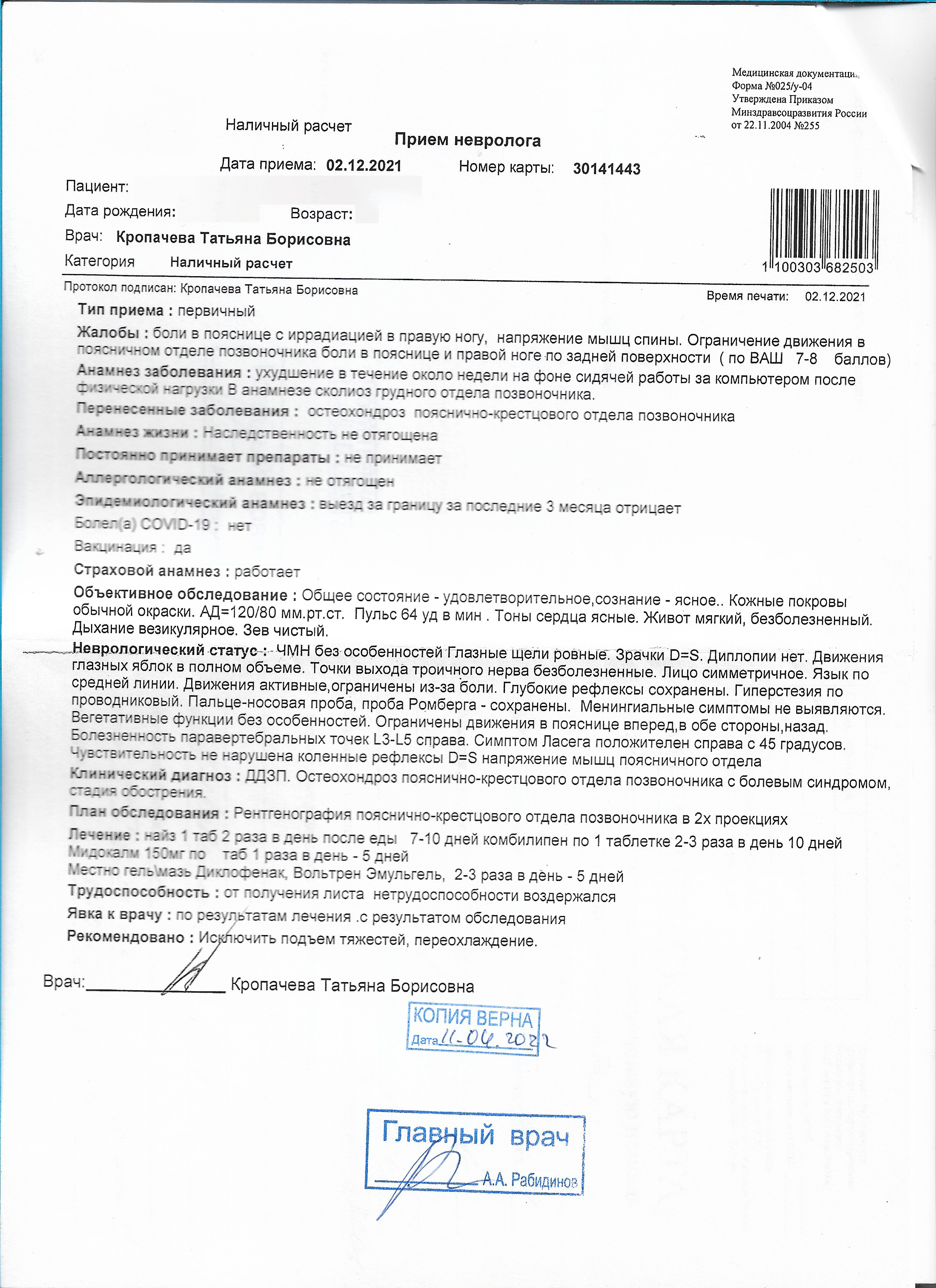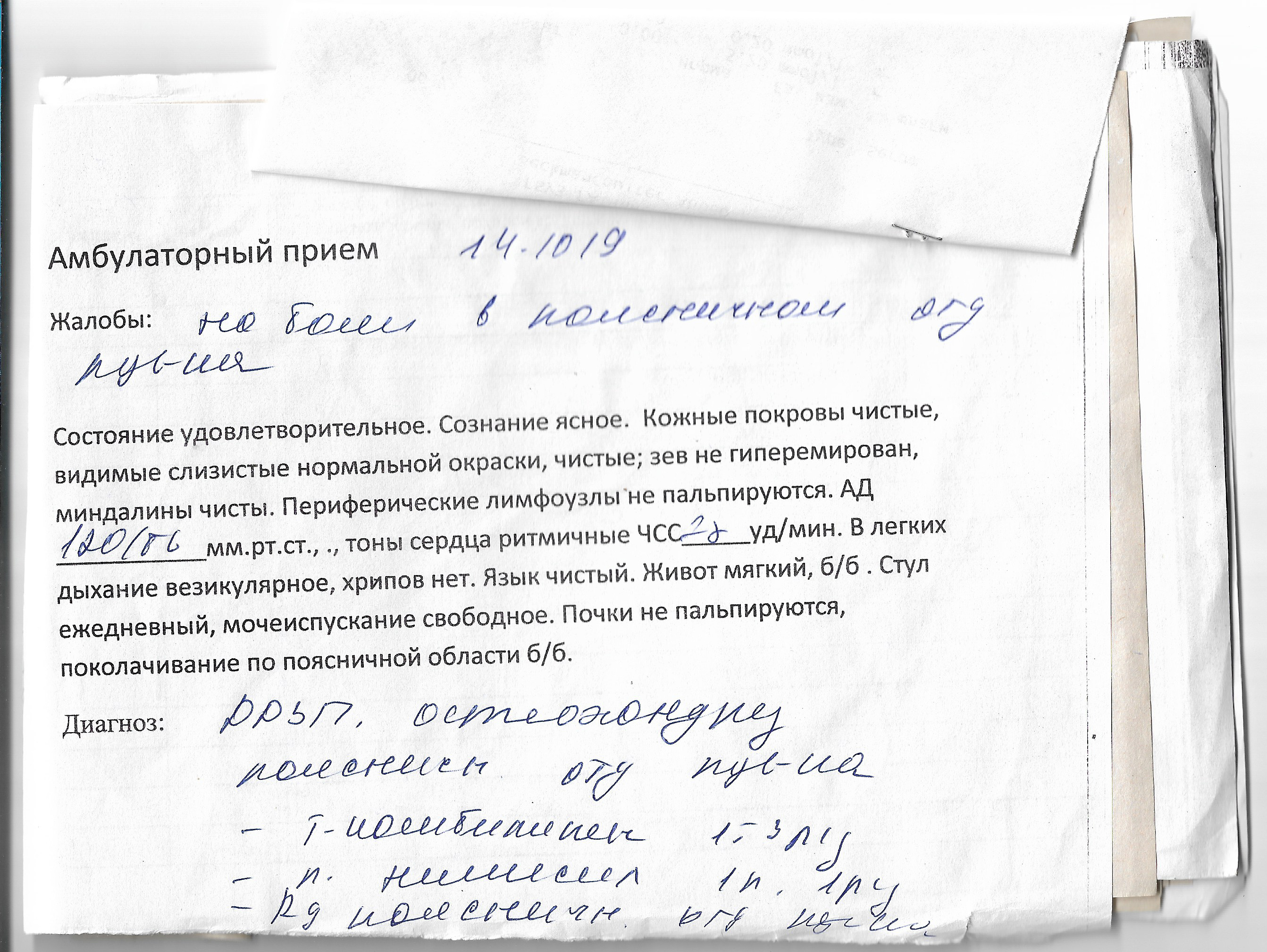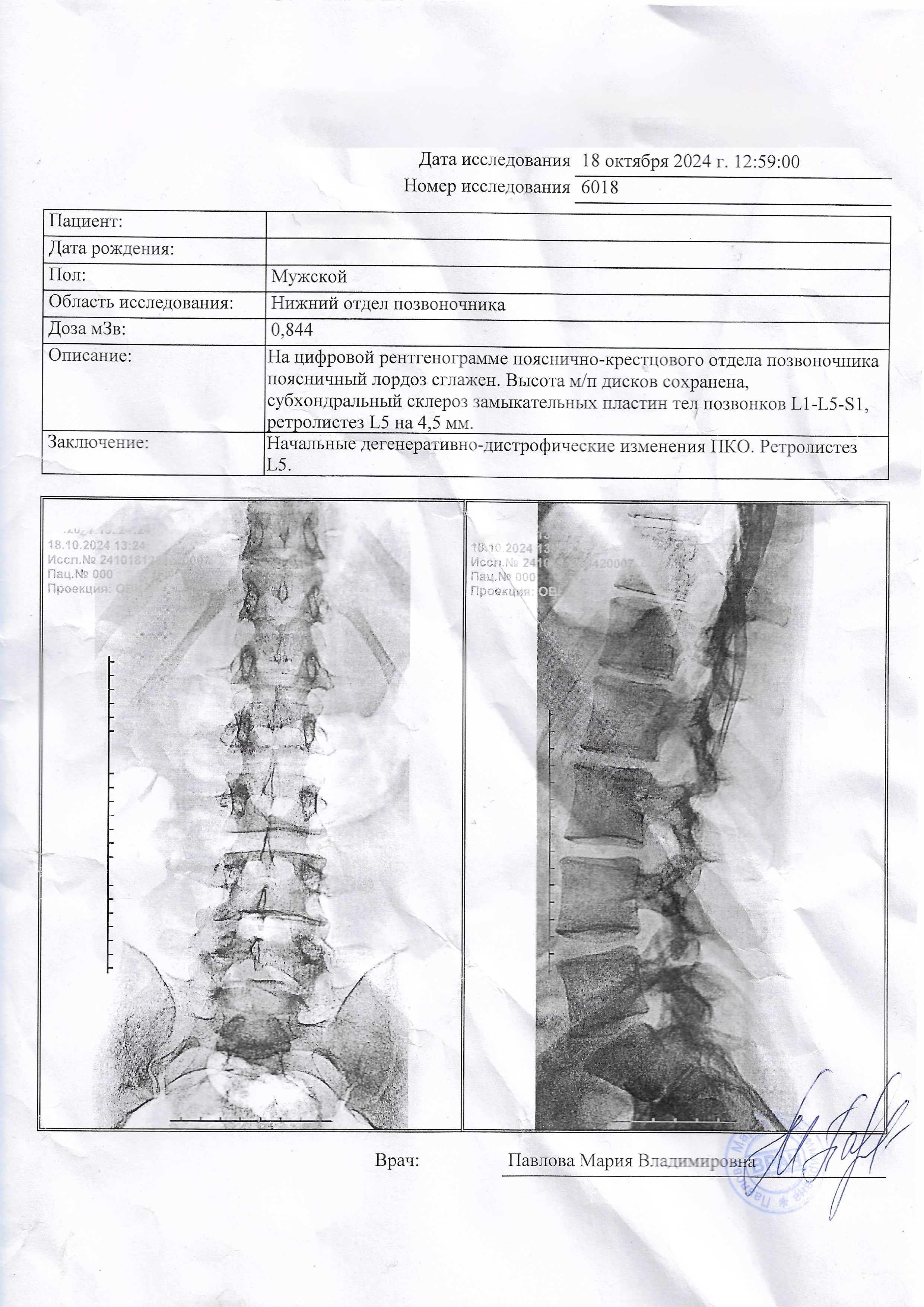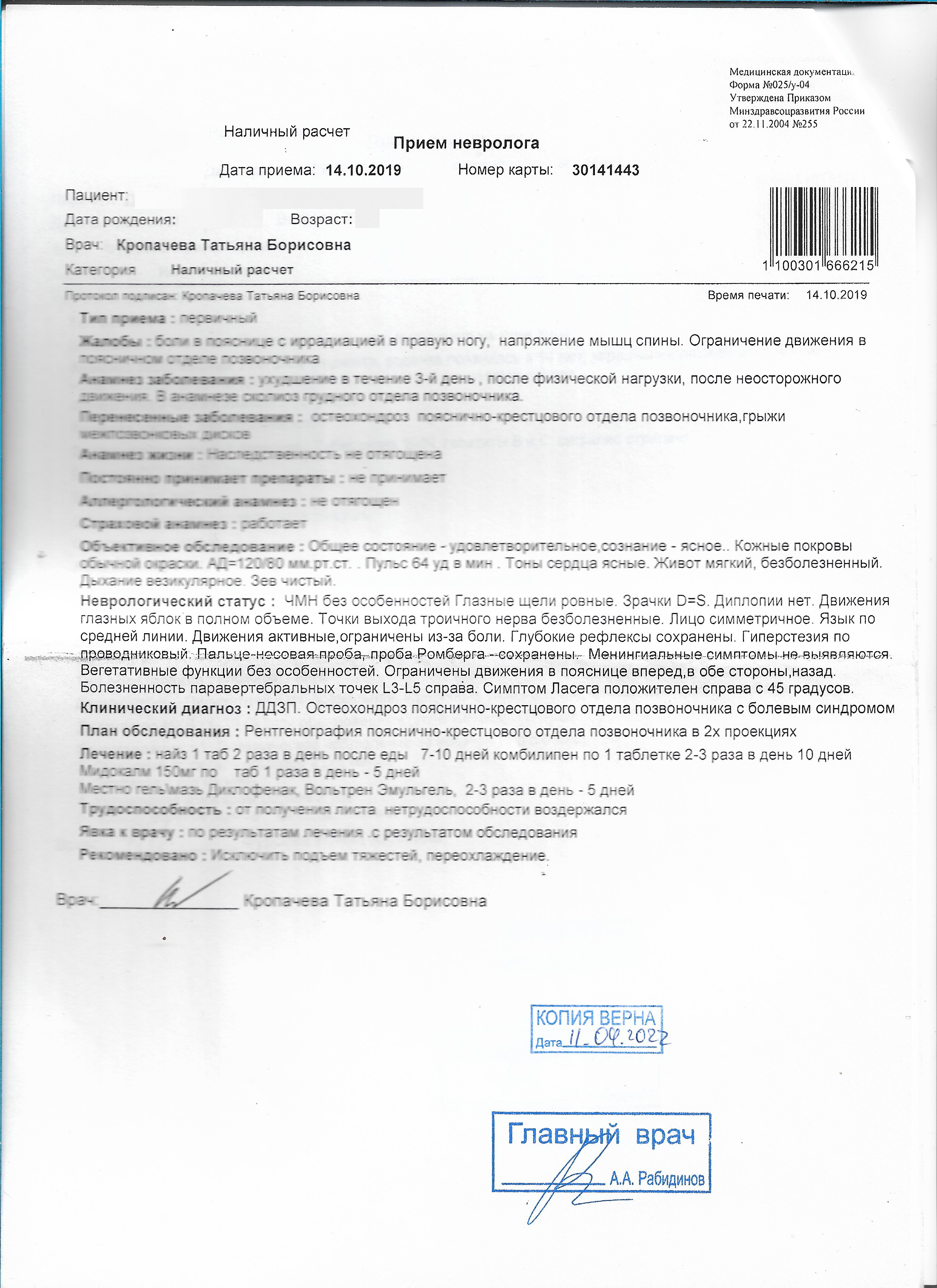 С 2018 года начала беспокоить спина. Документально следы этого берут начало с 2019 года.