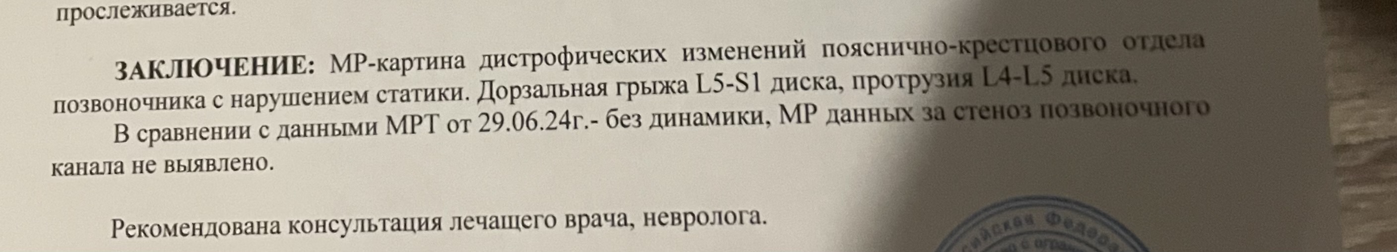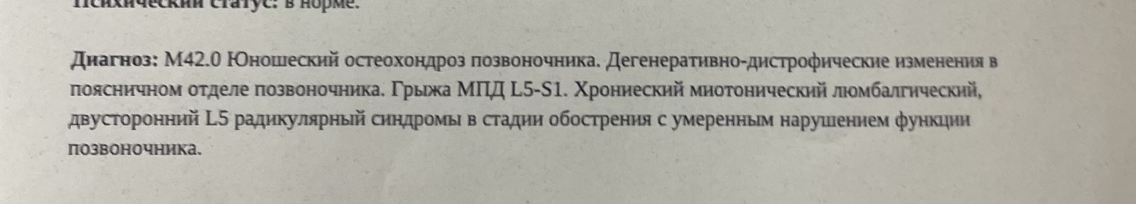 Диагноз: М42.0 Юношеский остеохондроз позвоночника. Дегенеративно-дистрофические изменения в поясничном отделе позвоночника. Грыжа МПД L5-S1.Стеноз позвоночного канала. Хронический