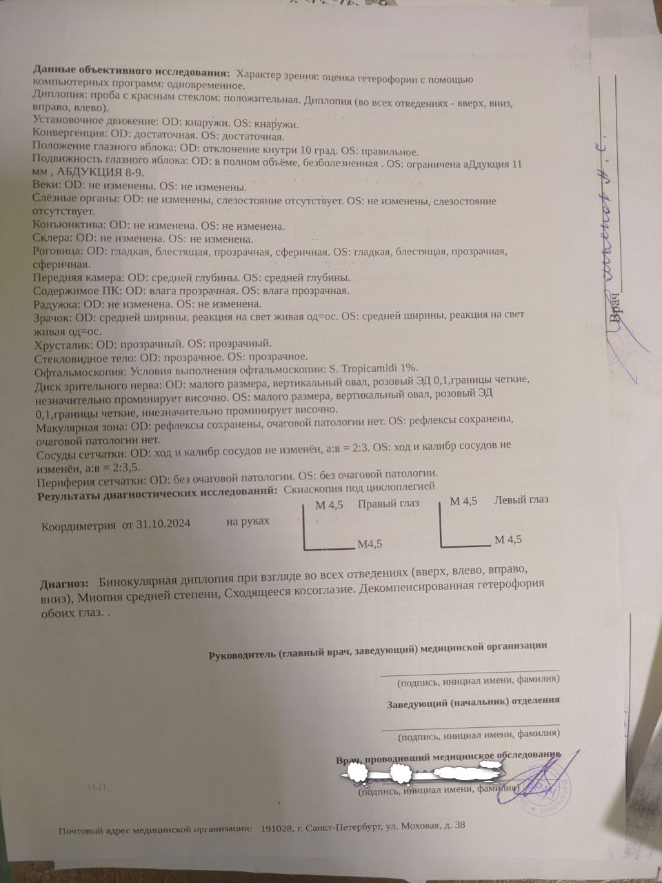 svetlana197408 писал(а):Спасибо за ответ. Уже даже и не знаем, почему врачи не уточнили направление диплопии, хотя и просили. Говорили, что это важно для освидетельствования. Они и офтальмокоордиметрию не делали, судя по заключению. хотя в направлении от военкотмата было указано. Возможно ли приобщить к акту результат коордиметрии свежий, конец апреля, но сделанной в глазной клинике на Моховой, где указана диплопия вниз. и в случае, если поставят призывную категорию только на основании акта, просить направления на КМО? На фото направление на допобследование с указанием диагноза.