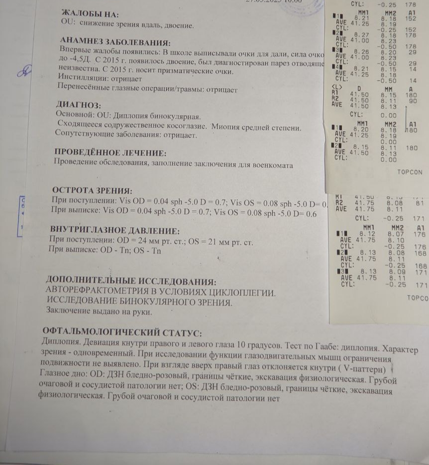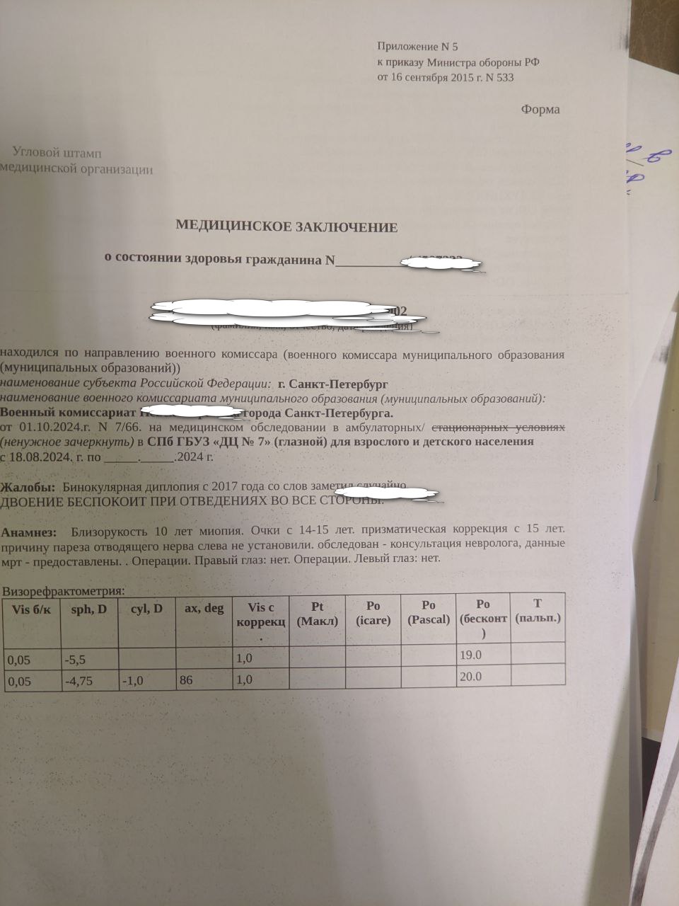 svetlana197408 писал(а):Добрый вечер. Не буду писать про историю с уведомлением РВК о подаче заявления об обжаловании решения призывной комиссии. тот еще квест. У меня вопрос по заболеванию. На основании чего делается вывод, что наличие пареза/паралича в ст.33 не обящательно, если зафиксирована бинокулярная диплопия во все стороны, в том числе и вниз. это важно, так как на предыдущем призыве парез наружной прямой мышцы был, но не было диплопии вниз. в этом призыве диплопию вниз нашли, но убрали парез. и офтальмолог на МО только на основании этого ставит призывную категорию. Ждем решения ГПК и повестку на КМО. Спасибо за подсказки.