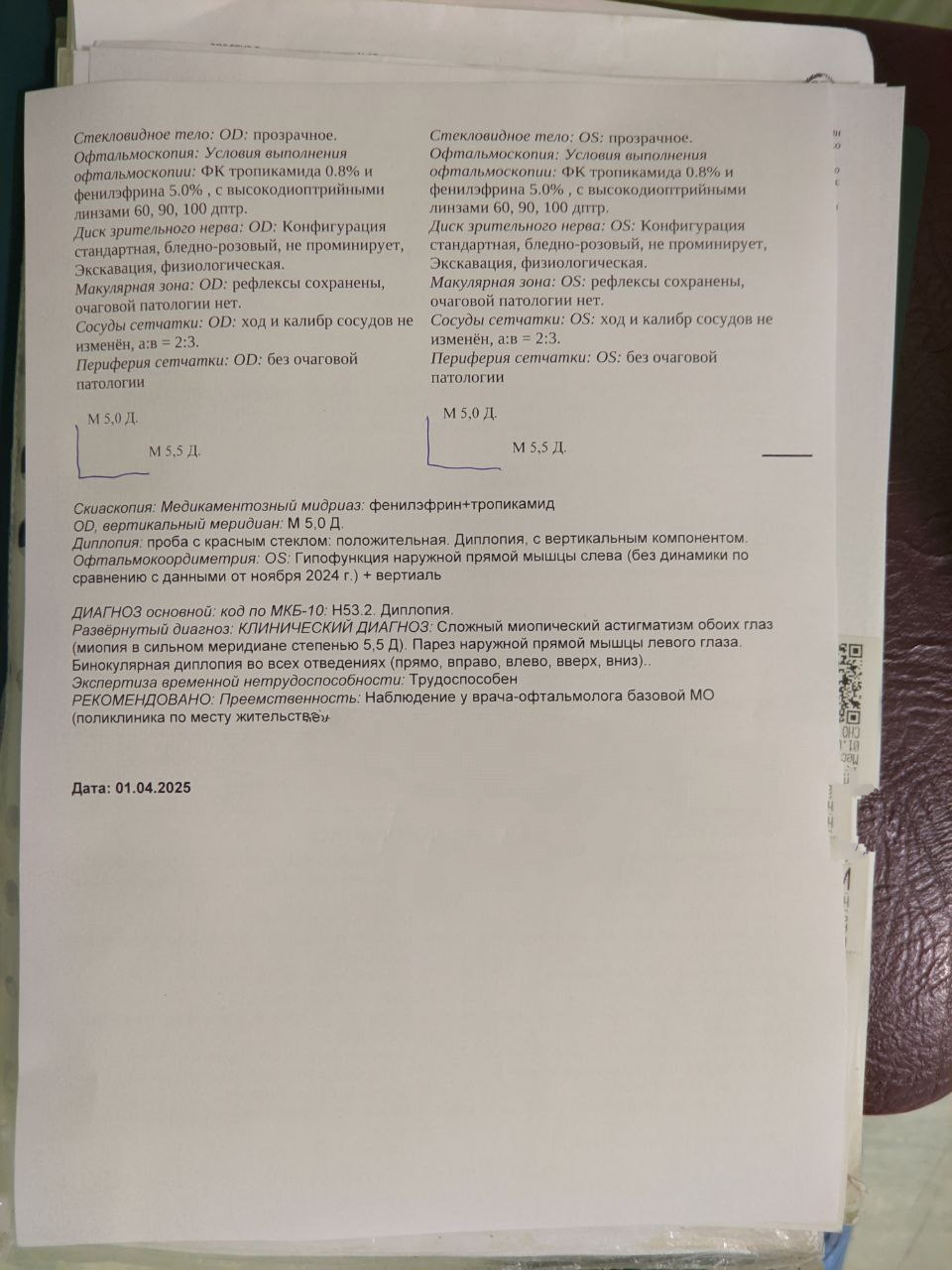 svetlana197408 писал(а):Добрый день. Подскажите, пожалуйста, можно ли рассчитывать на непризывную категорию по следующему диагнозу. "Бинокулярная диплопия при взгляде во всех отведениях (вверх, влево, вправо, вниз). Миопия средней степени. Сходящееся косоглазие. Декомпенсированная гетерофория обоих глаз. Уточняю, что это не первое обследование. В предыдущий призыв также обследовались на наличие диплопии. Но категорию выставили "Б-4". Возможно что-то не прописали в диагнозе. Спасибо.