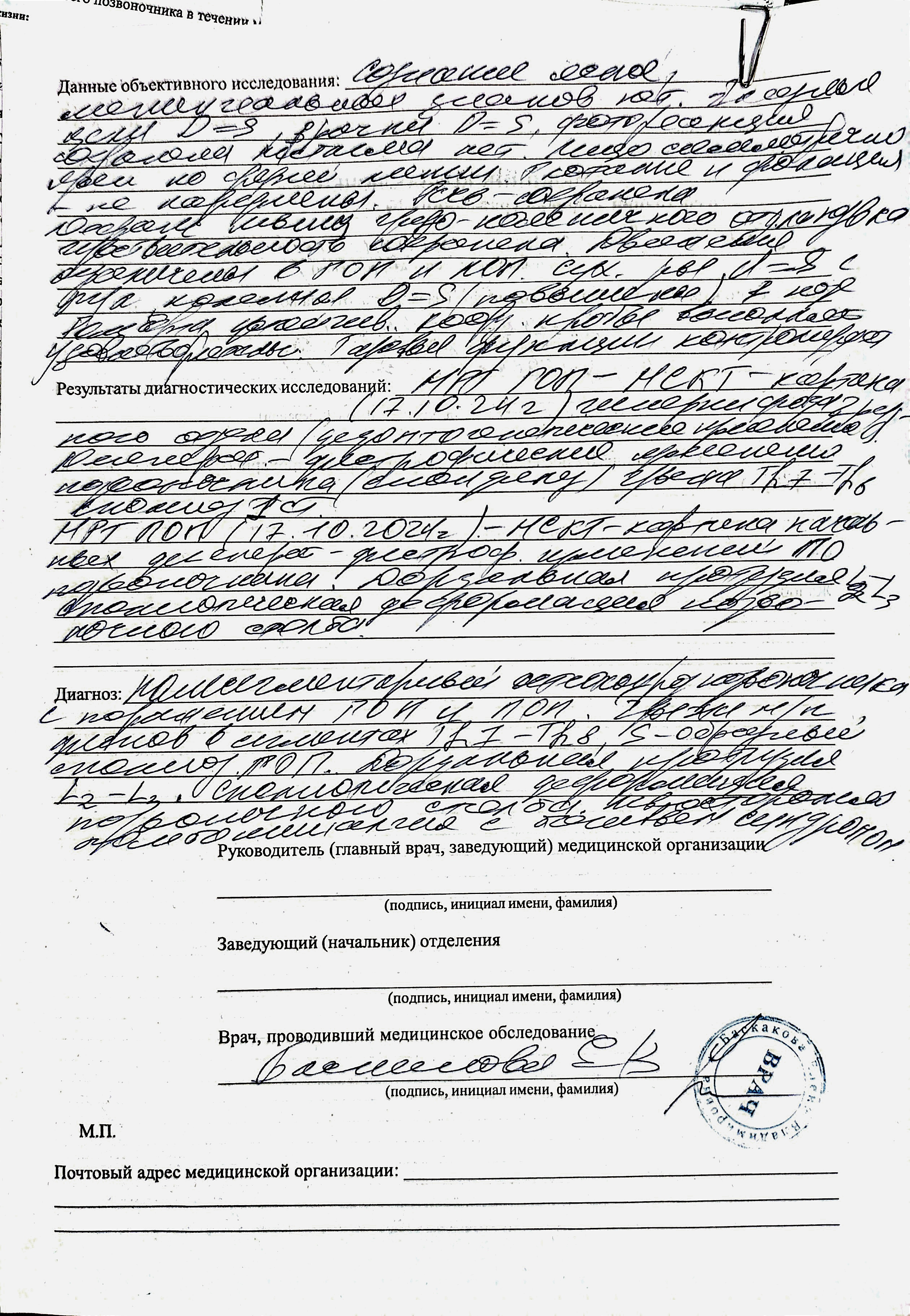 Полисегментарый остеохондроз, с поражением ГОП и ПОП, грыжи Th7-Th8, S-образный сколиоз ГОП, Дорзальная протрузия L2-L3, Сколиотичечкая деформация, позвоночного столба, левосторонняя люмбоишиалгия с болевым синдромом, ограниче движения в ГОП и ПОП отделах позвоночника, Дефанс мышц ГОП