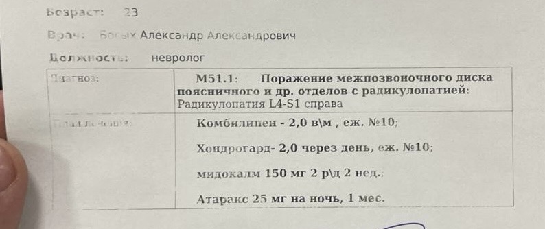 здравствуйте, у меня диагноз: М51.1, поражение межпозвоночного диска поясничного отдела и других отделов с радикулопатией. Радикулопатия L4-S1 справа.