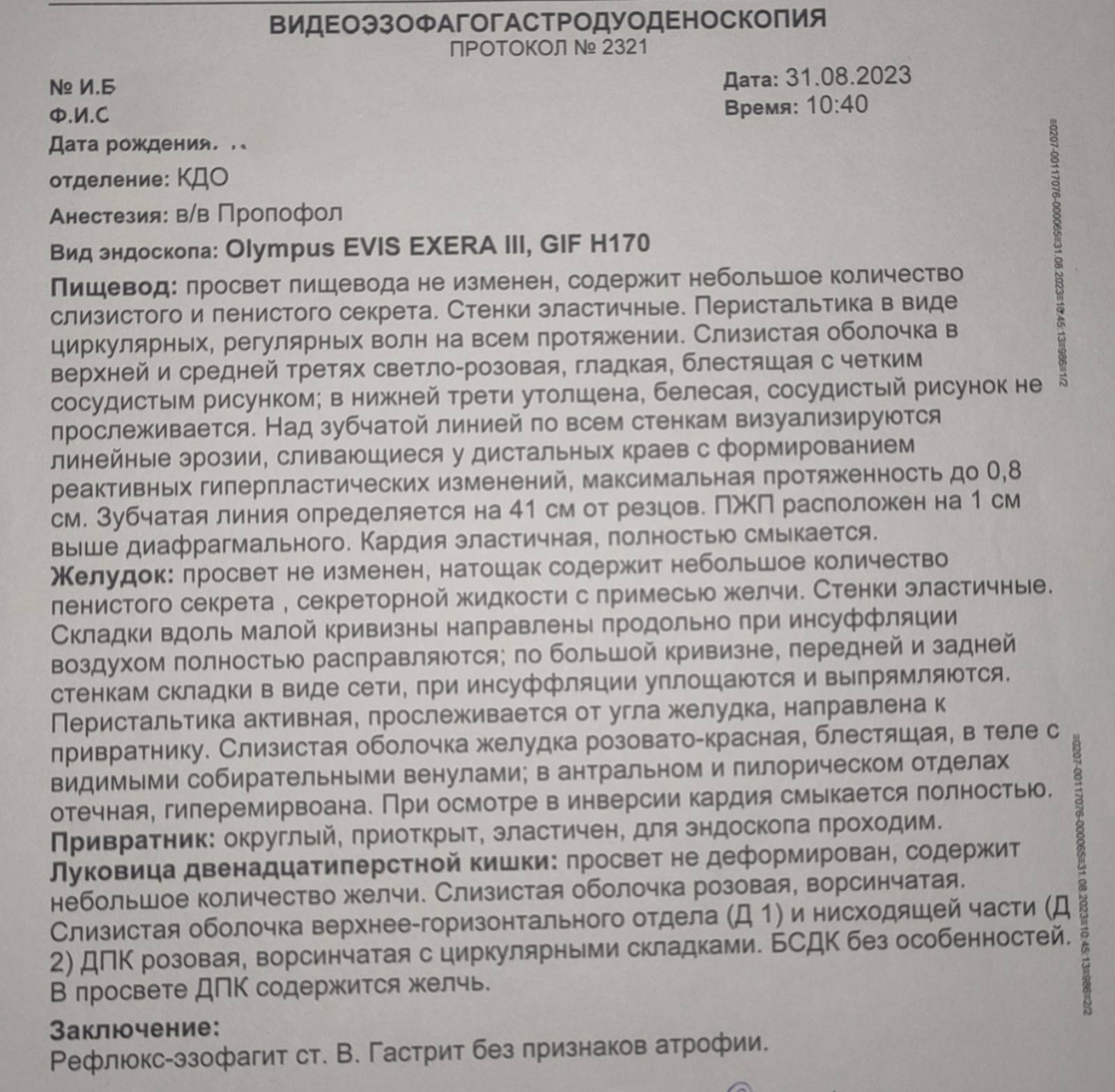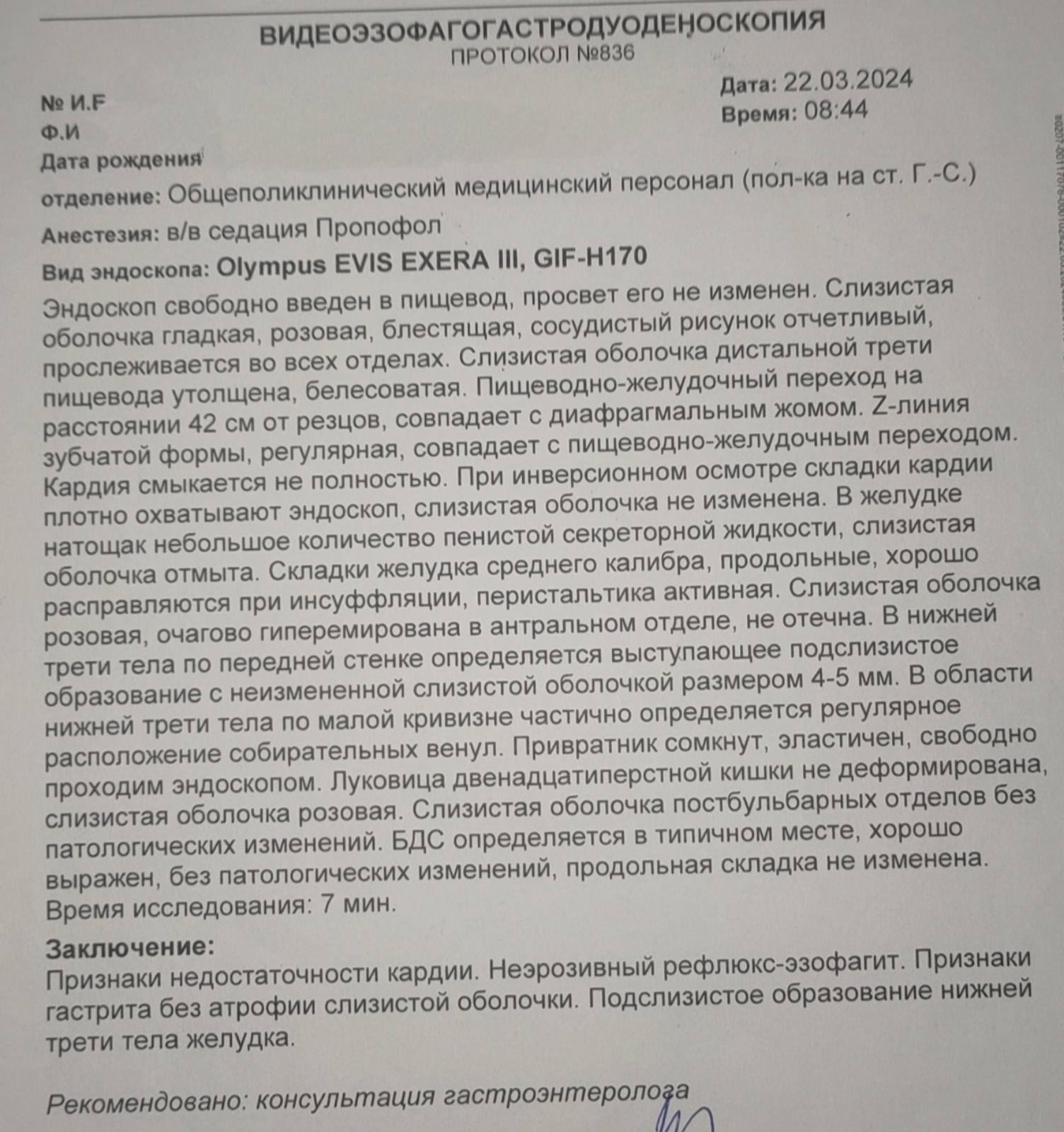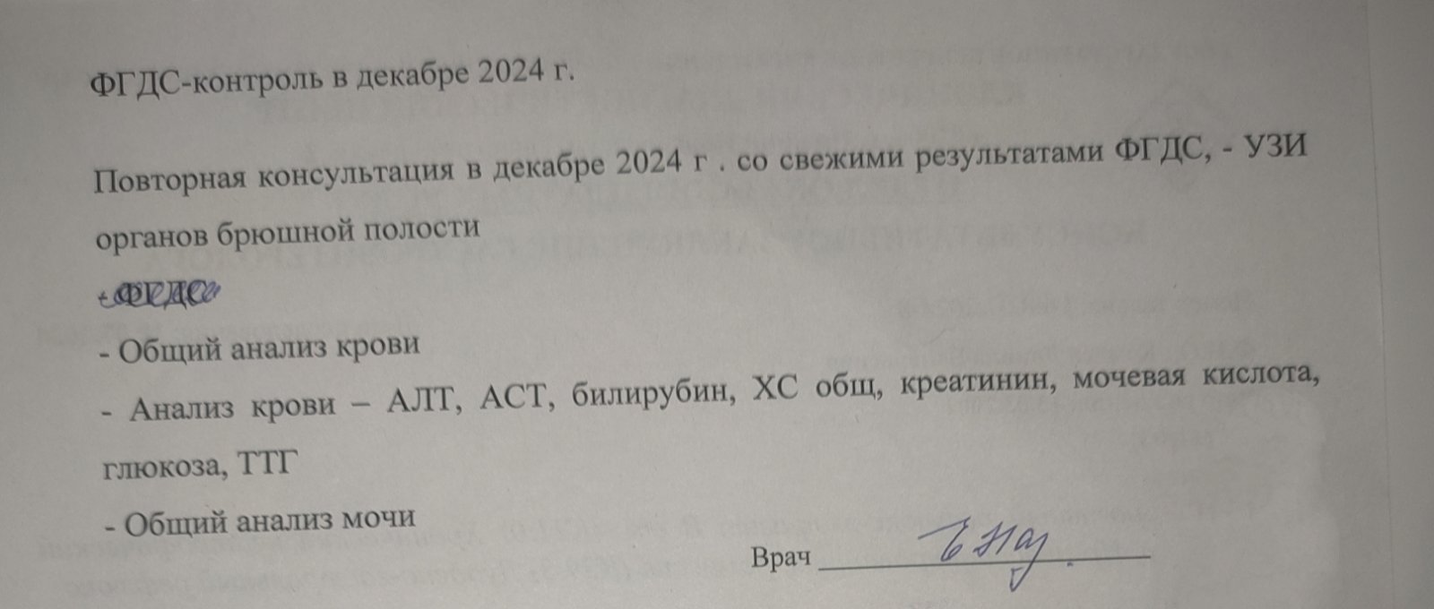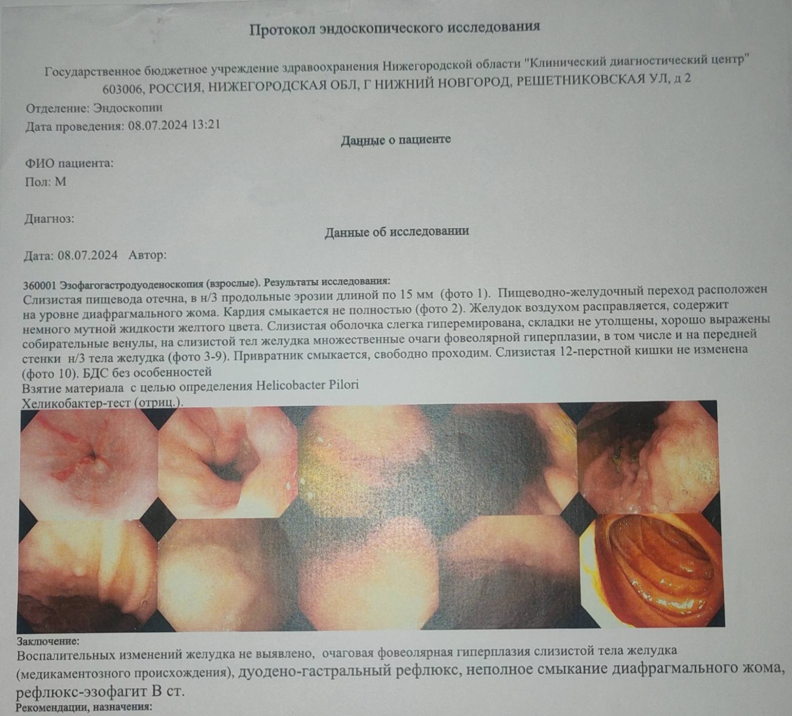 prizivniknn писал(а):Несколько лет меня беспокоили. В мае 2023 помэсле посещения гастроэнтеролога, был назначен ФГДС. Результаты показали рефлюкс-эзофагит 1-2 степени. Врач прописал курс лечения. После его завершения было проведено контрольное ФГДС, на нем были уже эрозии степени В. Гастроэнтеролог назначил новый курс. В ноябре 2023 года из-за постоянного чувства голода и болей в желудке был пройден курс стационарного лечения. В марте 2024 года было проведено ещё одно ФГДС, которое не выявило эрозий, и врач назначил поддерживающую терапию. 6 июля была проведена ЭГДС, на котором спустя 3,5 месяца вновь были выявлены эрозии степени В, вновь был назначен курс лечения . В сентябре я снова посетил врача из-за недостаточности текущего лечения , в виде изжоги и быстро наступающего чувства голода.
