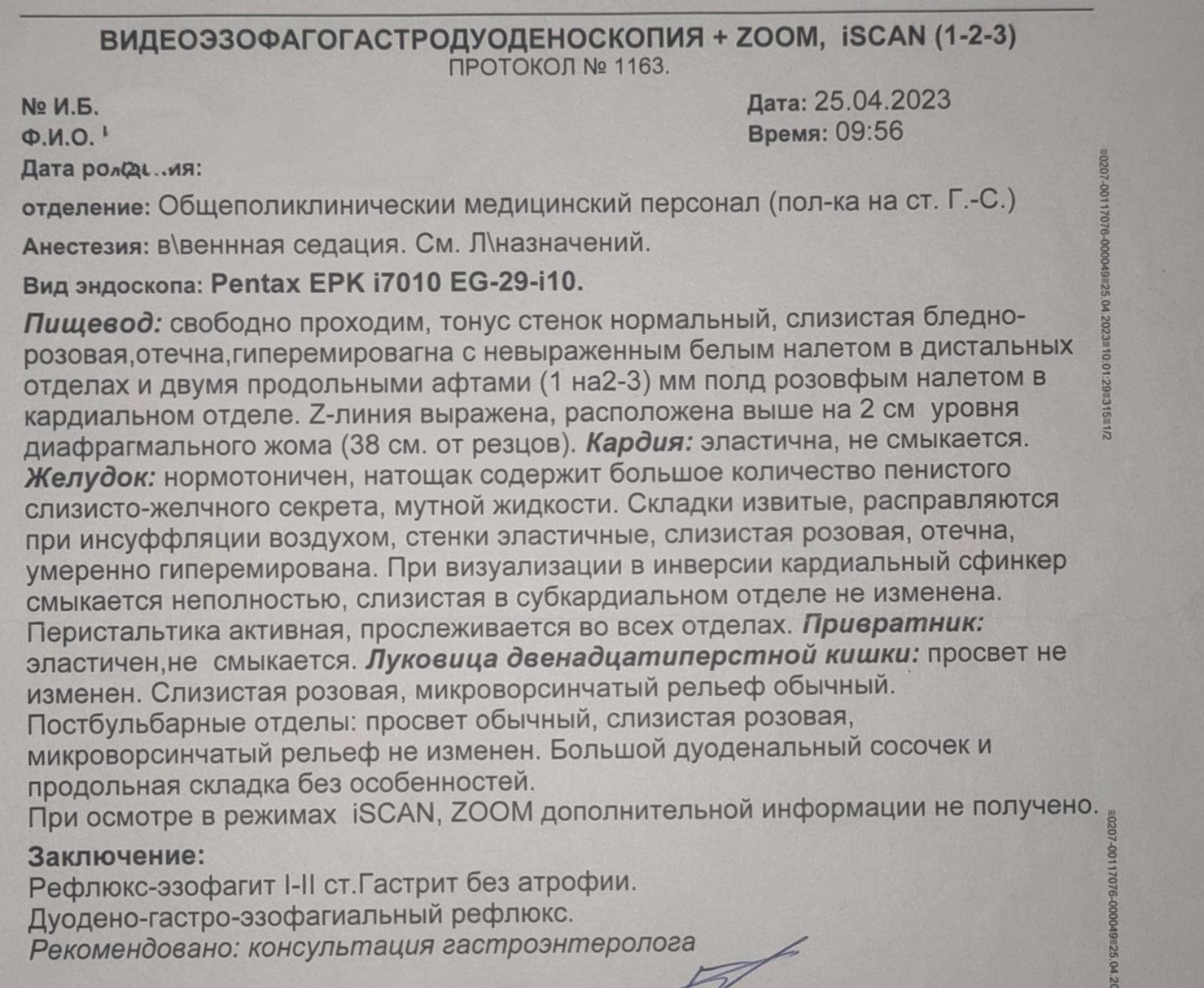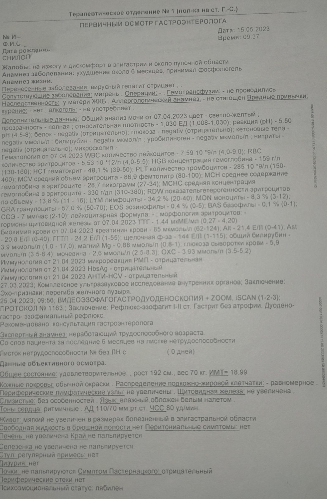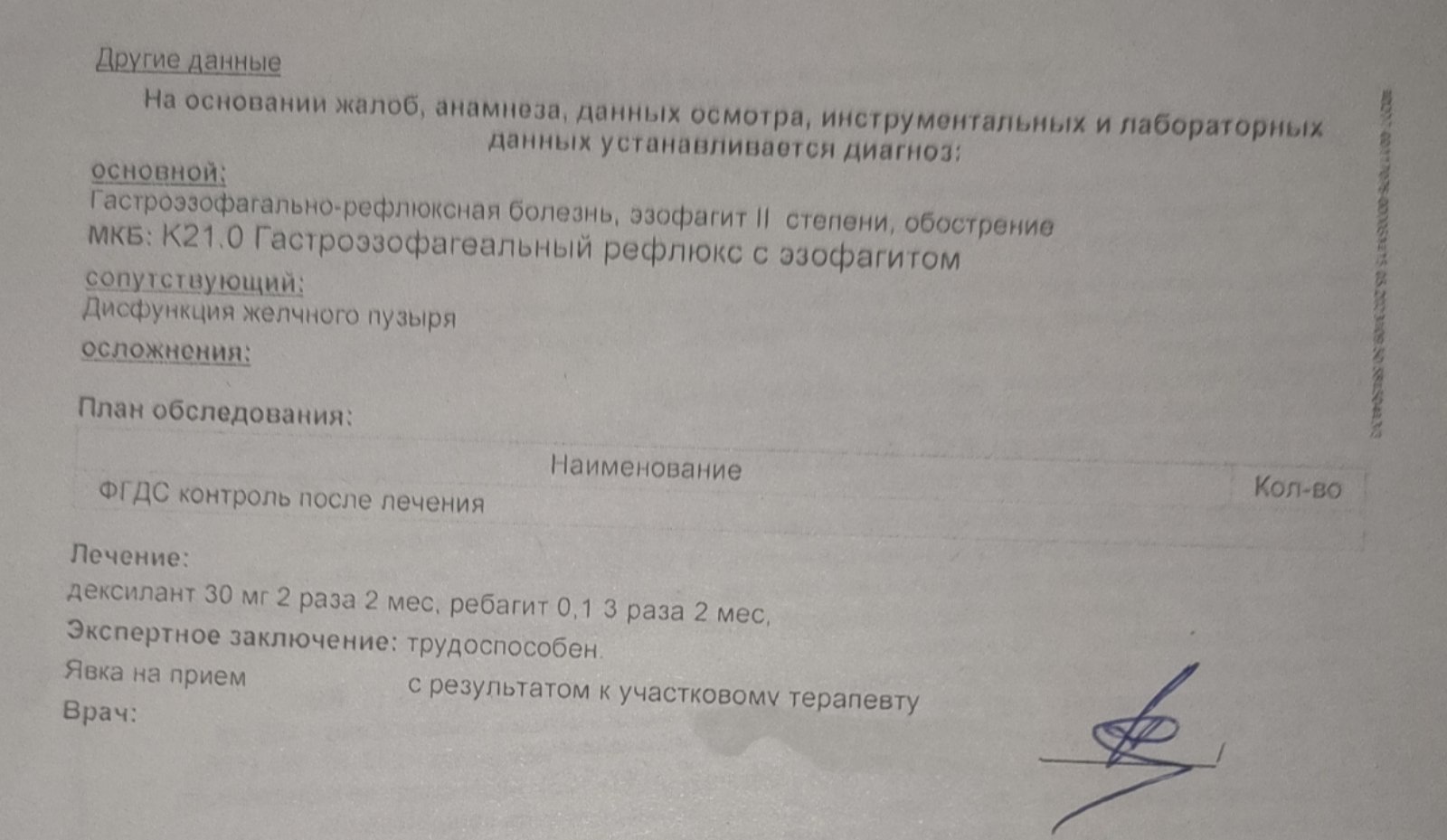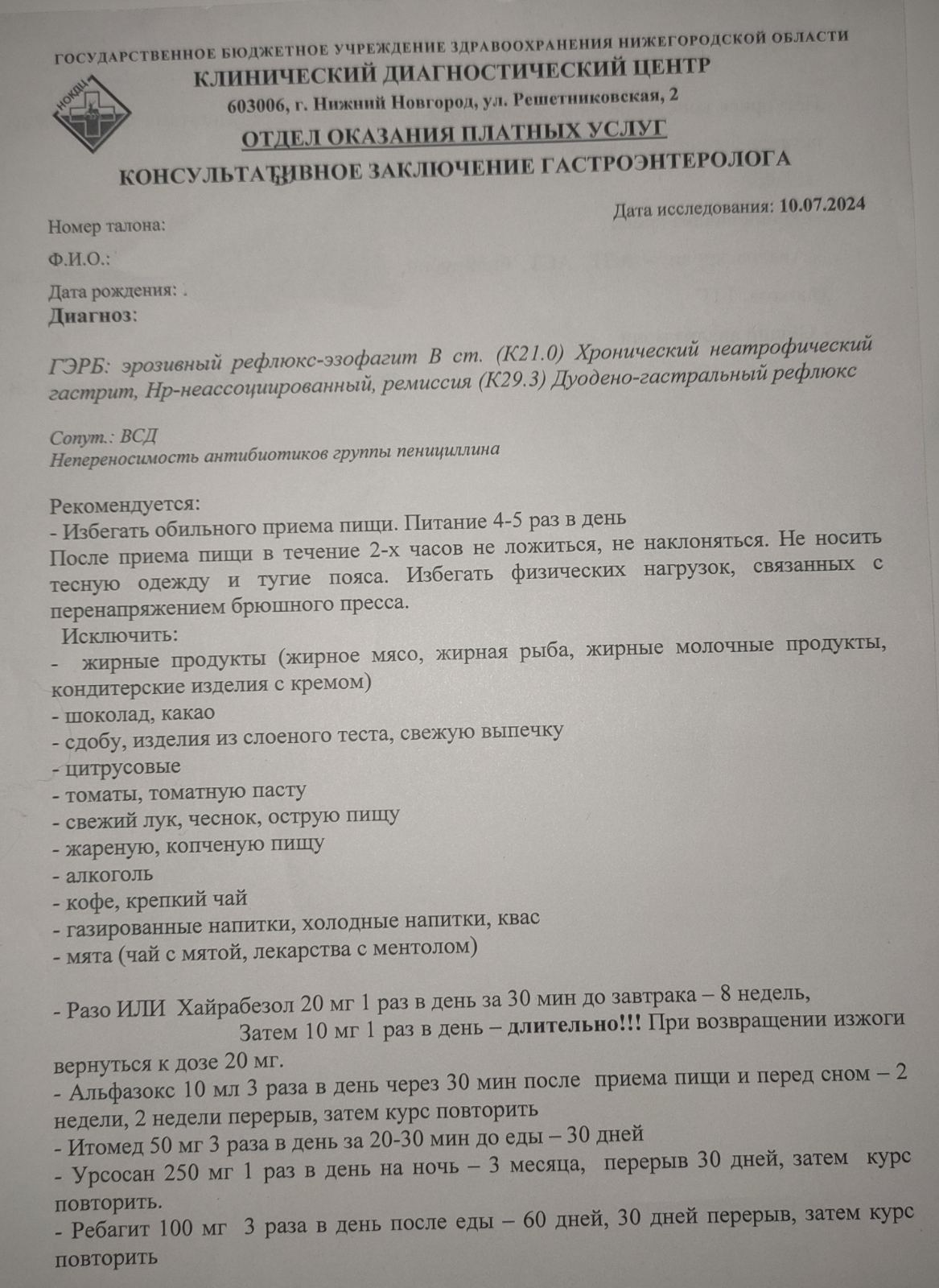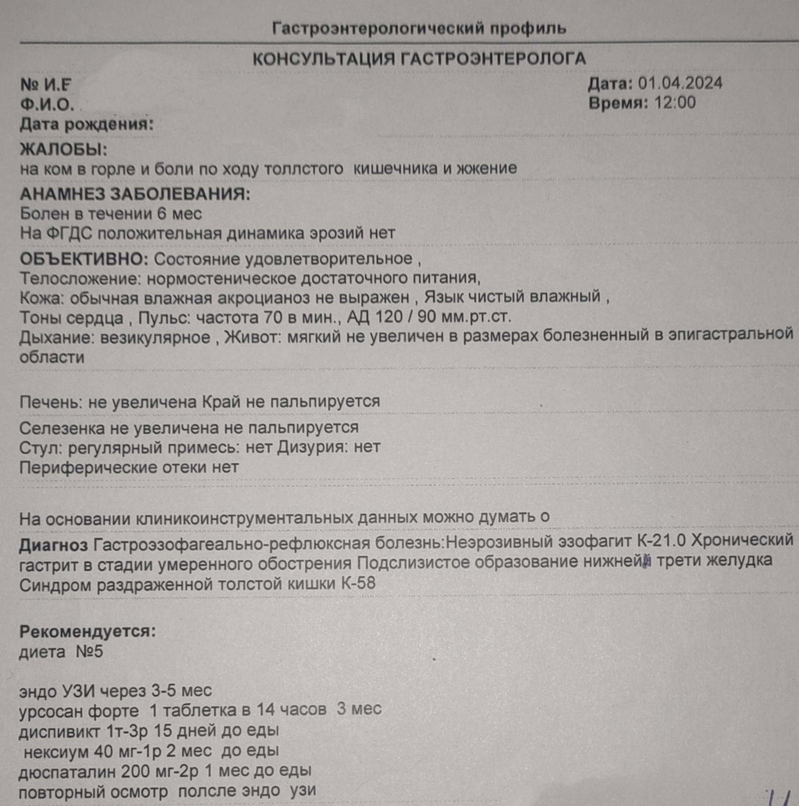 prizivniknn писал(а):Несколько лет меня беспокоили. В мае 2023 помэсле посещения гастроэнтеролога, был назначен ФГДС. Результаты показали рефлюкс-эзофагит 1-2 степени. Врач прописал курс лечения. После его завершения было проведено контрольное ФГДС, на нем были уже эрозии степени В. Гастроэнтеролог назначил новый курс. В ноябре 2023 года из-за постоянного чувства голода и болей в желудке был пройден курс стационарного лечения. В марте 2024 года было проведено ещё одно ФГДС, которое не выявило эрозий, и врач назначил поддерживающую терапию. 6 июля была проведена ЭГДС, на котором спустя 3,5 месяца вновь были выявлены эрозии степени В, вновь был назначен курс лечения . В сентябре я снова посетил врача из-за недостаточности текущего лечения , в виде изжоги и быстро наступающего чувства голода.