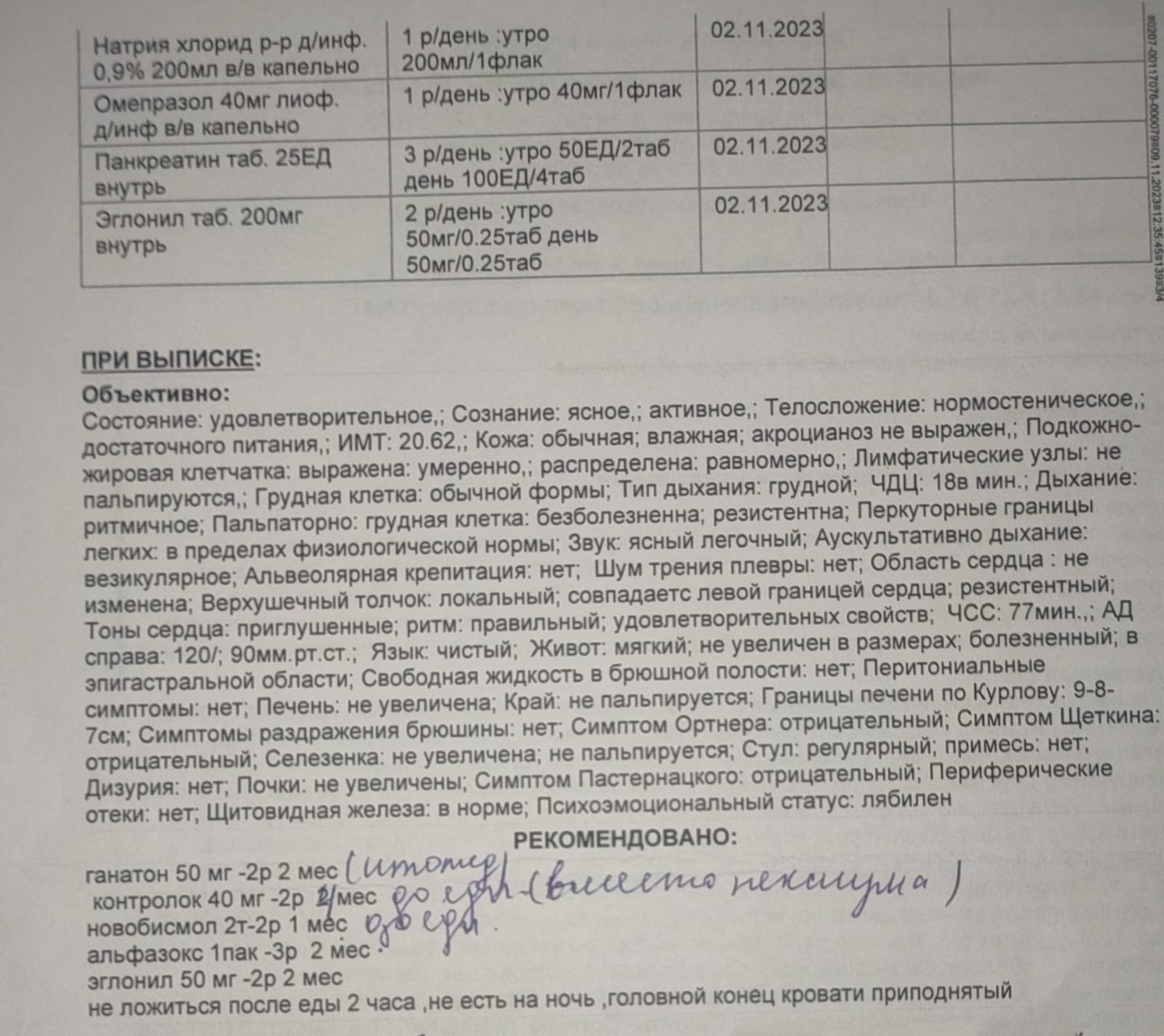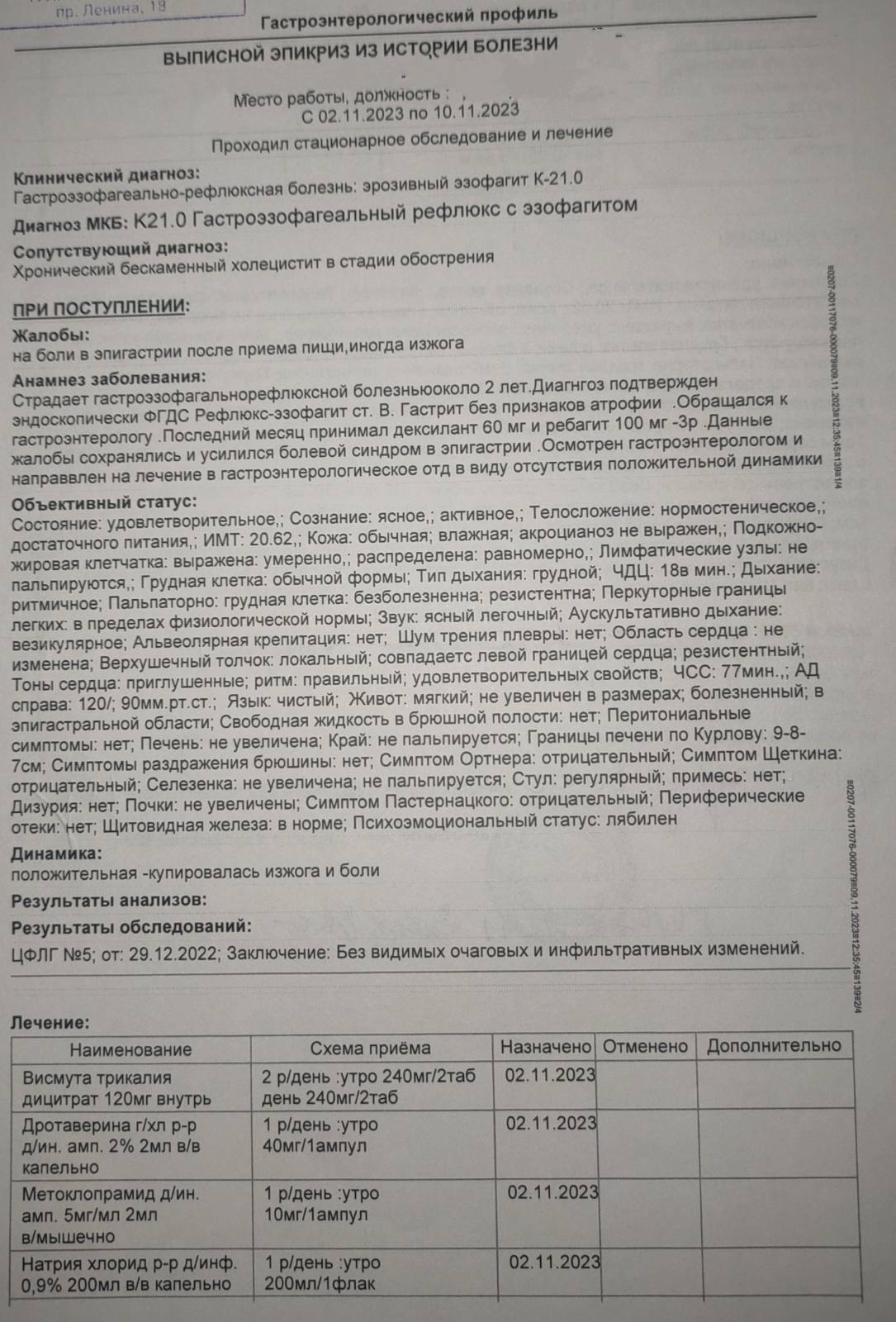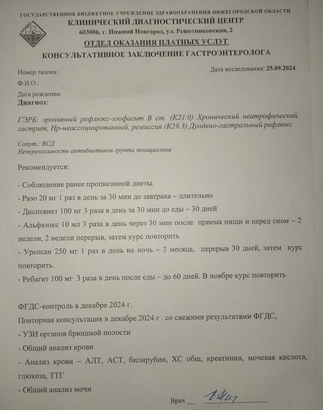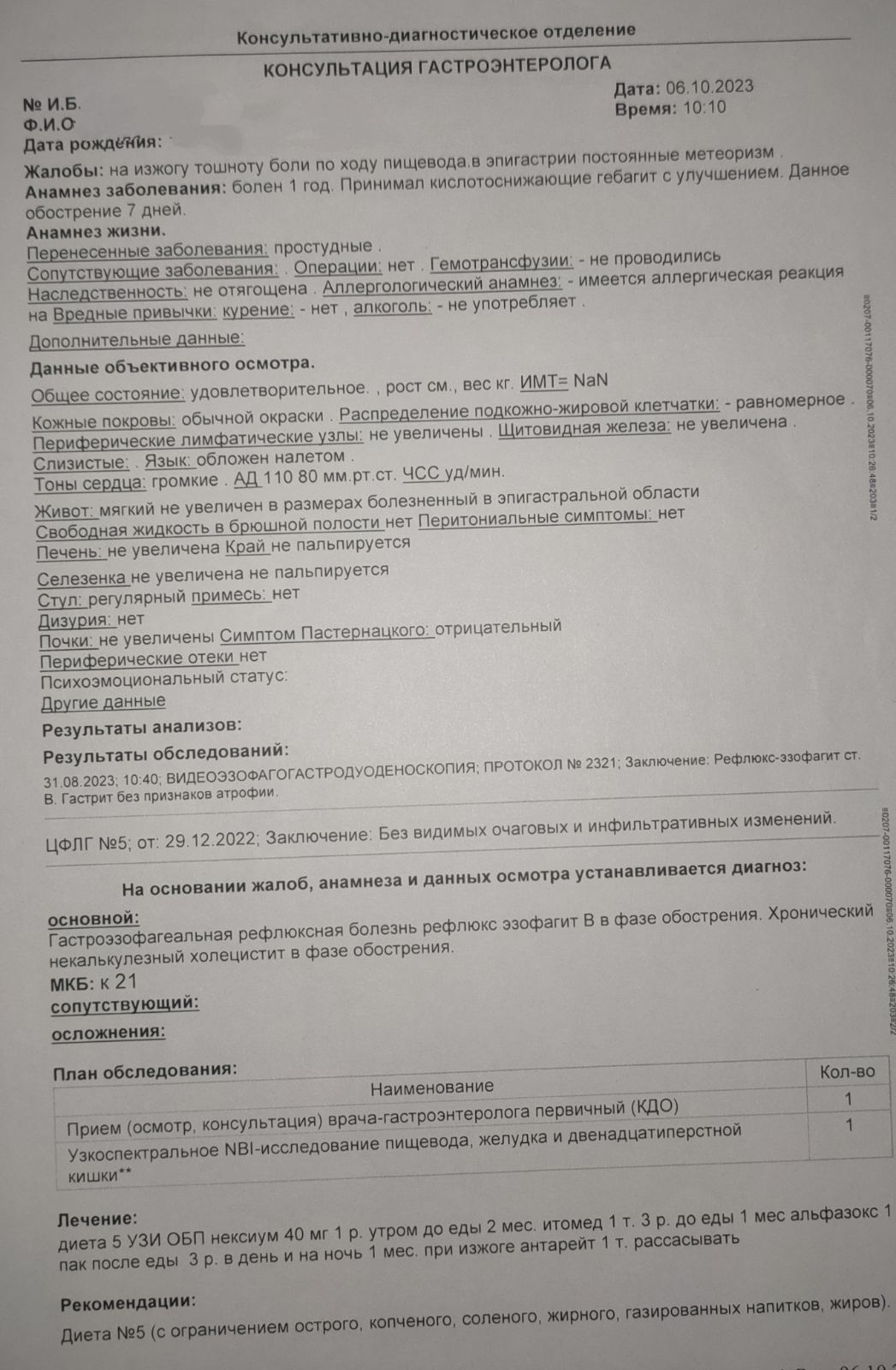 prizivniknn писал(а):Несколько лет меня беспокоили. В мае 2023 помэсле посещения гастроэнтеролога, был назначен ФГДС. Результаты показали рефлюкс-эзофагит 1-2 степени. Врач прописал курс лечения. После его завершения было проведено контрольное ФГДС, на нем были уже эрозии степени В. Гастроэнтеролог назначил новый курс. В ноябре 2023 года из-за постоянного чувства голода и болей в желудке был пройден курс стационарного лечения. В марте 2024 года было проведено ещё одно ФГДС, которое не выявило эрозий, и врач назначил поддерживающую терапию. 6 июля была проведена ЭГДС, на котором спустя 3,5 месяца вновь были выявлены эрозии степени В, вновь был назначен курс лечения . В сентябре я снова посетил врача из-за недостаточности текущего лечения , в виде изжоги и быстро наступающего чувства голода.