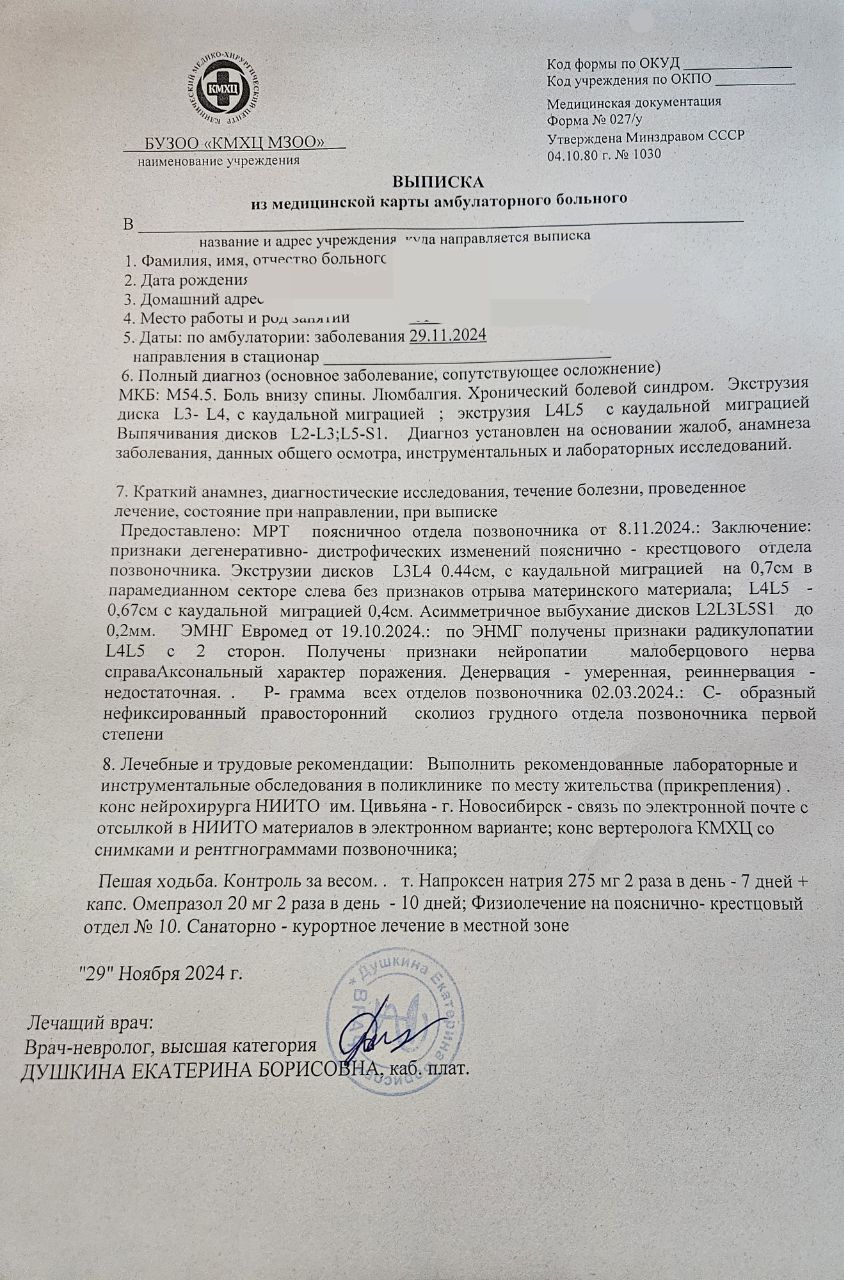 При этом по результатам ЭМНГ от 19.10.2024 были получены признаки радикулопатии L4-L5 с 2 сторон и нейропатии малоберцового нерва справа - если бы данные нарушения были указаны в формулировке диагноза, то вы бы смогли претендовать либо на непризывную категорию годности "Г" с предоставлением отсрочки до следующего призыва по статье 28 Расписания болезней, либо на непризывную категорию годности "В" по статье 26, пункту "в" Расписания болезней.